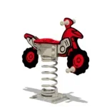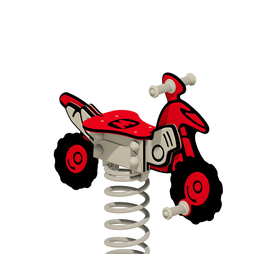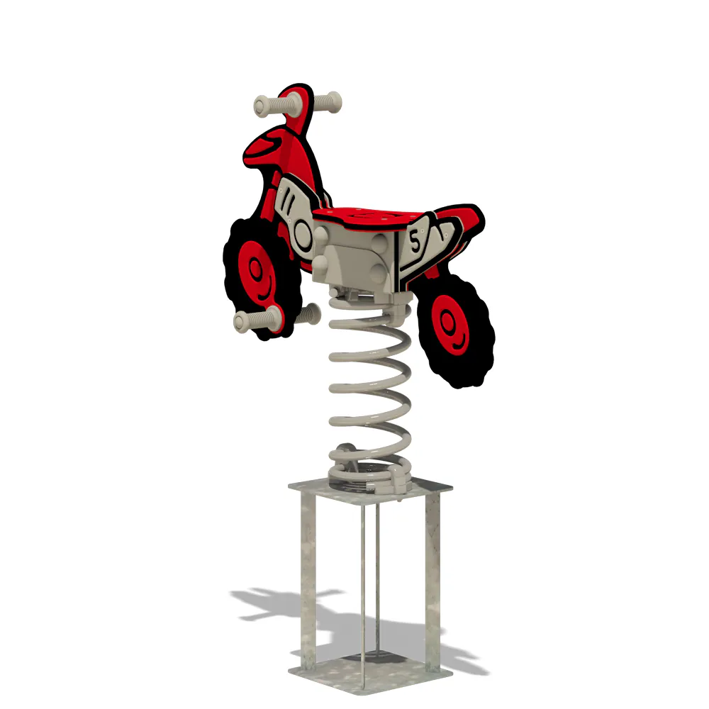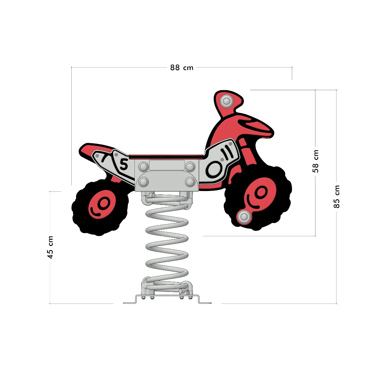 Zusätzlich sorgen die verstärkten Kunststoffe und Fußstützen mit Anti-Rutsch-Profil dafür, dass die kleinen Fahrer immer den nötigen Halt haben, während sie ihre Abenteuer erleben. Die Feder aus pulverbeschichtetem Stahl garantiert ein sicheres Wippen und ist mit einer feuerverzinkten Stahlverankerung ausgestattet, die eine einfache Installation durch Einbetonieren oder Verschrauben ermöglicht.