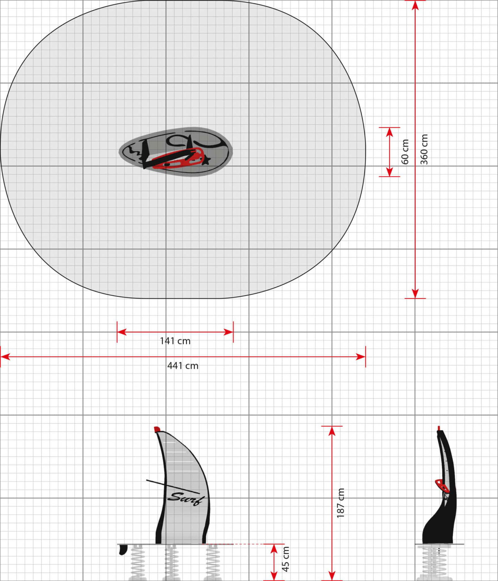 - Platzbedarf inkl. Sicherheitsabstände (LxB): 441 x 360 cm