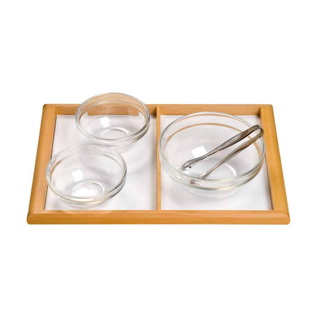 Das Set enthält eine robuste Spiel- und Sortierbasis aus Buche und MDF sowie zwei Glasschalen (Ø 10 cm), eine größere Glasschale (Ø 14 cm) und eine elegante Zuckerzange aus Edelstahl. Die Kombination dieser Elemente ermöglicht zahlreiche Übungsmöglichkeiten – sei es das Sortieren von kleinen Objekten, das Greifen und Platzieren oder das kreative Arrangieren von Materialien. Die praktischen Maße des Tabletts machen es zu einem flexiblen Begleiter, der leicht transportiert und problemlos in verschiedene Lernumgebungen integriert werden kann.