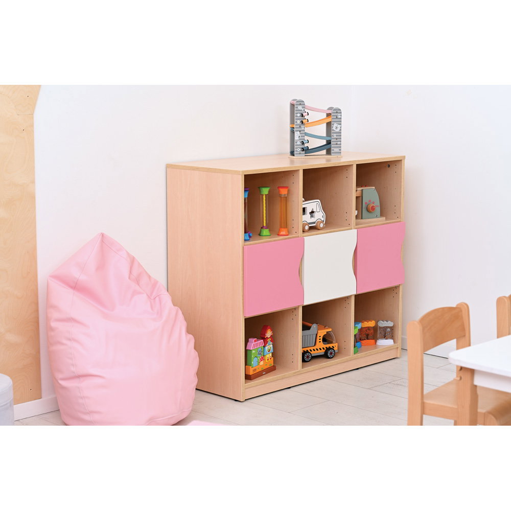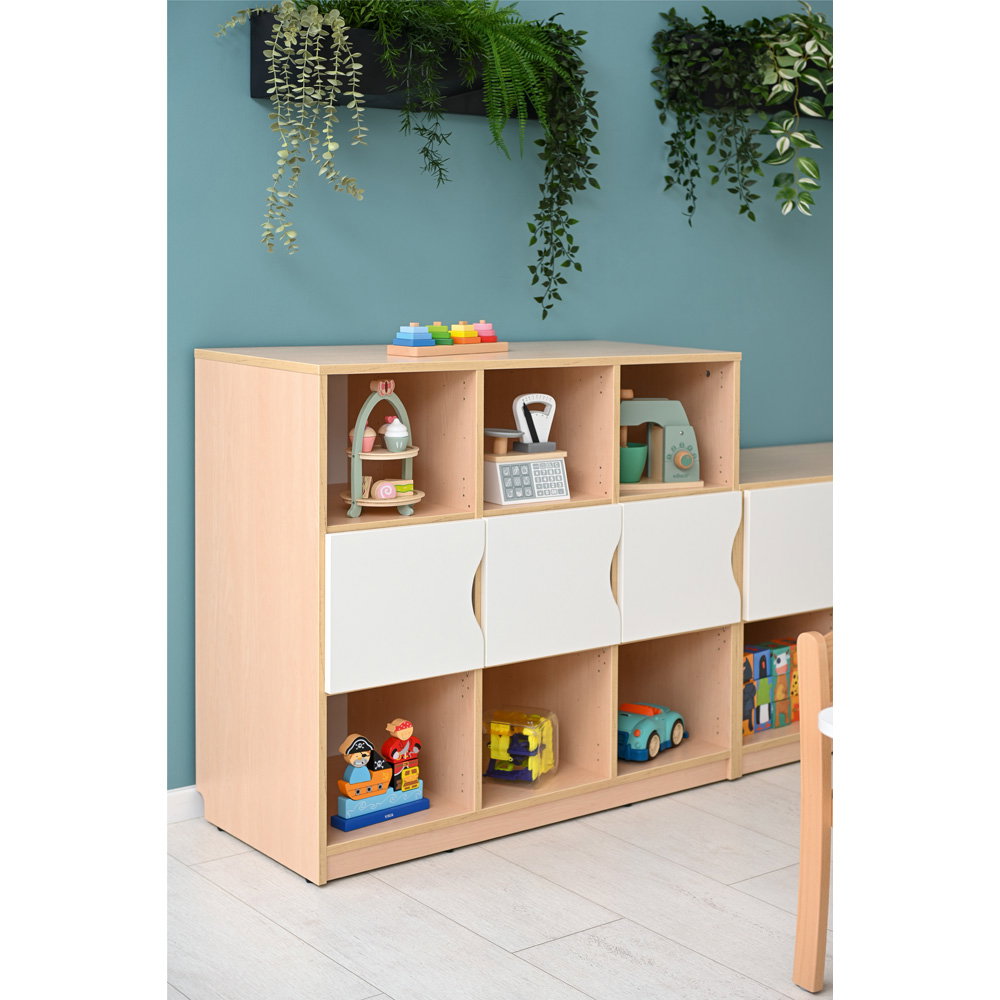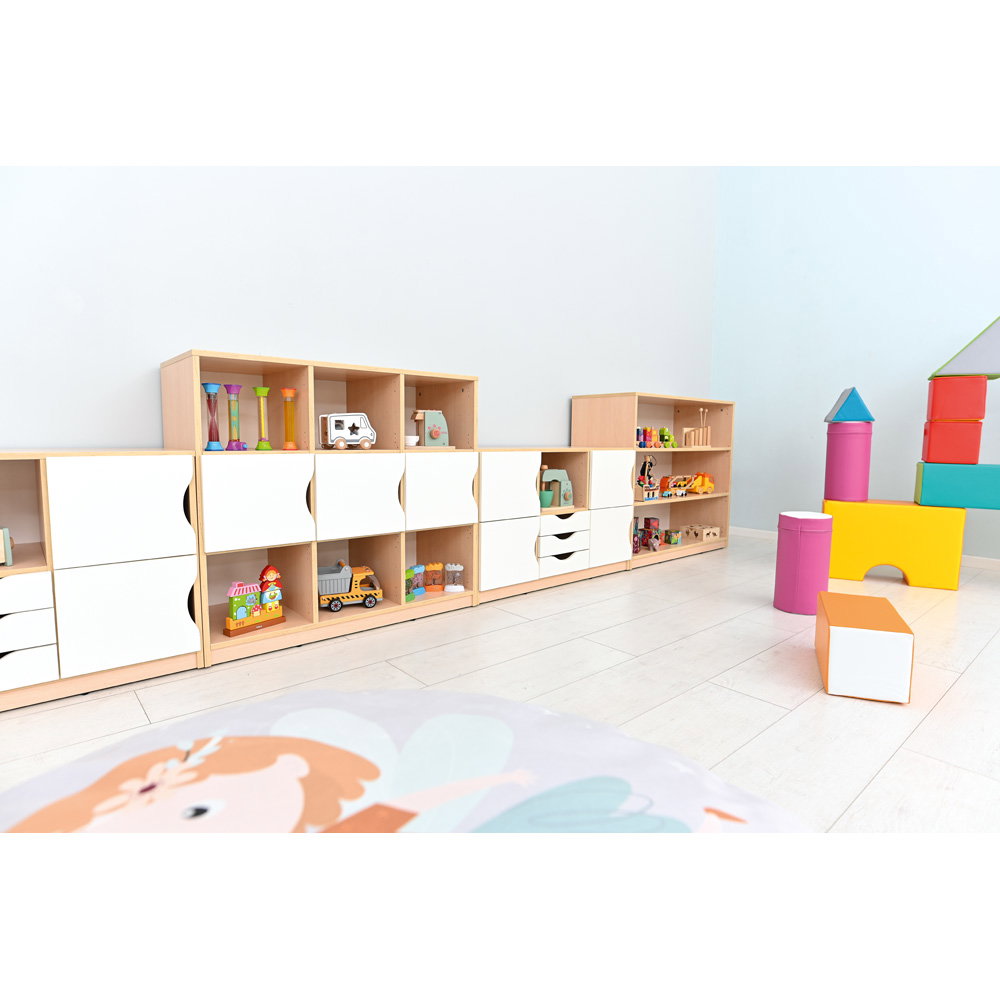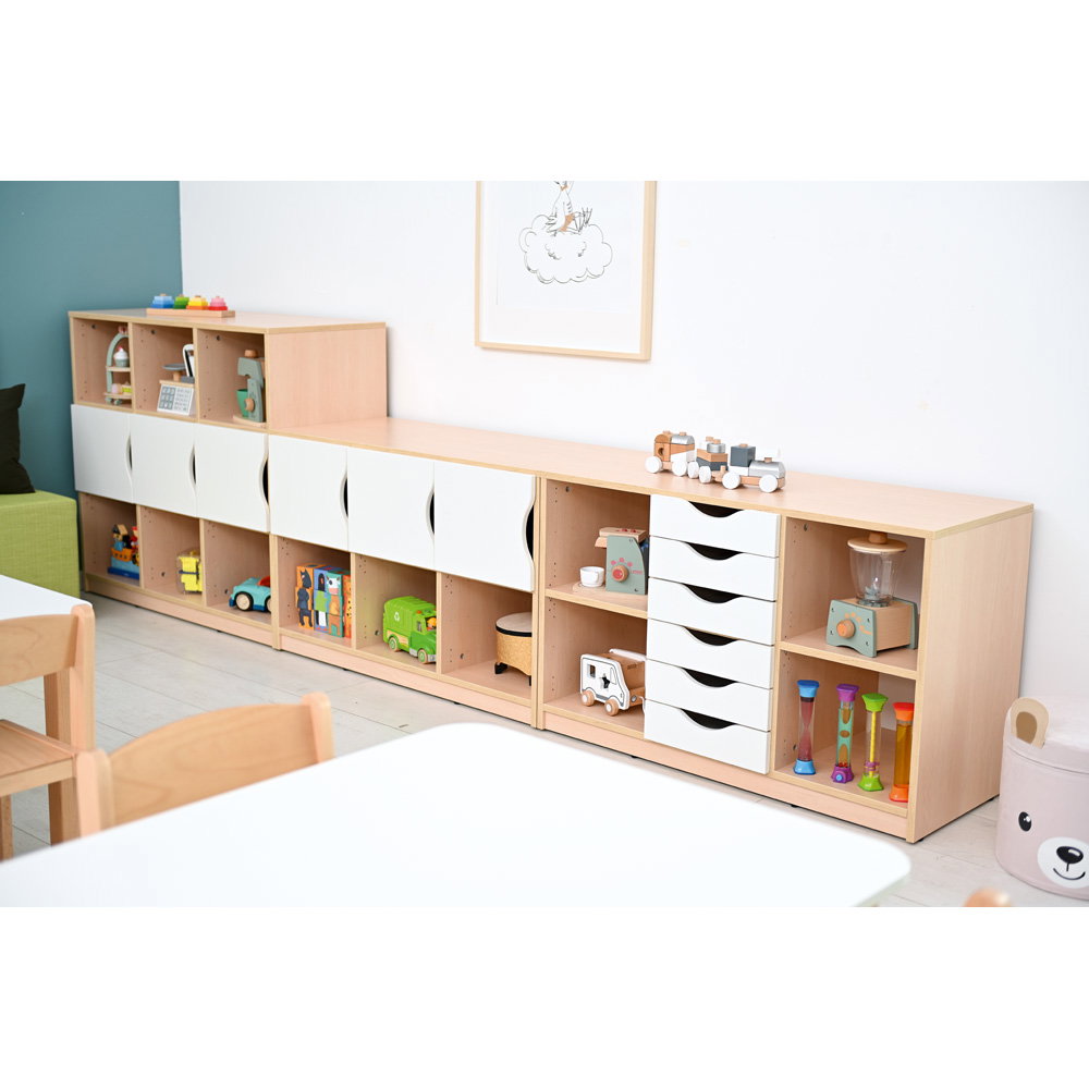 Ausgestattet mit Schubladen oder kleinen Türen eignet sich das Regal hervorragend als Eigentumsschrank. Jedes Kind erhält sein eigenes, festes Fach für Wechselkleidung, selbstgemalte Bilder oder kleine Schätze. Dies hilft den Kindern, Verantwortung für ihre eigenen Dinge zu übernehmen.