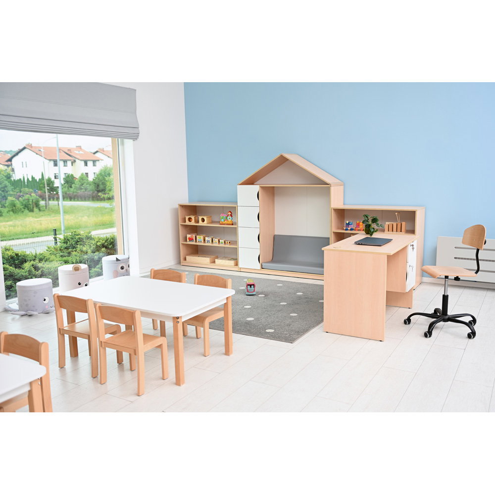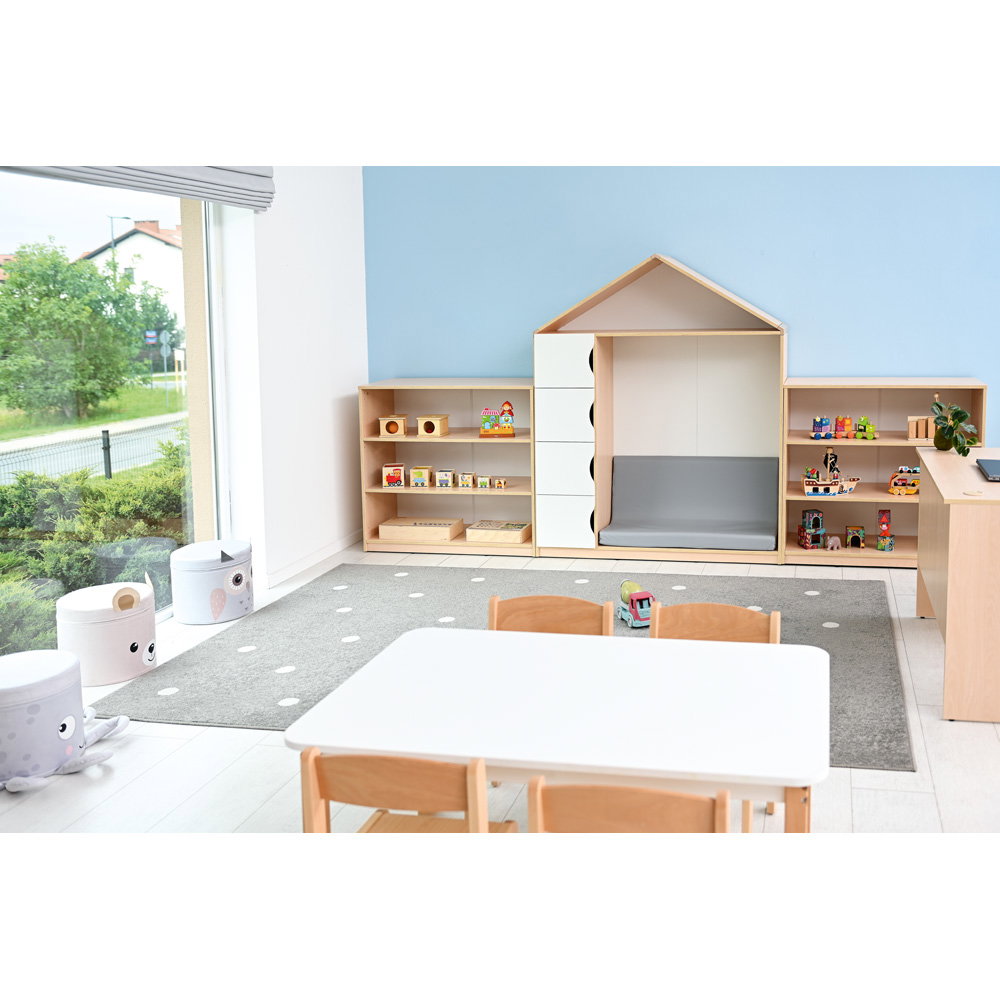 Mit einer Höhe von 95 Zentimetern befindet sich der gesamte Inhalt des Regals auf einer angenehmen Höhe für jüngere Kinder. Dies ermutigt sie dazu, sich benötigte Materialien selbst zu holen und nach dem Spielen wieder ordentlich an ihren Platz zurückzulegen. Das Regal fügt sich unaufdringlich in den Raum ein, ohne diesen optisch zu erdrücken. - Maßgeschneiderter Platz für große Formate