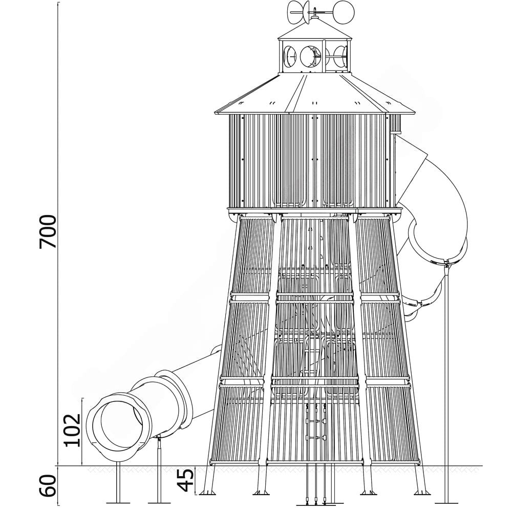 Der Ferrum Leuchtturm wurde aus verzinktem Stahlrohr (Ø 114 mm) gefertigt, das dank der Pulverbeschichtung mit Polyesterfarbe witterungsbeständig ist. Die Podeste verfügen über eine trittsichere Oberfläche und sind an einem stabilen Stahlrahmen befestigt. Alle Befestigungselemente sind aus Edelstahl, während die Seile mit einem Stahlkern verstärkt sind – für sicheren und sorglosen Spielspaß!