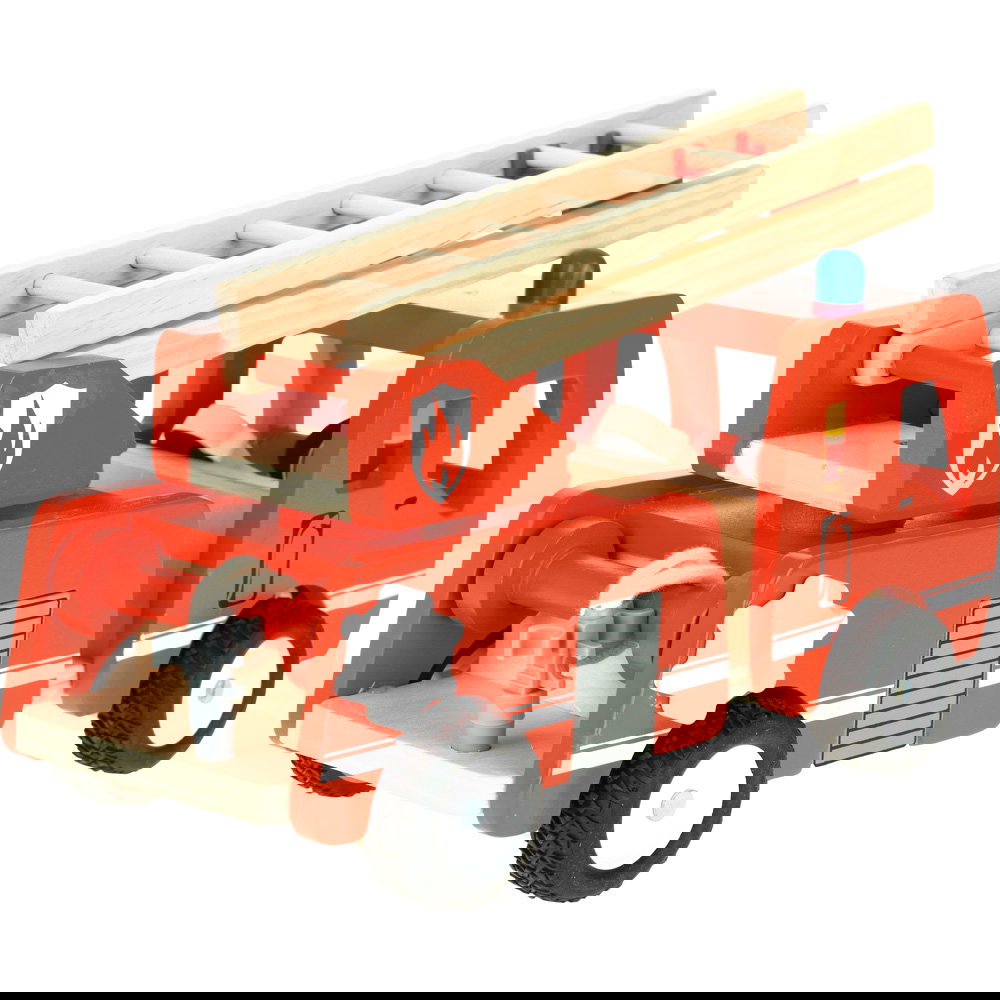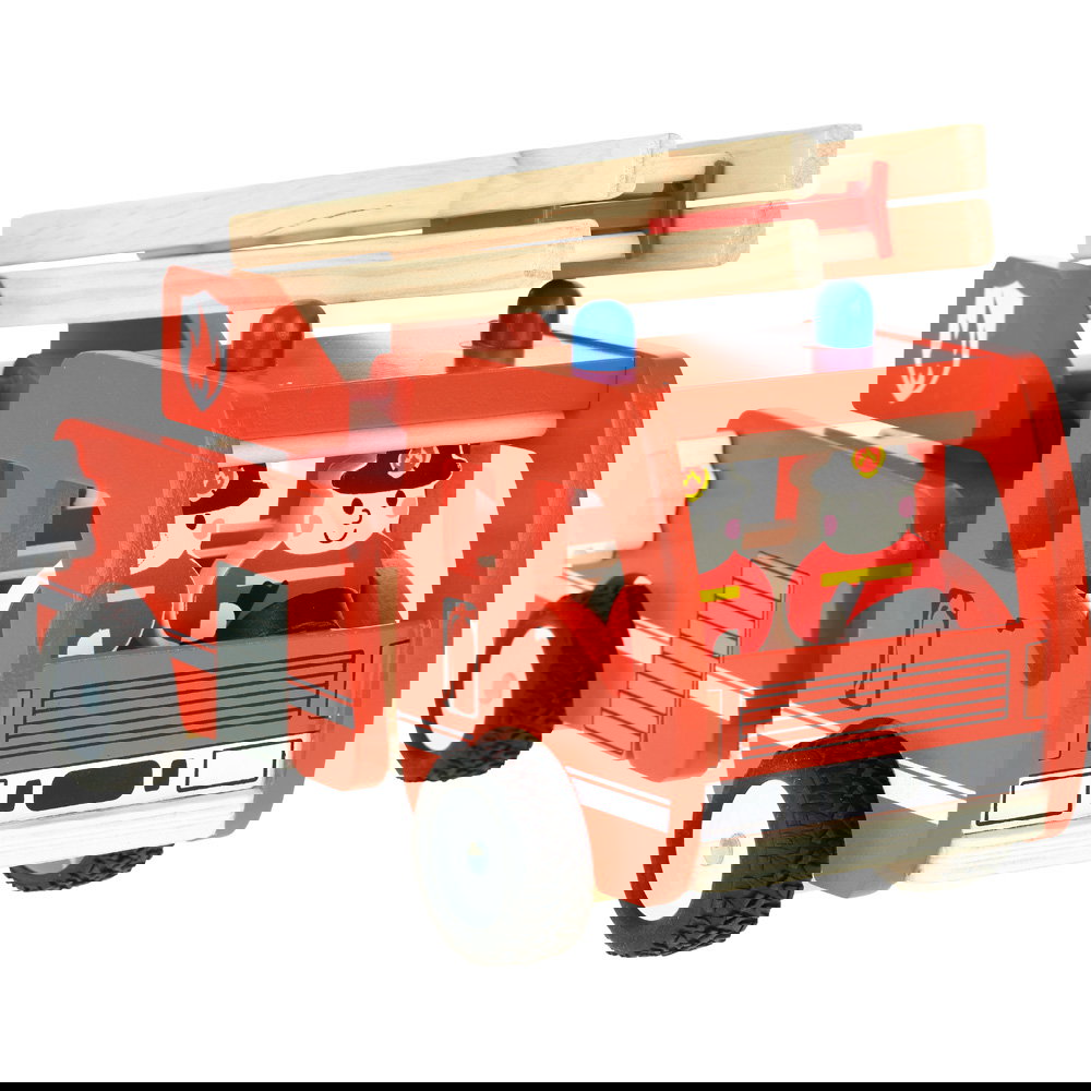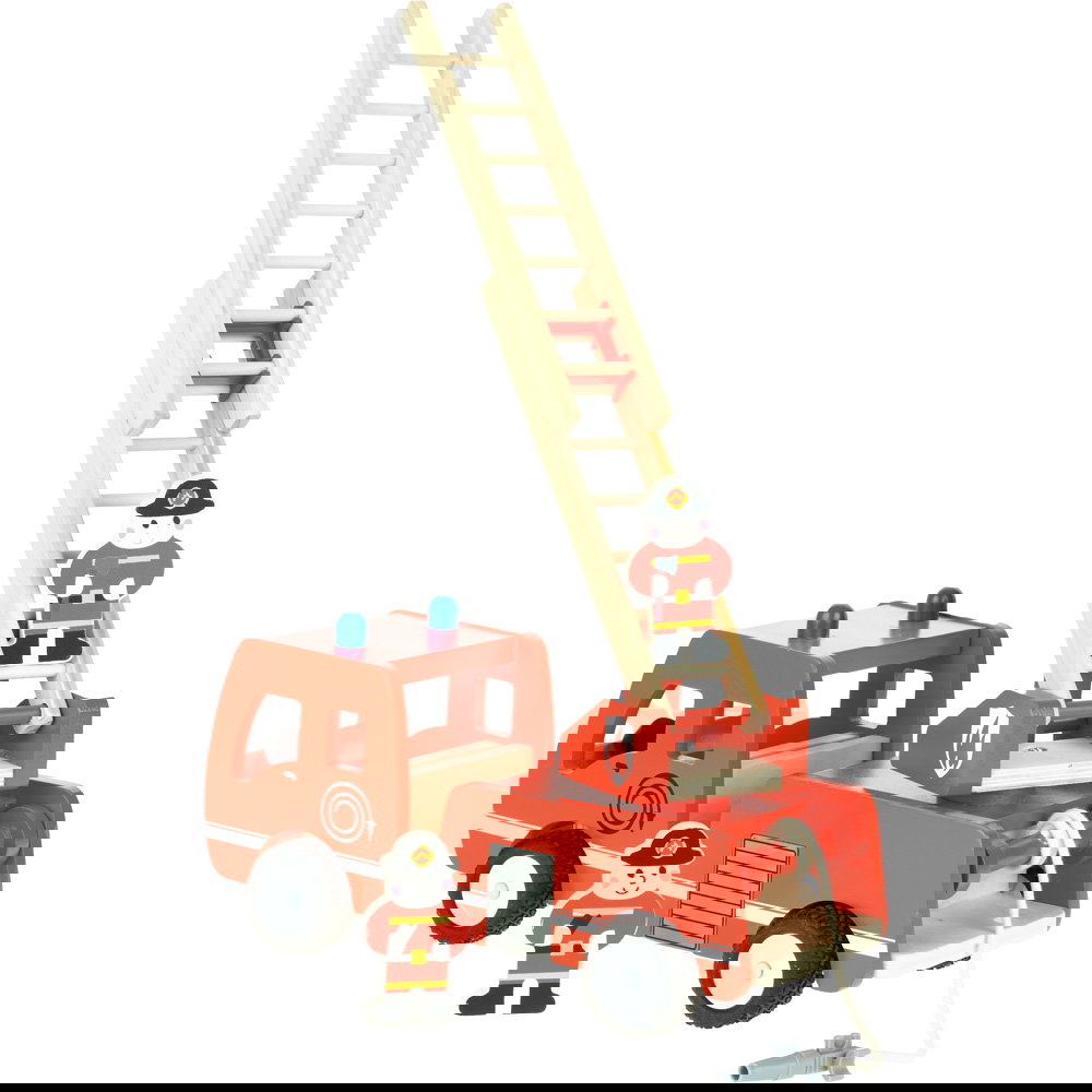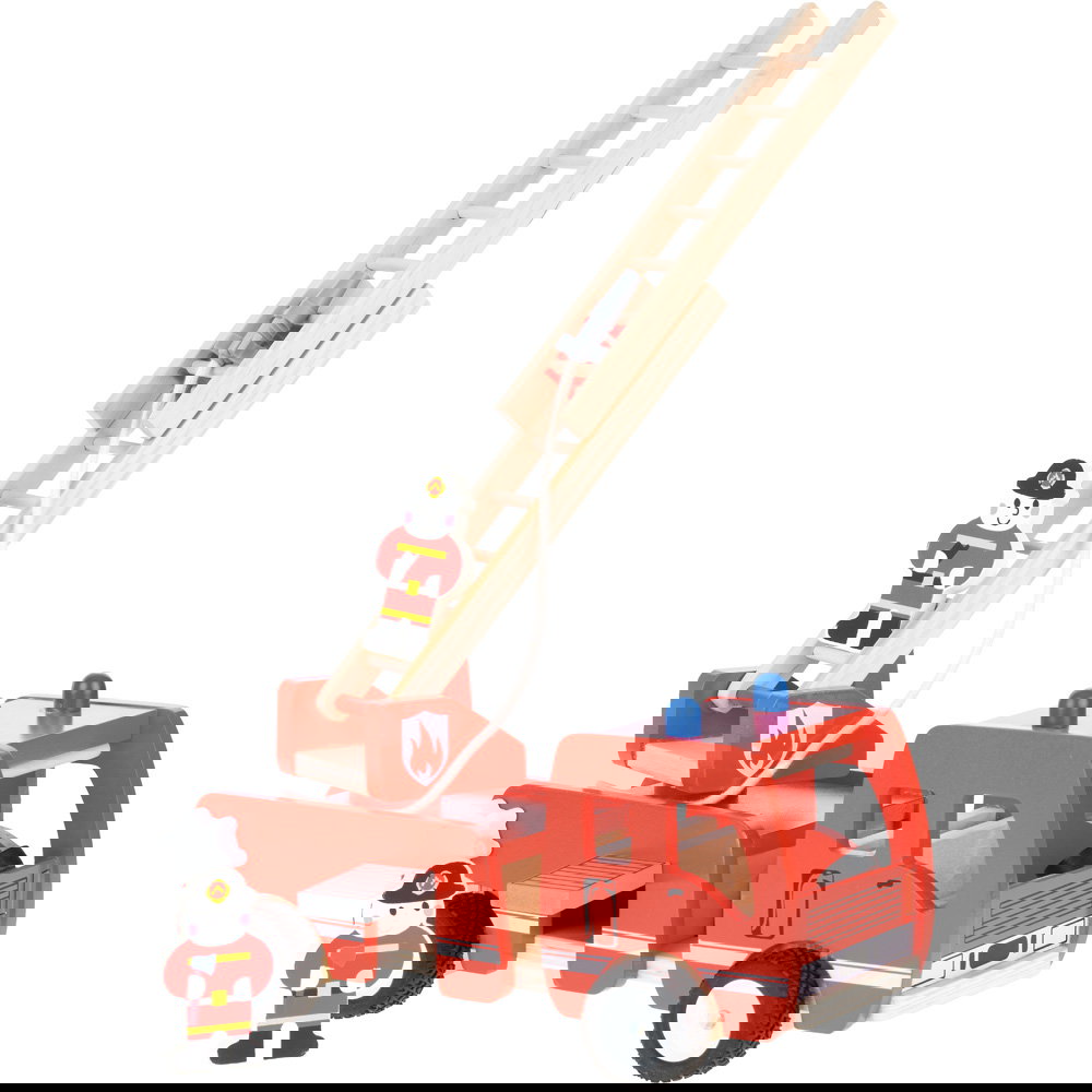 Entdecken Sie das Feuerwehrauto aus Holz mit ausfahrbarer Leiter, 2 Figuren und leisen Gummirädern. Fördert Motorik und Fantasie. Ideal für Kinder ab 3 Jahren.