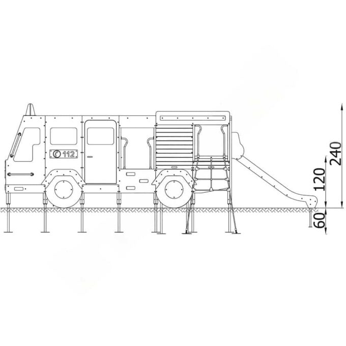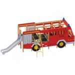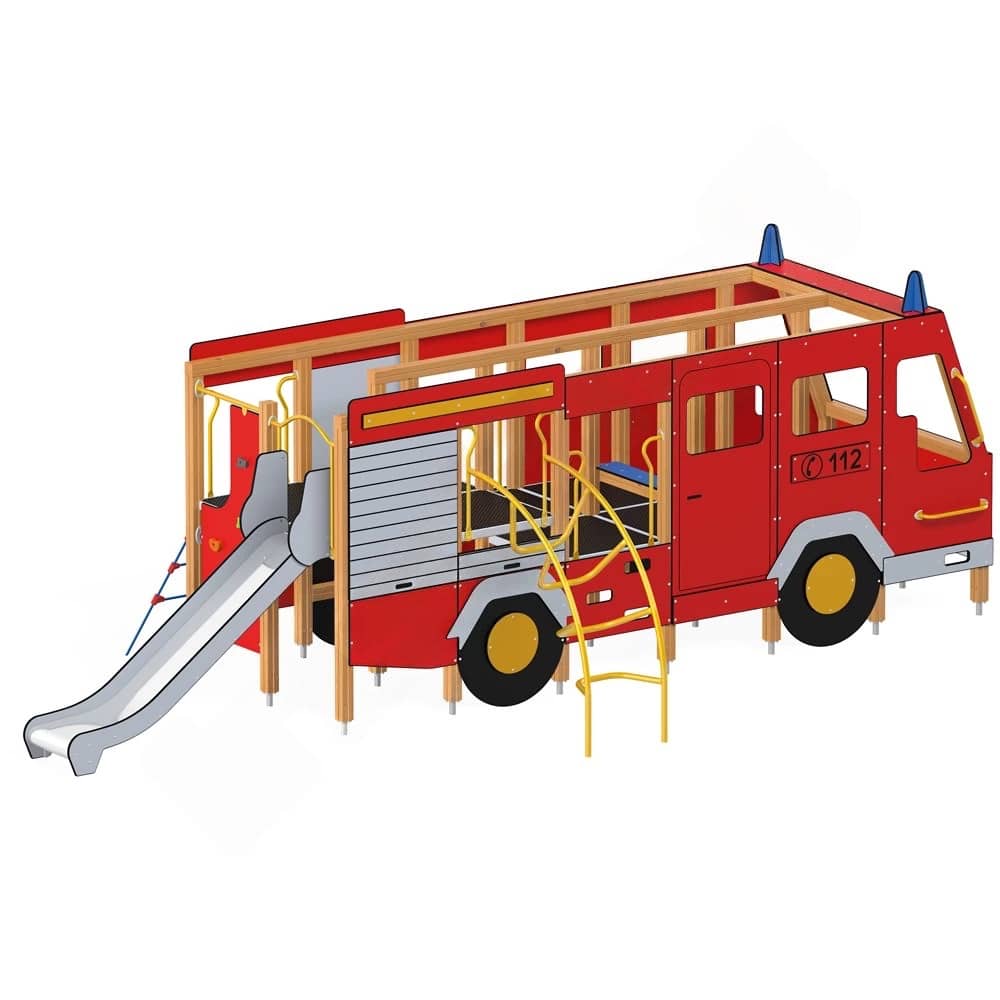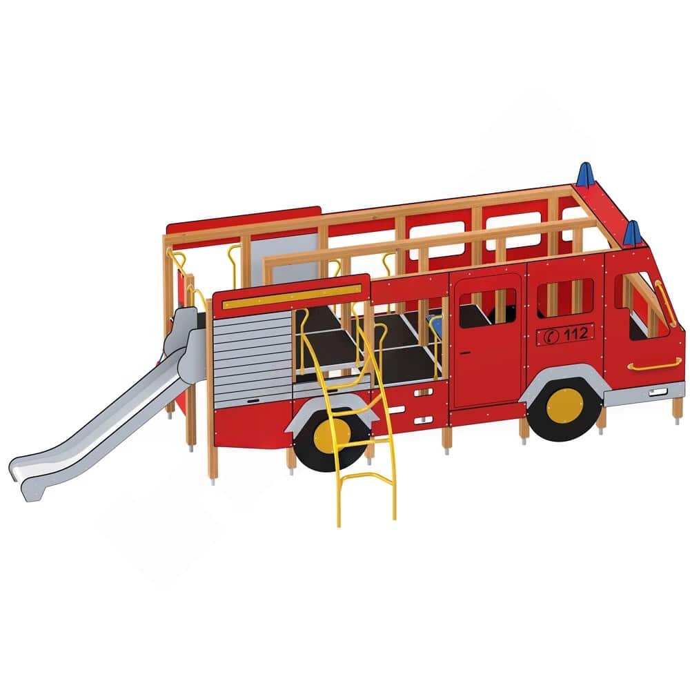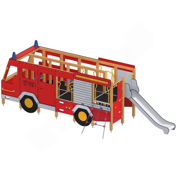 Tatü Tata, die Feuerwehr ist zur Stelle! In diesem beeindruckenden Spielgerät finden bis zu 28 Kinder Platz, um schnell und sicher zum nächsten Einsatzort zu gelangen. Die Bogenleiter, das Kletternetz und die Kletterwand bieten zahlreiche Möglichkeiten, Geschicklichkeit und Mut zu trainieren. Mit einem Rutschvergnügen über die lange Rutsche nehmen die Feuerwehrleute ordentlich Fahrt auf, bevor sie in die nächsten Abenteuer entschwinden.
