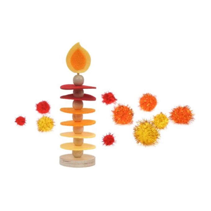 Die Kombination aus farbigen Filzscheiben und hochwertigen Holzkugeln sorgt für eine natürliche und zugleich kreative Optik. Die einzelnen Teile werden ganz einfach auf einen stabilen Holzstab aufgereiht und auf die Basis gesteckt – eine schnelle und einfache Bastellösung, die auch für Bastelanfänger geeignet ist. Zum krönenden Abschluss werden die liebevoll gestalteten Flammen angebracht, die der Kerze ihren warmen Charakter verleihen. Egal, ob alleine oder mit der Familie – dieses Bastelset bietet Bastelspaß für Groß und Klein.