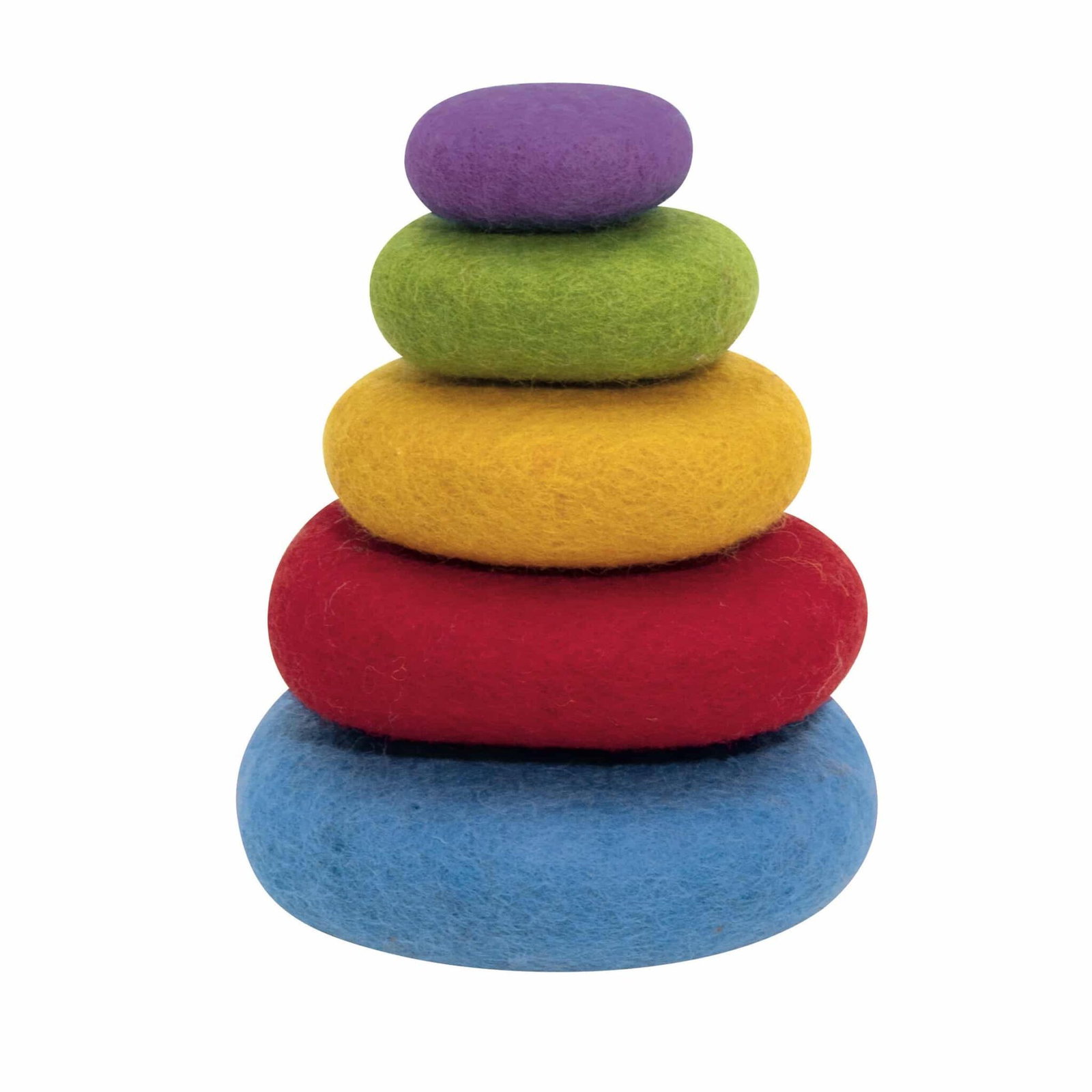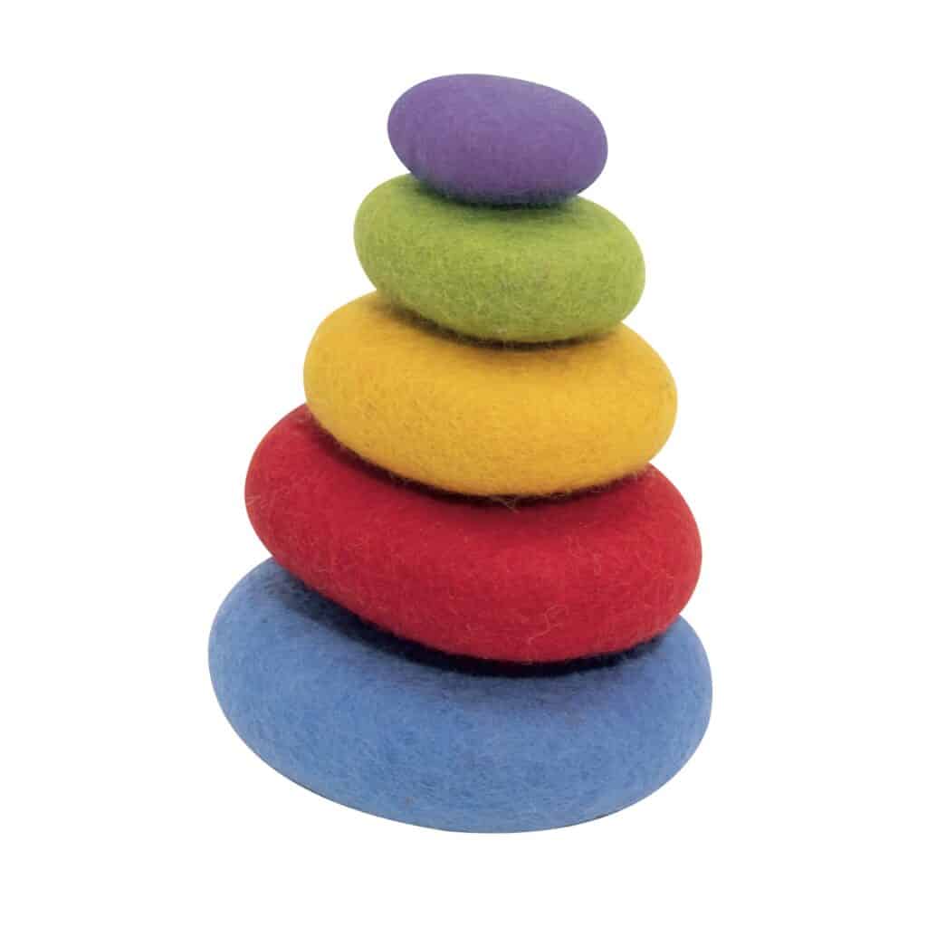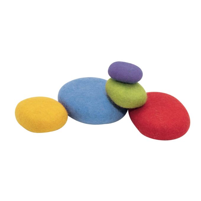 Die Filz Regenbogen Steine sind ein handgefertigtes Spielzeug, das kreatives Spielen, Farbenlernen und motorische Fähigkeiten vereint. Durch die traditionelle Nassfilztechnik sorgfältig hergestellt, zeichnen sich die fünf weichen Steine durch ihre leuchtenden Regenbogenfarben, die angenehme Haptik und ihre umweltfreundliche Herstellung aus. Diese langlebigen und vielseitig einsetzbaren Filzsteine werden schnell zum Lieblingsspielzeug für Kinder ab 36 Monaten, die sie stapeln, sortieren oder in fantasievollen Spielen nutzen können.