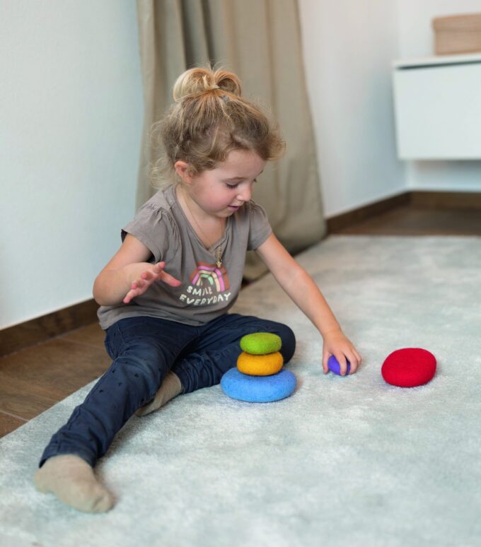 - Dekoratives Design: Die harmonischen Regenbogenfarben und die natürliche Filzstruktur machen die Steine auch zu einer stilvollen Ergänzung im Kinderzimmer.