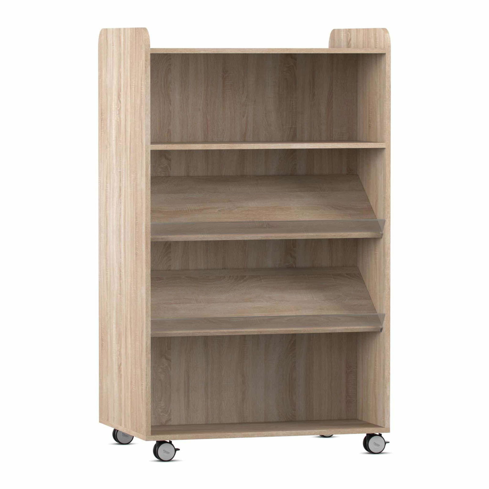 - Optimale Mischung aus Präsentation und Lagerung: Dieses Modell bietet die perfekte Balance. Auf jeder Seite finden Sie zwei Schrägablagen, die Buchtitel, Zeitschriften oder Themenhefte ansprechend mit dem Cover nach vorne präsentieren. Ein zusätzlicher gerader Fachboden pro Seite bietet soliden Stauraum für Ordner, schwere Bücherstapel oder große Spieleboxen. Diese Kombination macht den Wagen unglaublich vielseitig.