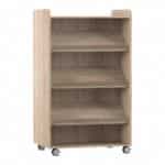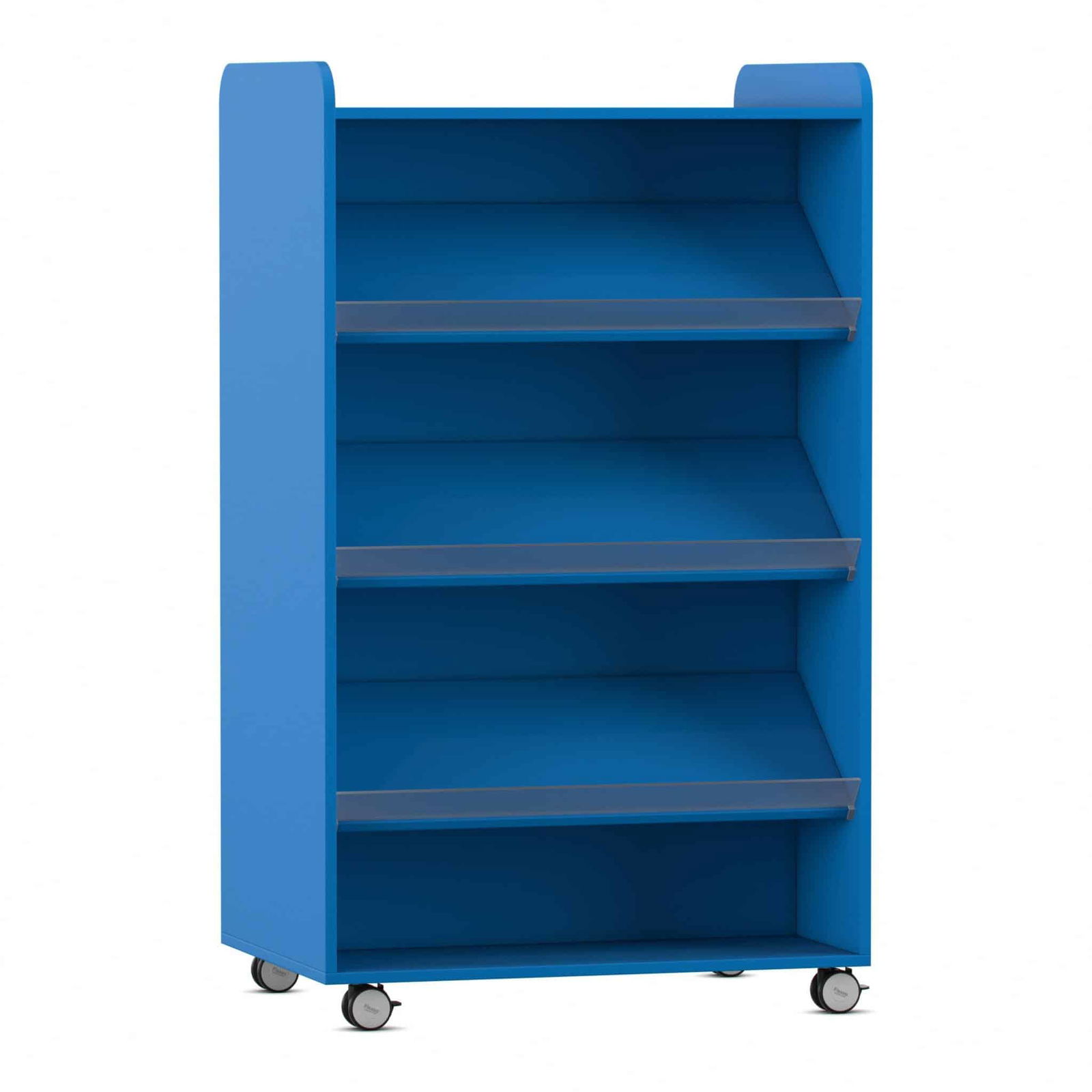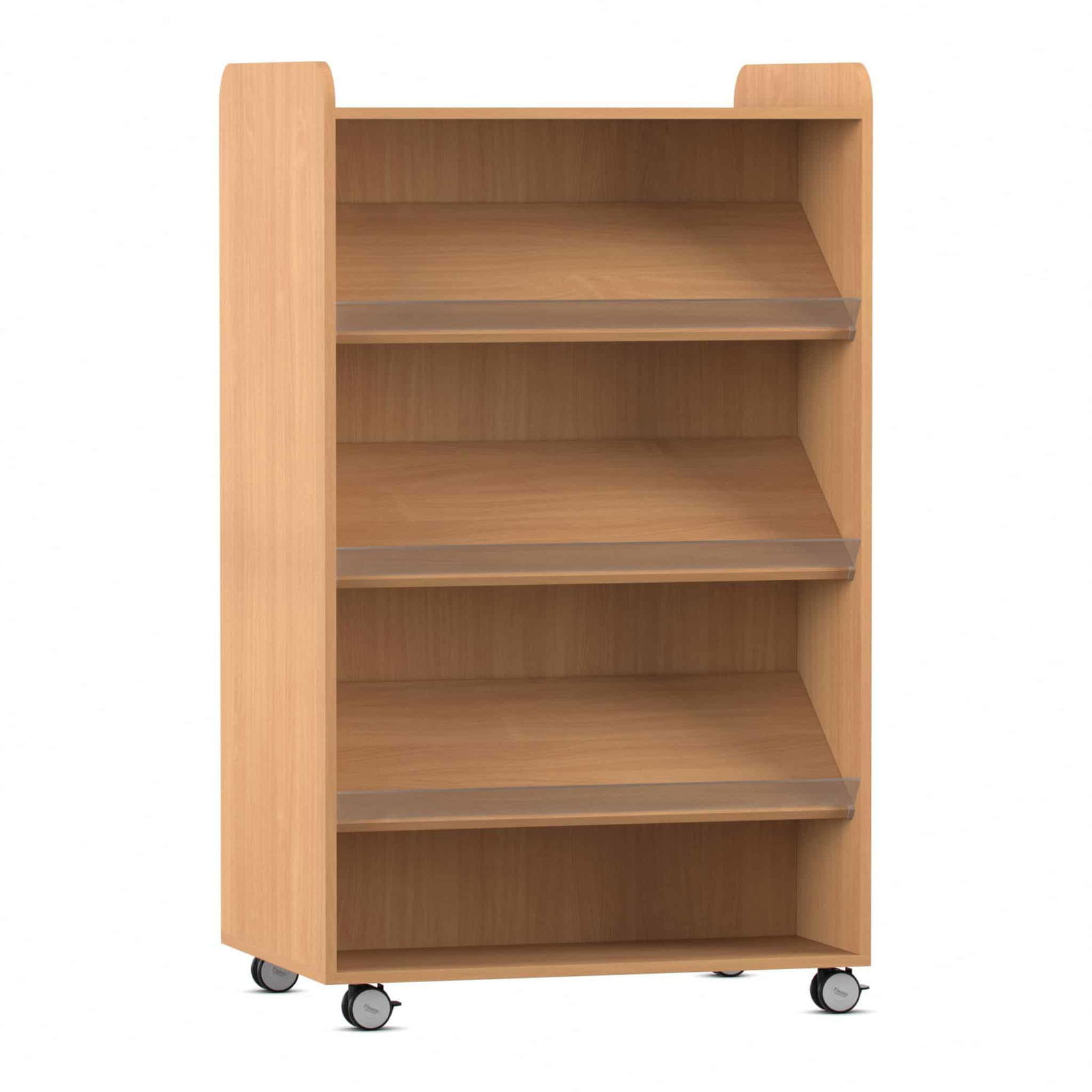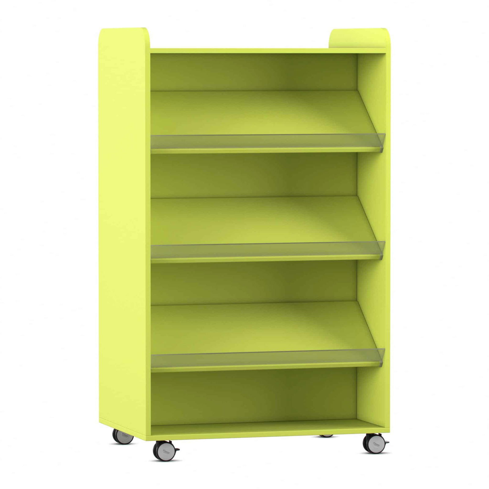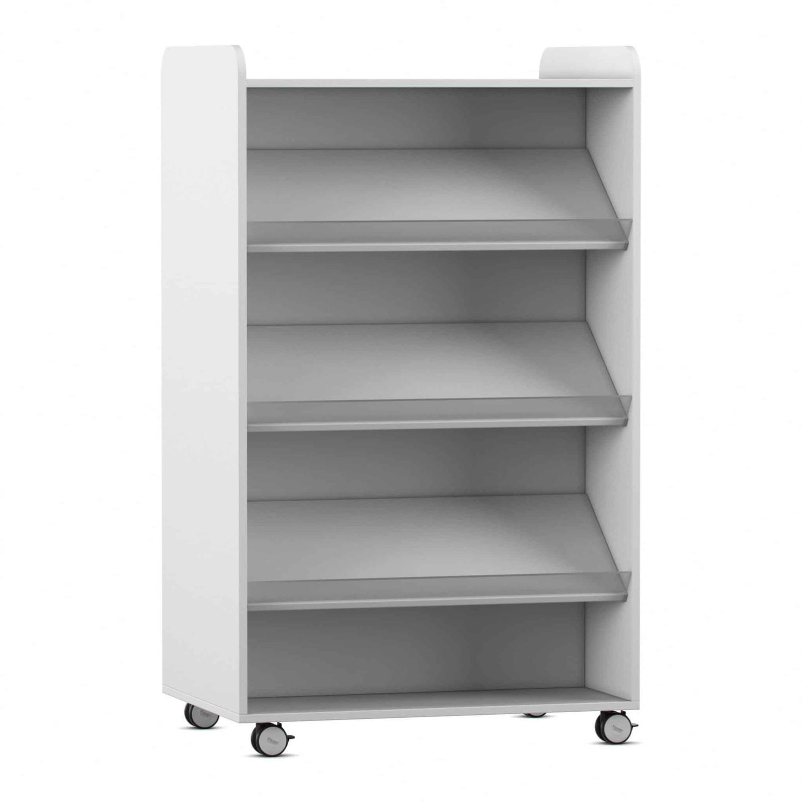 - Doppelseitige Nutzung für maximale Effizienz: Der Wagen ist von beiden Seiten identisch aufgebaut und zugänglich. Jede Seite verfügt über drei Schrägablagen, die Bücher frontal präsentieren und zum Zugreifen einladen. Diese symmetrische Konstruktion verdoppelt nicht nur die nutzbare Fläche, sondern macht den Wagen auch zum idealen, freistehenden Raumteiler, der Bereiche strukturiert, ohne den Raum optisch zu verschließen.