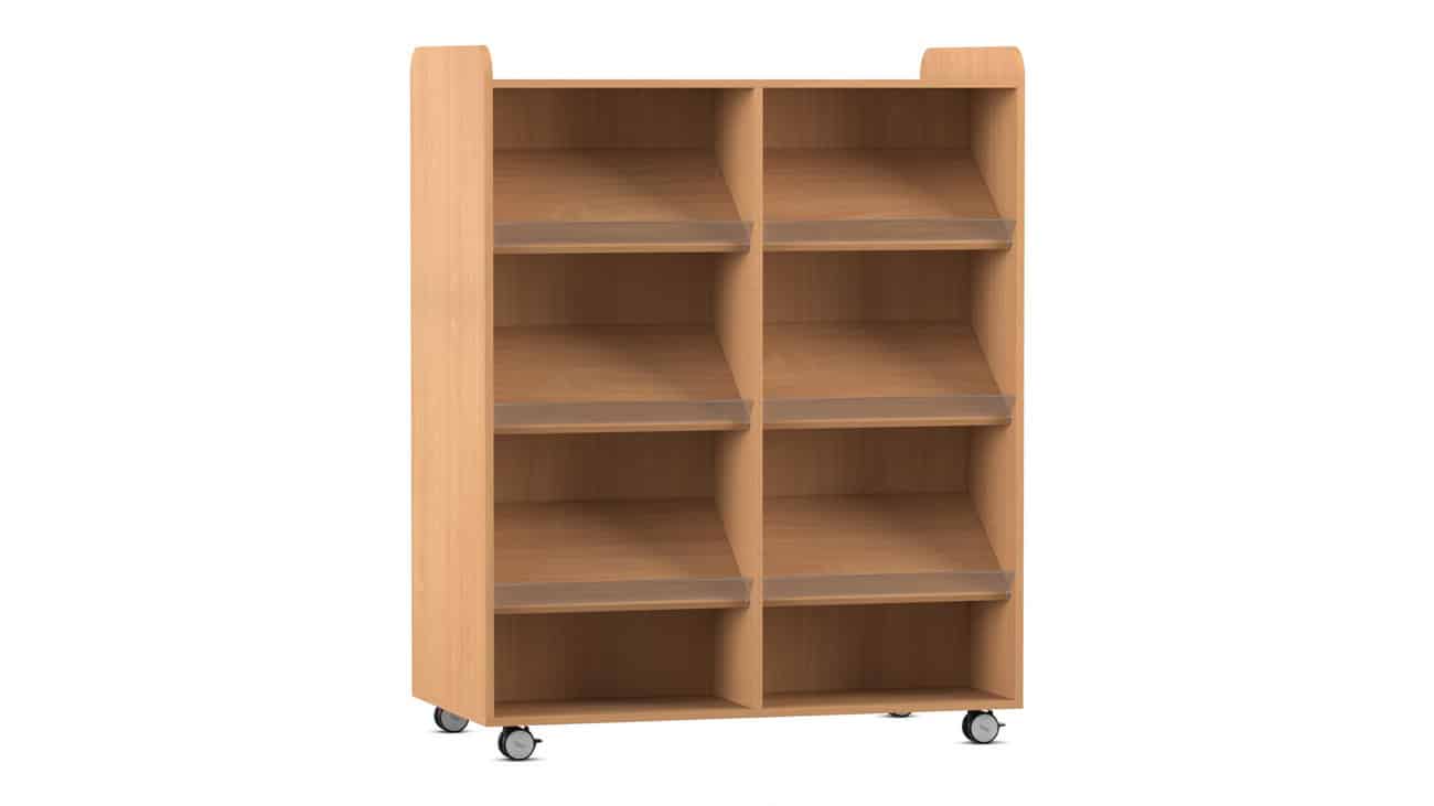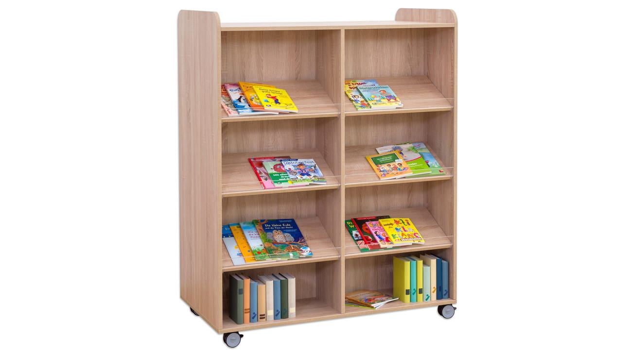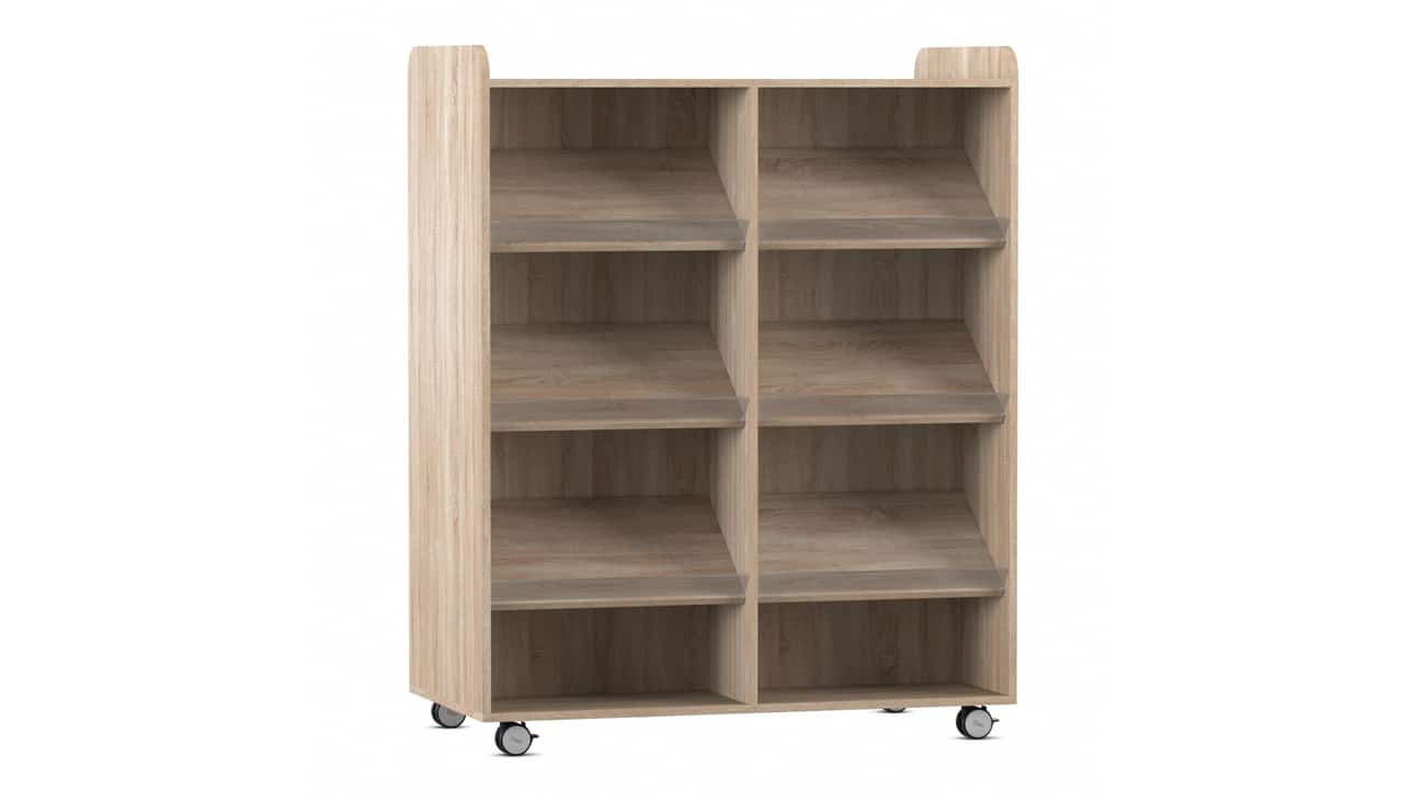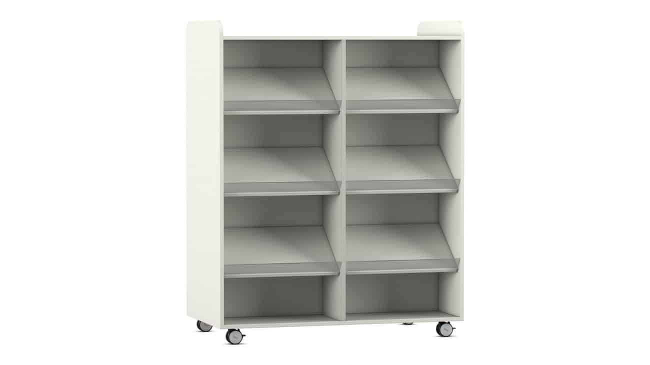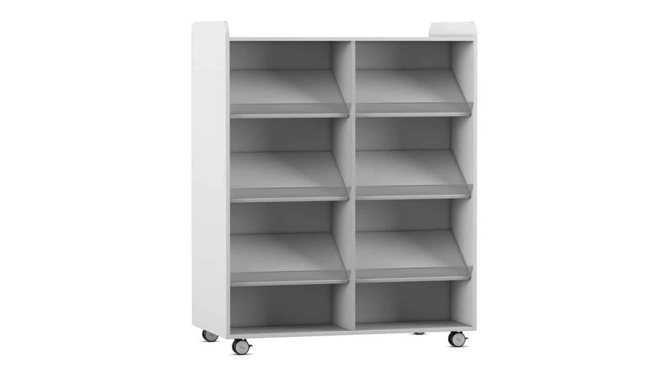 Der Flexeo Bücherwagen bietet auf der Vorder- und Rückseite jeweils 6 Schrägablagen, die beidseitig nutzbar sind. So können Sie den Wagen effizient als Raumteiler einsetzen und gleichzeitig den Zugriff auf Ihre Bücher von beiden Seiten ermöglichen. Die individuell höhenverstellbaren Fachböden und Schrägablagen sorgen dafür, dass immer die optimale Höhe für Ihre Materialien gegeben ist.