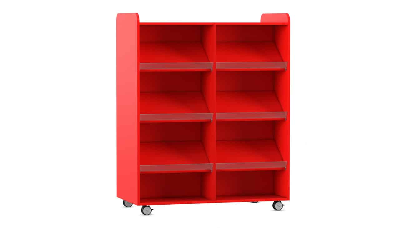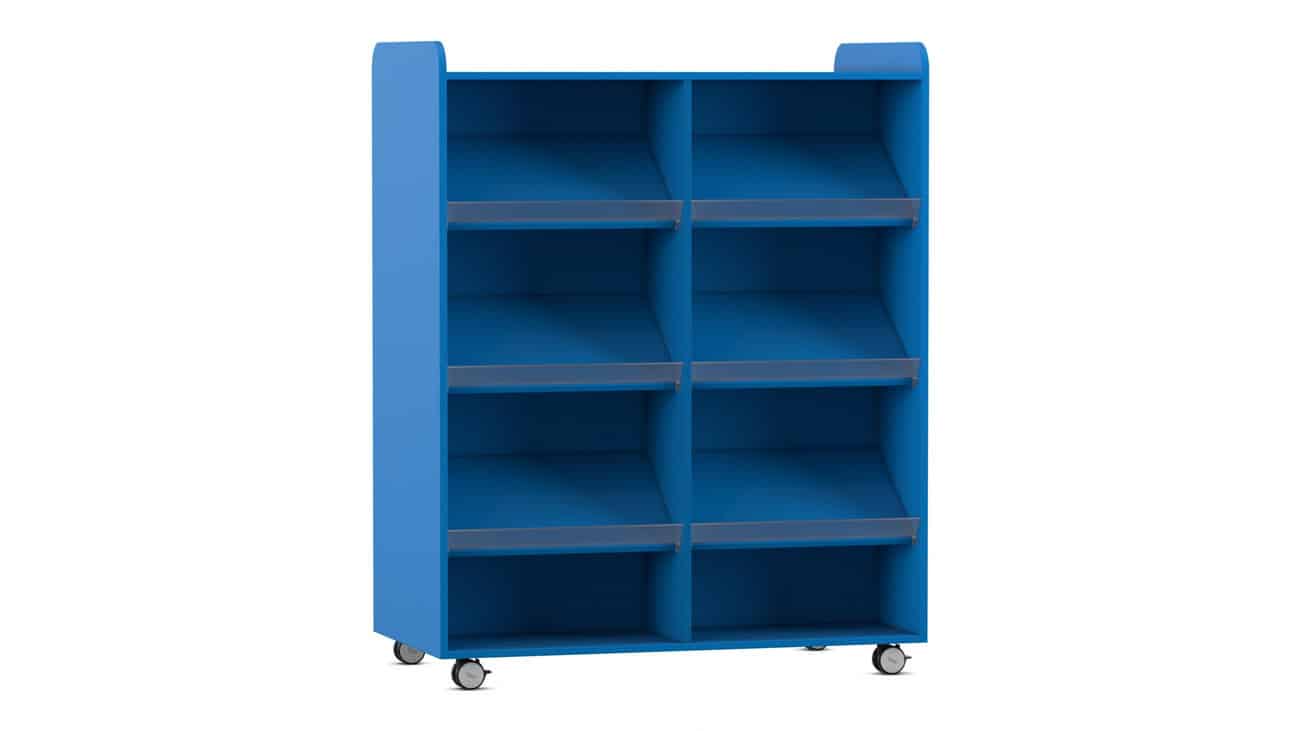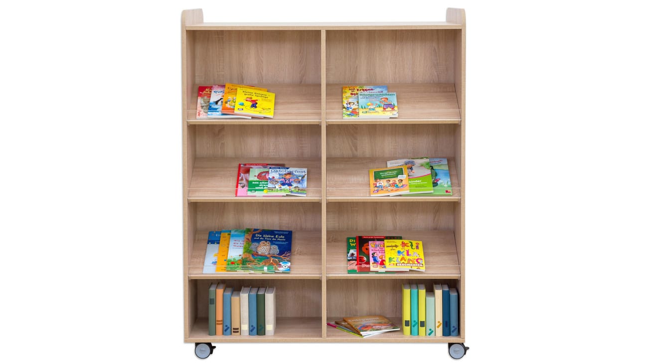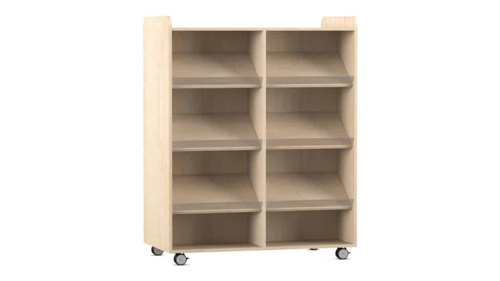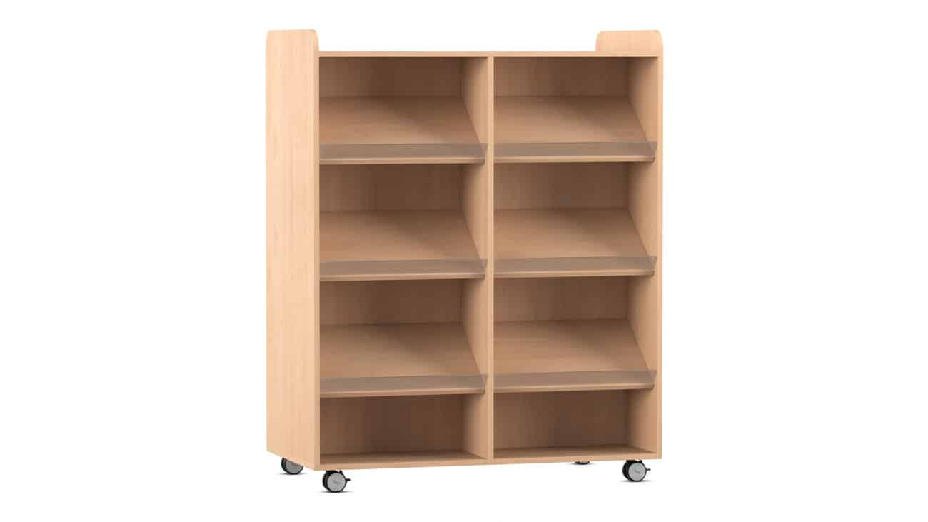 Der Flexeo Bücherwagen bietet auf der Vorder- und Rückseite jeweils 6 Schrägablagen, die beidseitig nutzbar sind. So können Sie den Wagen effizient als Raumteiler einsetzen und gleichzeitig den Zugriff auf Ihre Bücher von beiden Seiten ermöglichen. Die individuell höhenverstellbaren Fachböden und Schrägablagen sorgen dafür, dass immer die optimale Höhe für Ihre Materialien gegeben ist.
