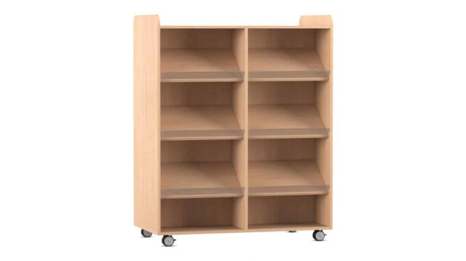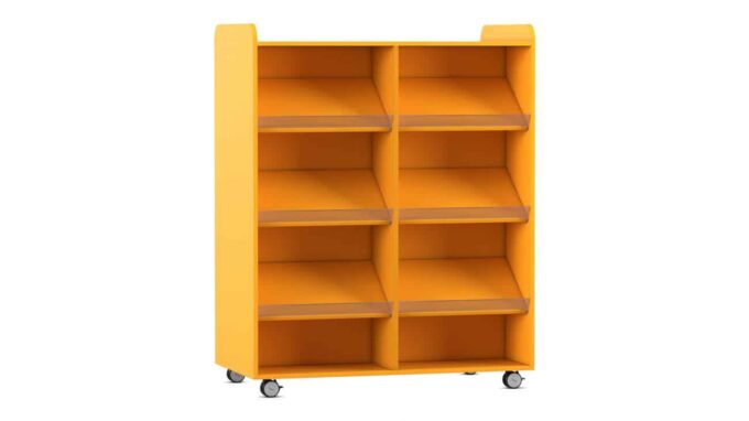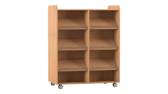 Der Flexeo Bücherwagen bietet auf der Vorder- und Rückseite jeweils 6 Schrägablagen, die beidseitig nutzbar sind. So können Sie den Wagen effizient als Raumteiler einsetzen und gleichzeitig den Zugriff auf Ihre Bücher von beiden Seiten ermöglichen. Die individuell höhenverstellbaren Fachböden und Schrägablagen sorgen dafür, dass immer die optimale Höhe für Ihre Materialien gegeben ist.
