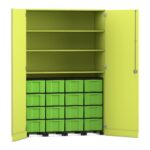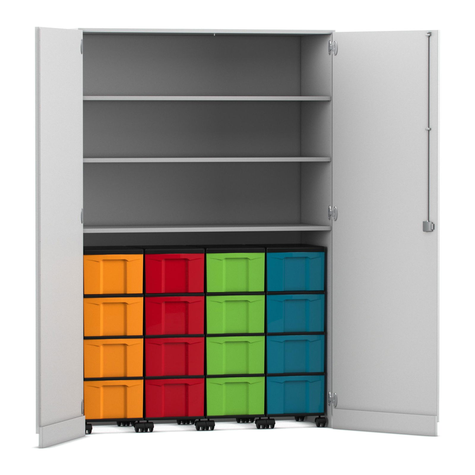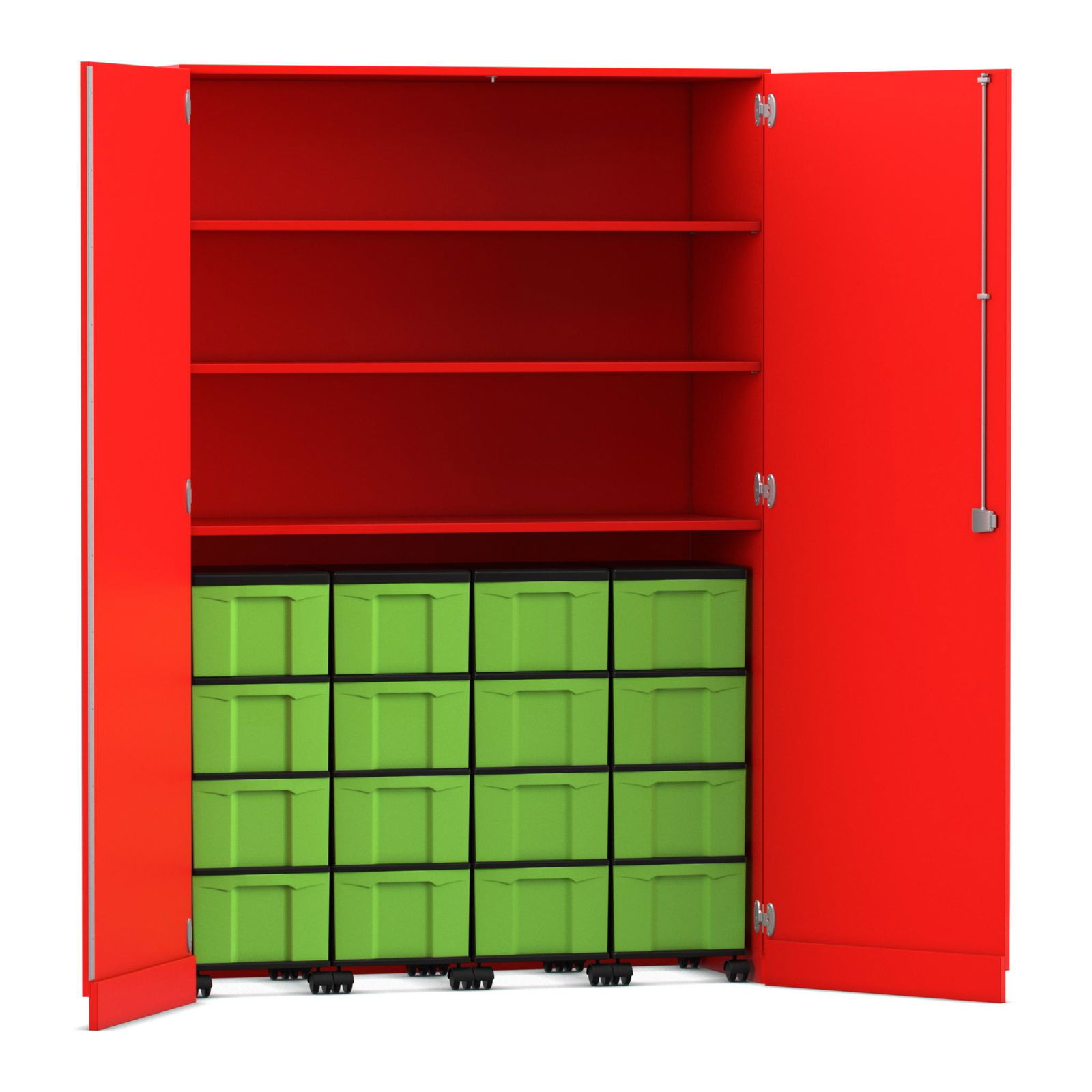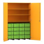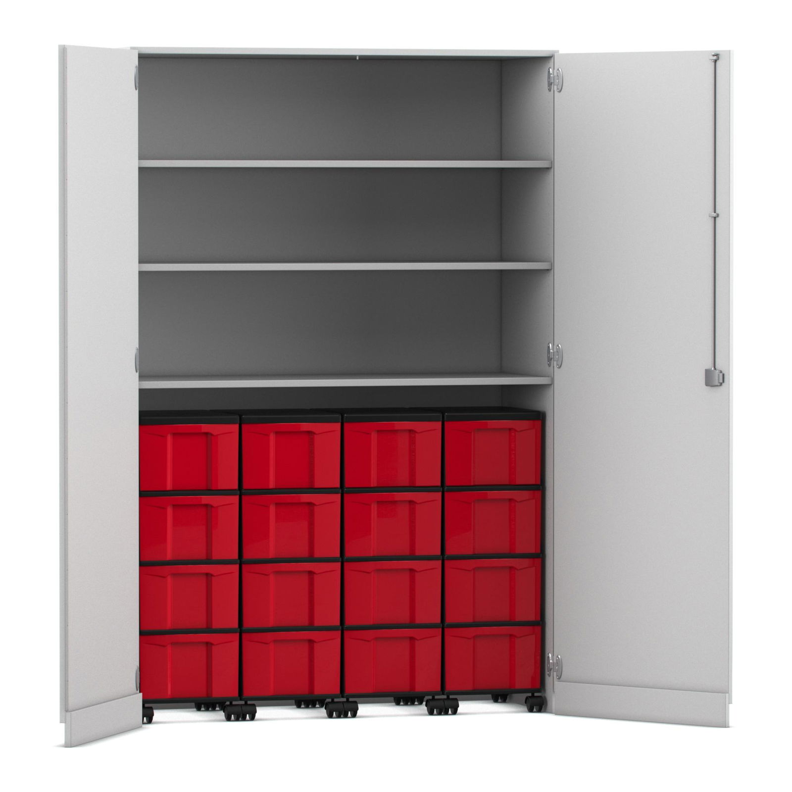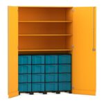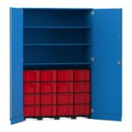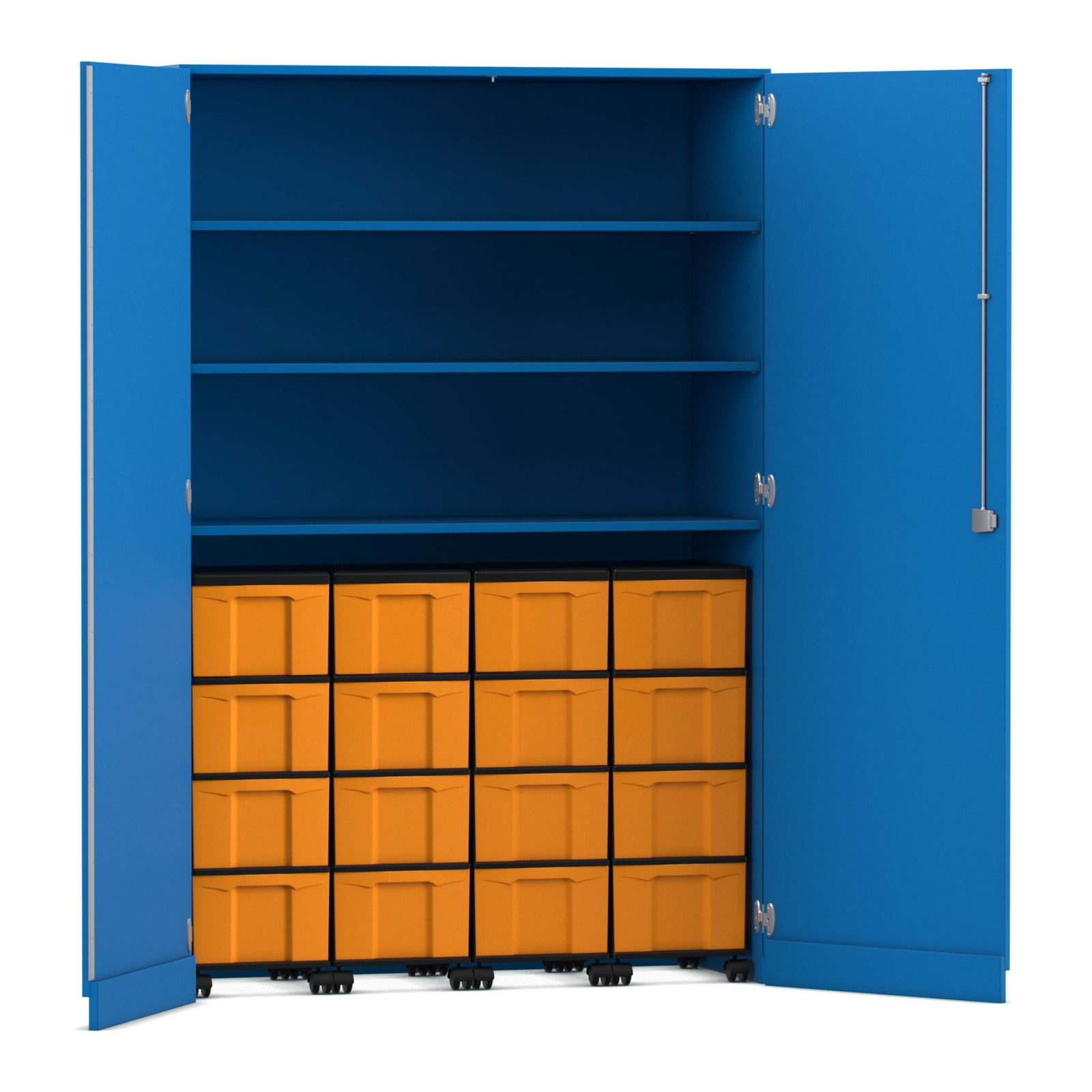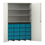 Mit verschließbaren Türen, höhenverstellbaren Fachböden und schwerem, standfestem Material erfüllt der Flexeo® Garagenschrank selbst die höchsten Anforderungen an Sicherheit und Stabilität. Die farbigen Boxen aus biobasiertem Kunststoff unterstreichen die Nachhaltigkeit dieses Produkts, das komplett montiert geliefert wird und sofort einsatzbereit ist.