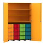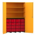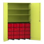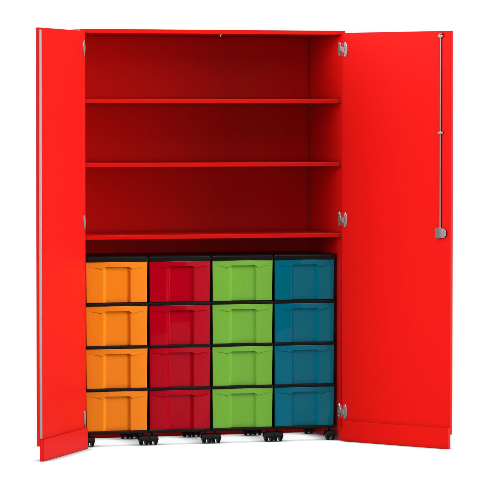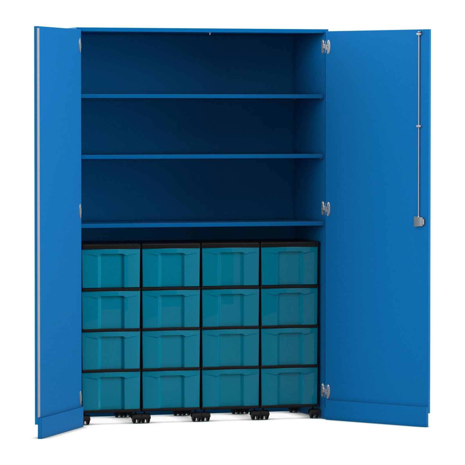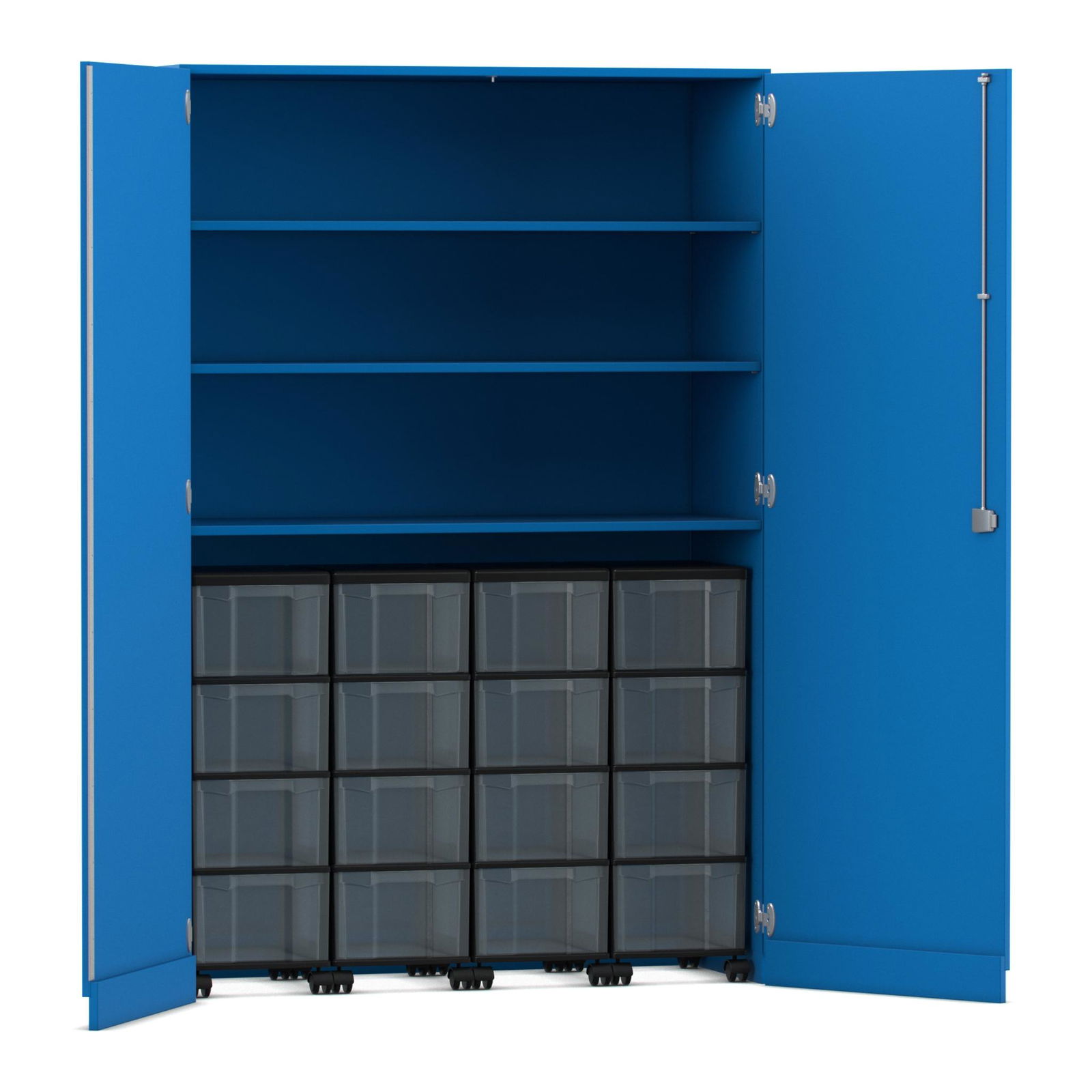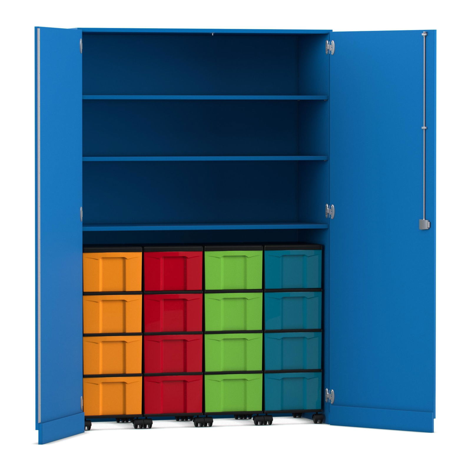 Mit verschließbaren Türen, höhenverstellbaren Fachböden und schwerem, standfestem Material erfüllt der Flexeo® Garagenschrank selbst die höchsten Anforderungen an Sicherheit und Stabilität. Die farbigen Boxen aus biobasiertem Kunststoff unterstreichen die Nachhaltigkeit dieses Produkts, das komplett montiert geliefert wird und sofort einsatzbereit ist.
