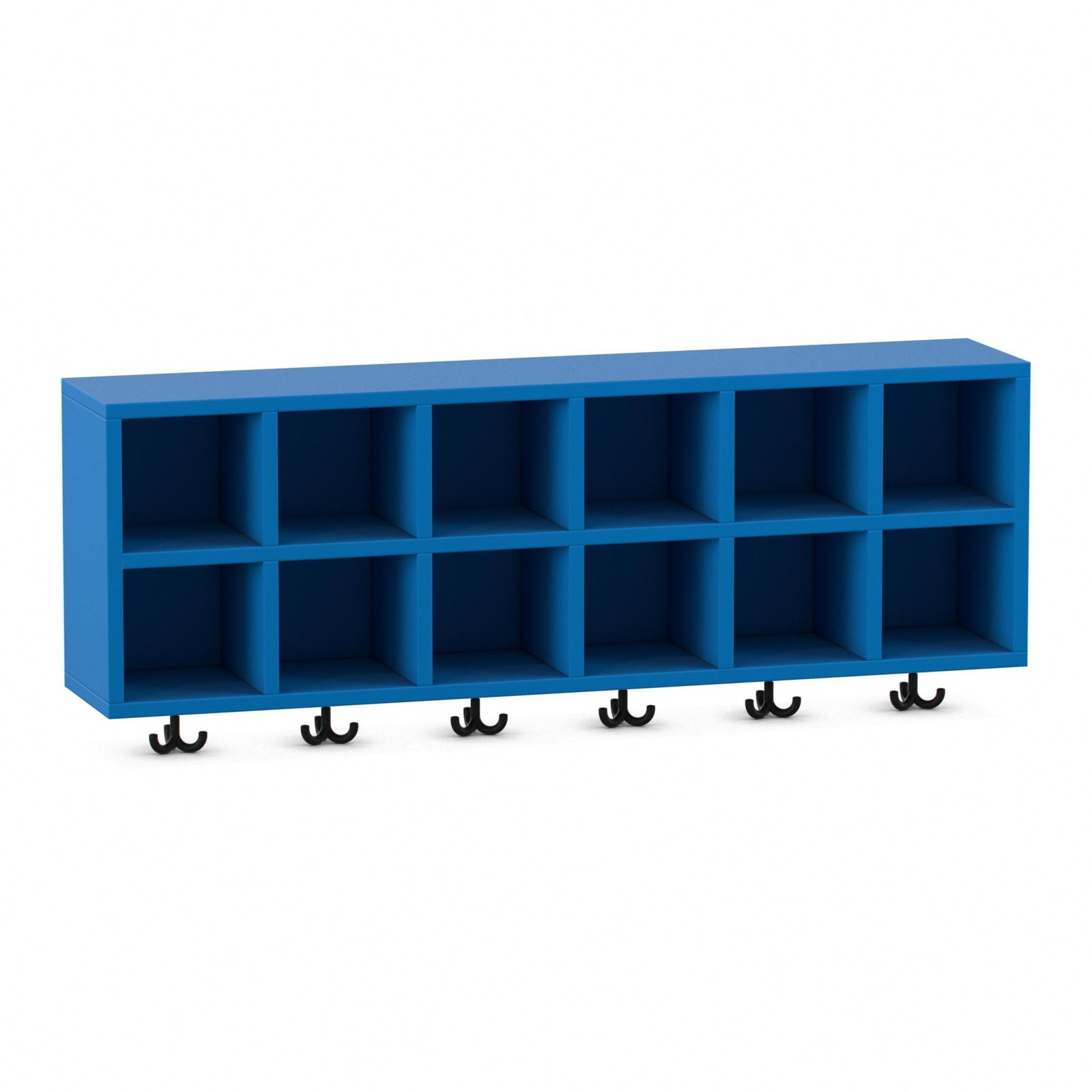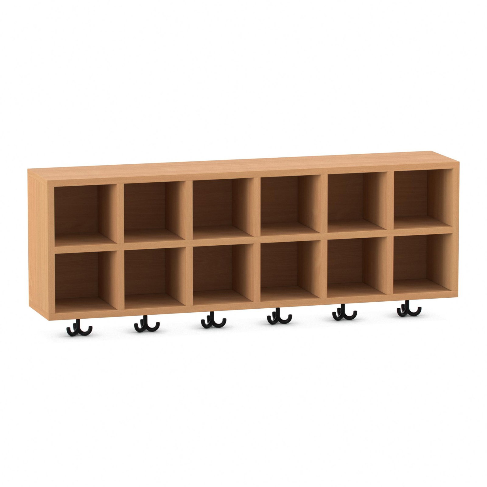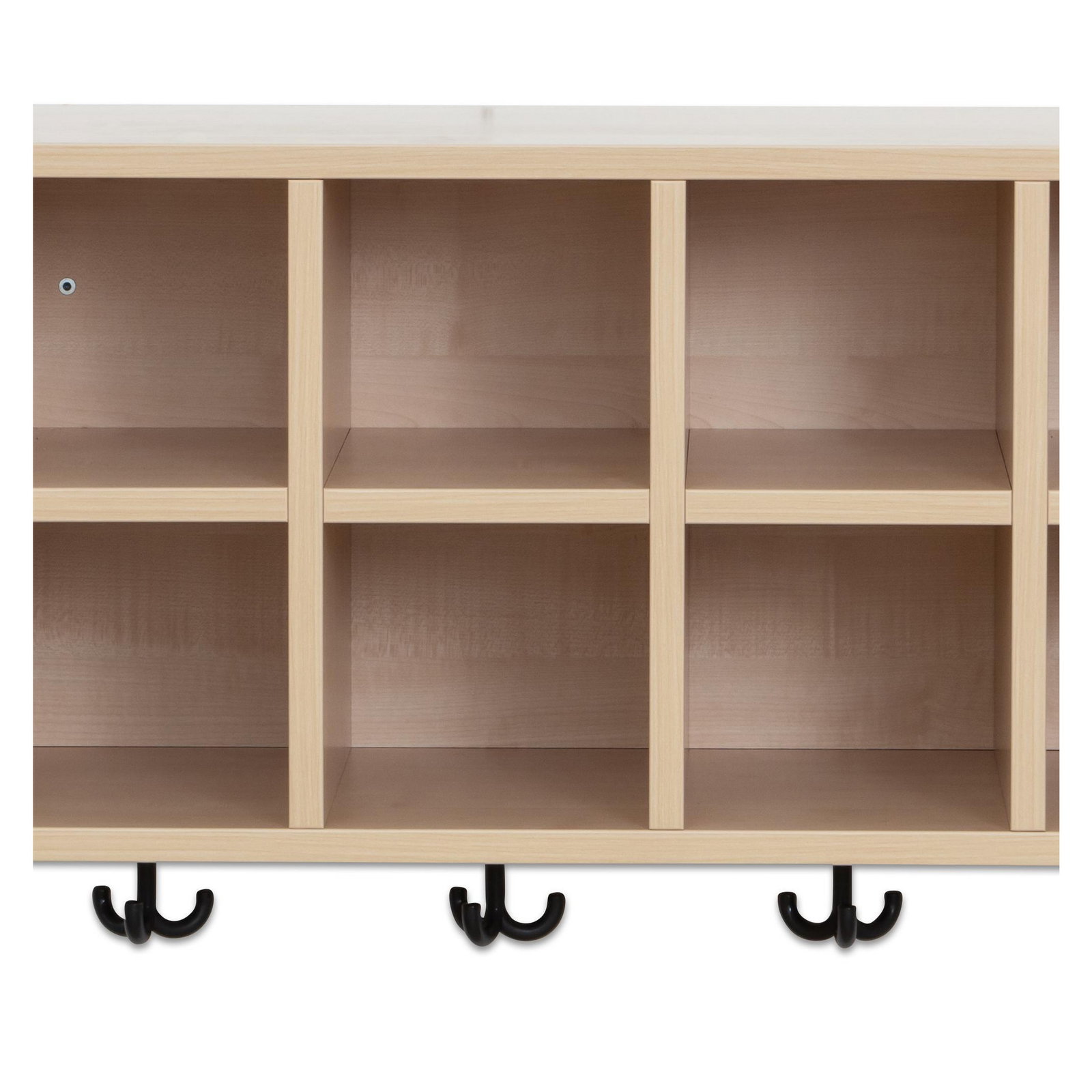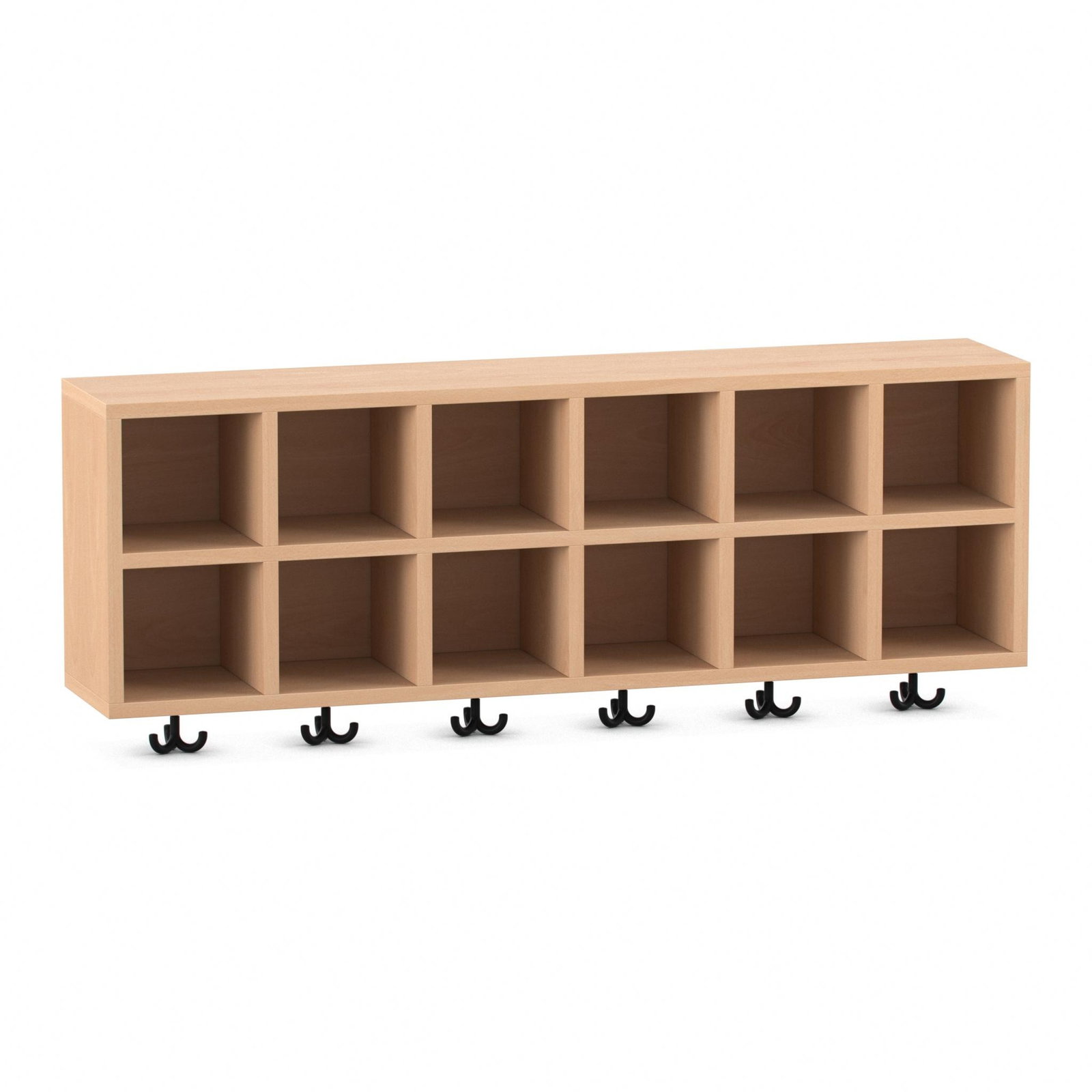Die Förderung der kindlichen Selbstständigkeit ist ein zentrales pädagogisches Ziel in Kitas und Schulen. Mit diesem durchdachten Hängeregal geben Sie den Kindern einen eigenen, gut erreichbaren Bereich. In den insgesamt zwölf übersichtlichen Fächern können die Kleinen ihre persönlichen Dinge völlig eigenständig verstauen und wieder herausnehmen. Diese tägliche Routine stärkt das Selbstbewusstsein und entlastet das pädagogische Personal spürbar. Um perfekt auf Ihre individuellen Anforderungen einzugehen, erhalten Sie das Regal in zwei praktischen Varianten. Wählen Sie die Ausführung mit sechs Dreifachhaken, um sofort 18 Aufhängeplätze für Jacken, Taschen und Turnbeutel zu schaffen. Alternativ entscheiden Sie sich für die Variante ohne Haken, falls Sie bereits über separate Garderobenleisten an den Wänden verfügen. Die Haken befestigen Sie bei der Montage mit den mitgelieferten Schrauben ganz unkompliziert an den vorgebohrten Stellen.