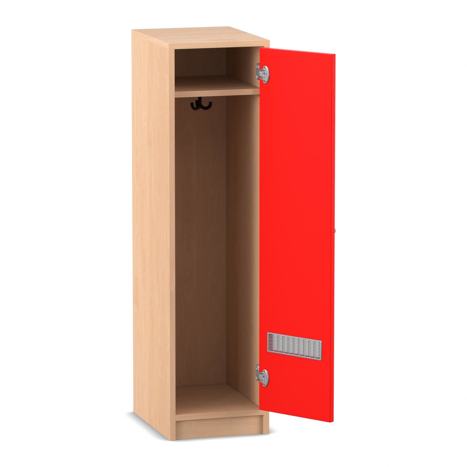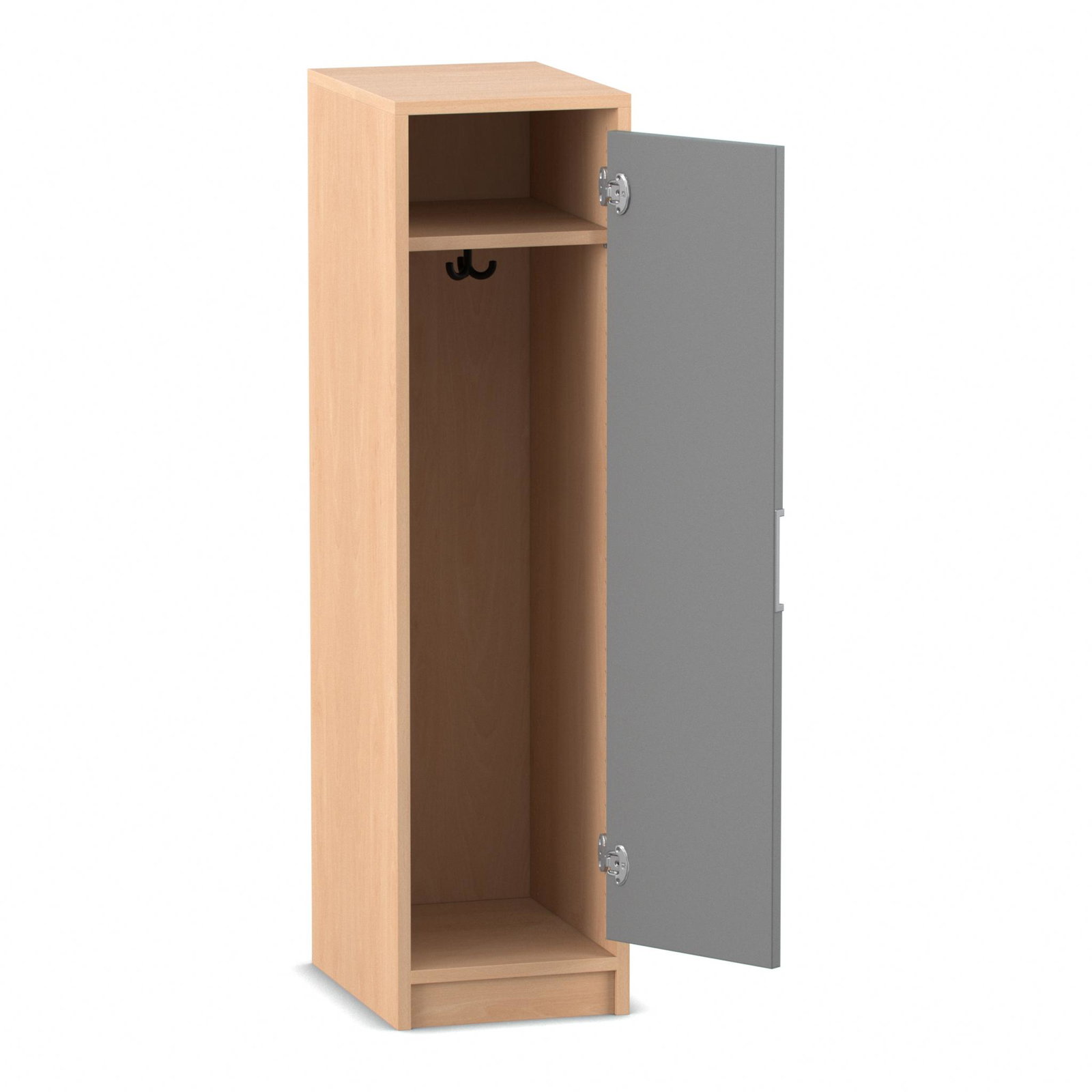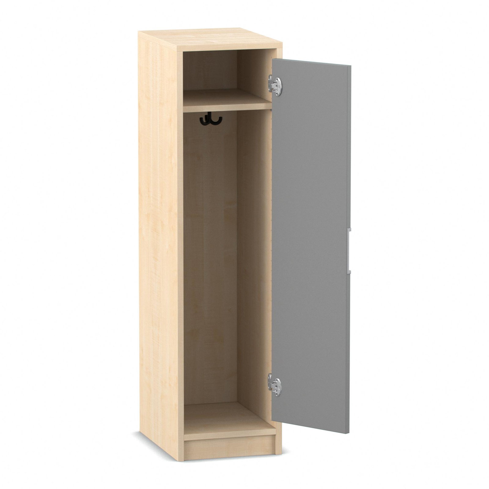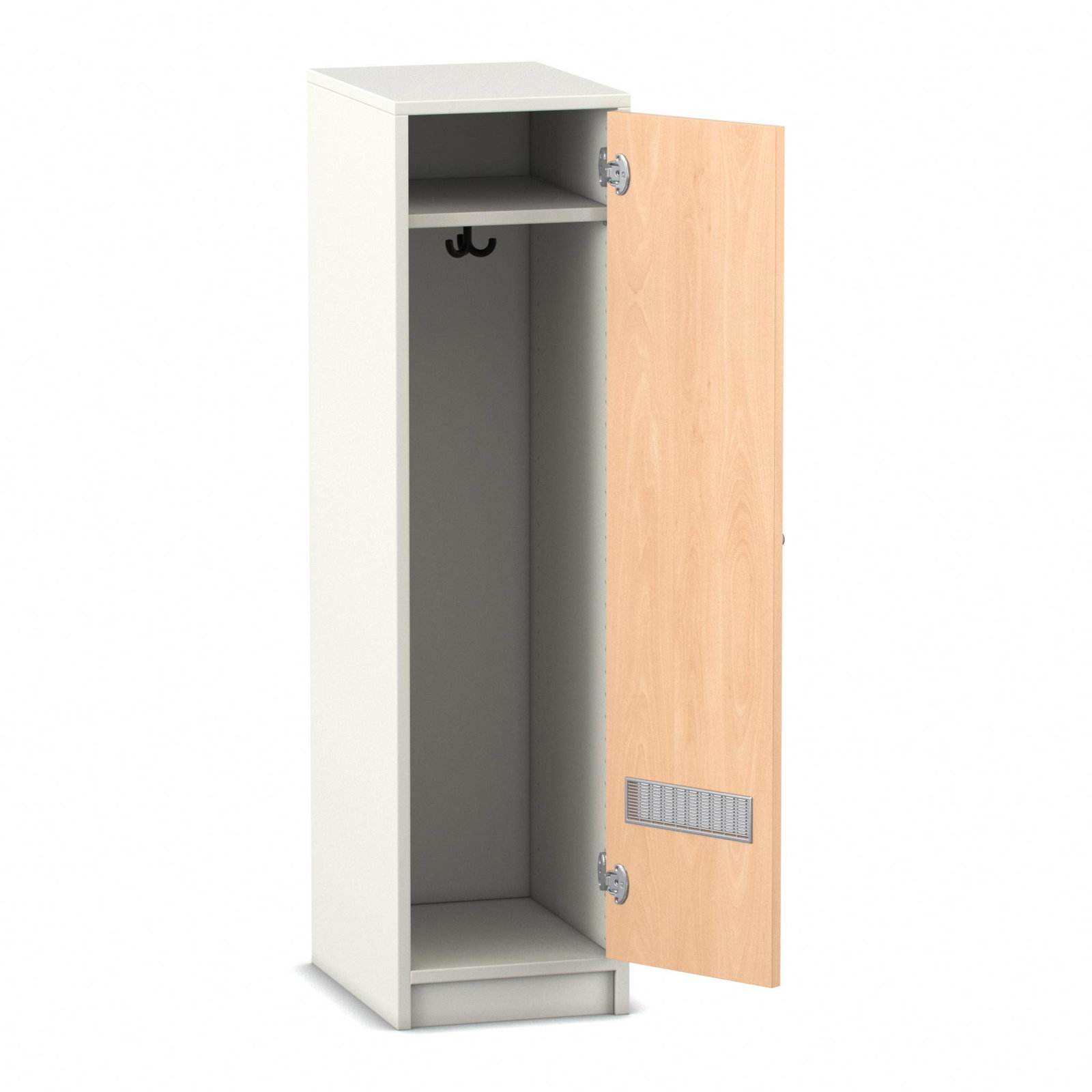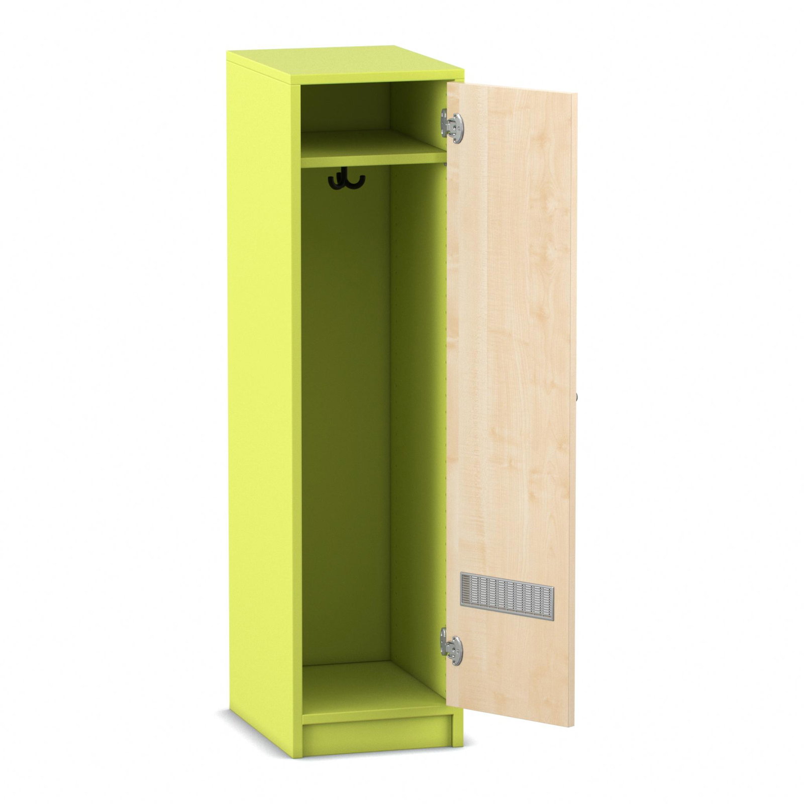 Im Inneren überzeugt der einreihige Schrank durch eine klare Aufteilung. Ein flexibel verstellbarer Fachboden schafft Platz für Rucksäcke oder kleine Schätze, während der robuste Dreifachhaken aus Kunststoff dicke Jacken und Matschhosen sicher aufnimmt. Um unangenehme Gerüche oder feuchte Kleidung zu vermeiden, verfügt der Garderobenschrank über clevere Belüftungskonzepte. Wählen Sie die Ausführung mit praktischem Muschelgriff, erhalten Sie eine verkürzte Tür, die oben und unten natürliche Lüftungsschlitze bildet. Bevorzugen Sie das sichere Zahlenschloss, schließt die Tür bündig mit dem Korpus ab, während ein fest verbautes Lüftungsgitter für eine stetige Luftzirkulation sorgt. Den Türanschlag können Sie passend zu Ihren Räumen ganz flexibel links oder rechts wählen.