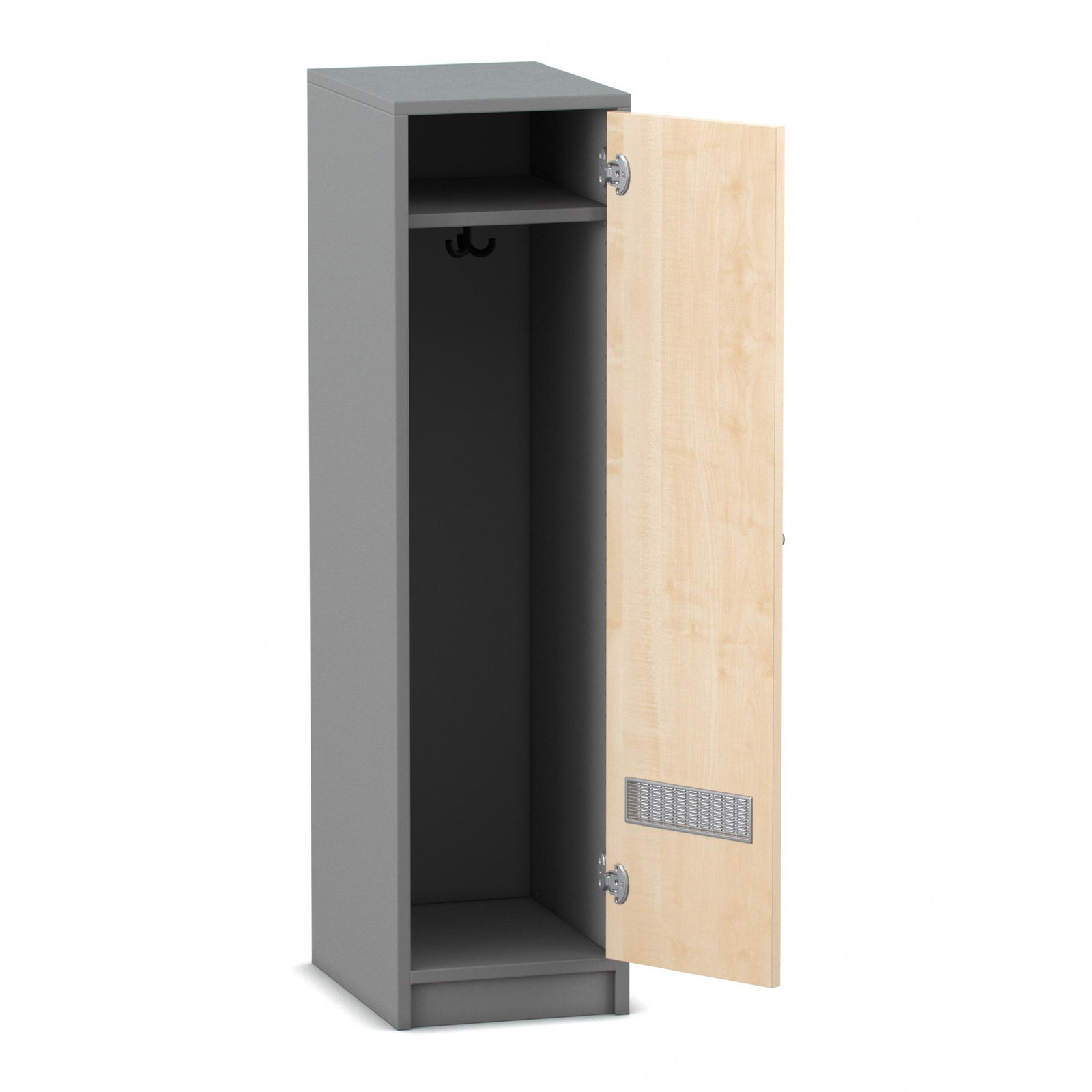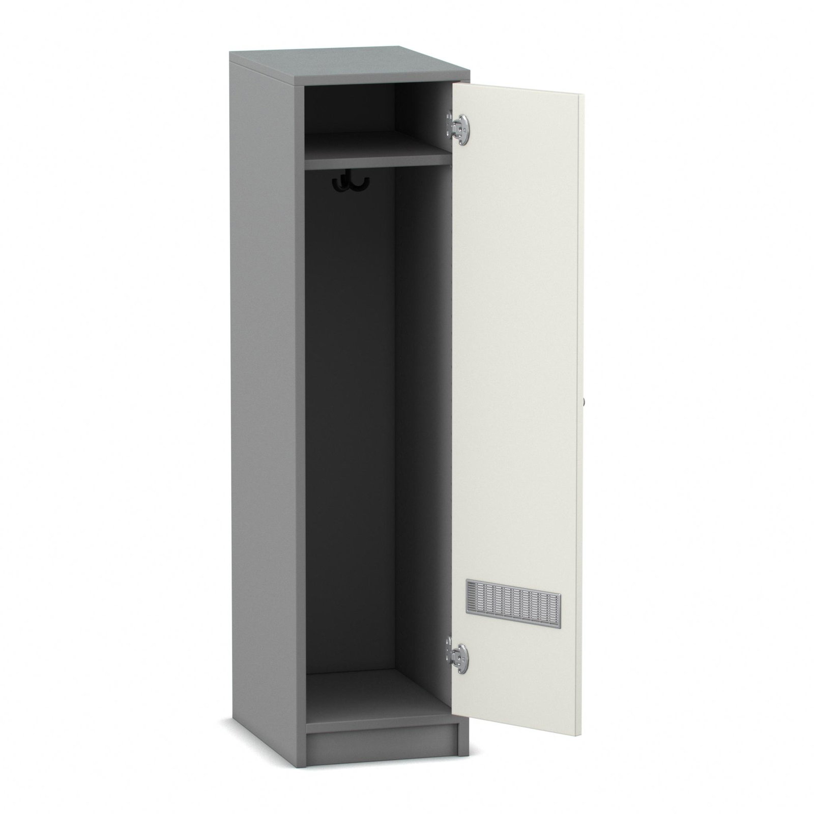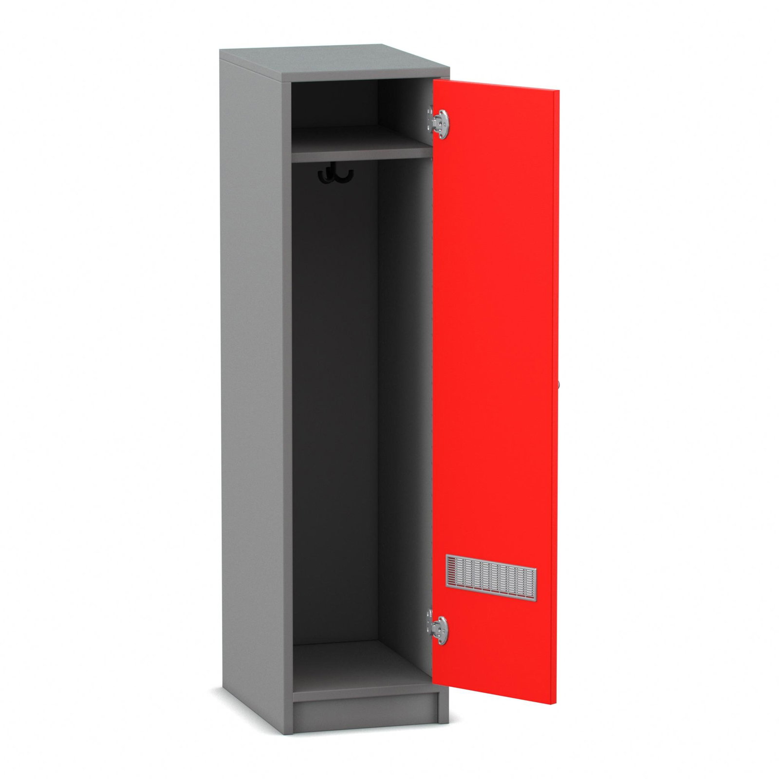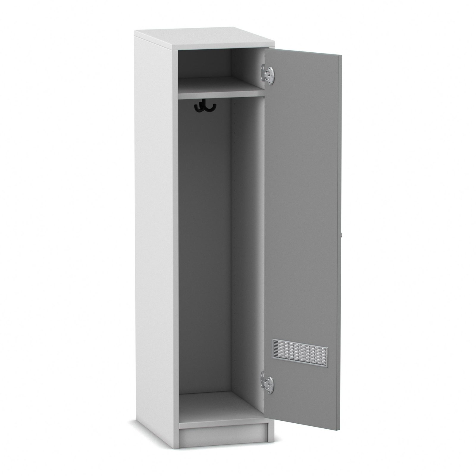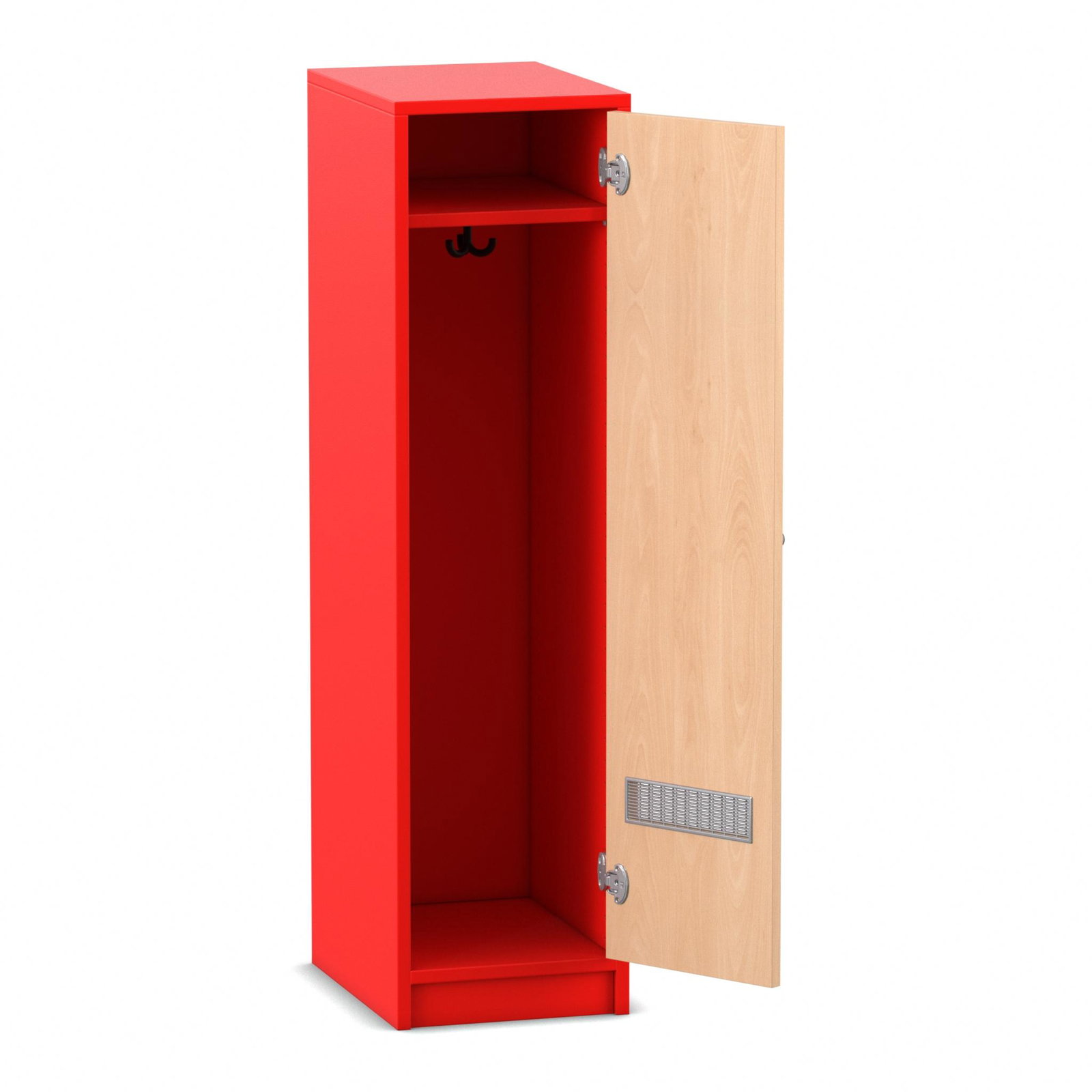 Im Inneren überzeugt der einreihige Schrank durch eine klare Aufteilung. Ein flexibel verstellbarer Fachboden schafft Platz für Rucksäcke oder kleine Schätze, während der robuste Dreifachhaken aus Kunststoff dicke Jacken und Matschhosen sicher aufnimmt. Um unangenehme Gerüche oder feuchte Kleidung zu vermeiden, verfügt der Garderobenschrank über clevere Belüftungskonzepte. Wählen Sie die Ausführung mit praktischem Muschelgriff, erhalten Sie eine verkürzte Tür, die oben und unten natürliche Lüftungsschlitze bildet. Bevorzugen Sie das sichere Zahlenschloss, schließt die Tür bündig mit dem Korpus ab, während ein fest verbautes Lüftungsgitter für eine stetige Luftzirkulation sorgt. Den Türanschlag können Sie passend zu Ihren Räumen ganz flexibel links oder rechts wählen.