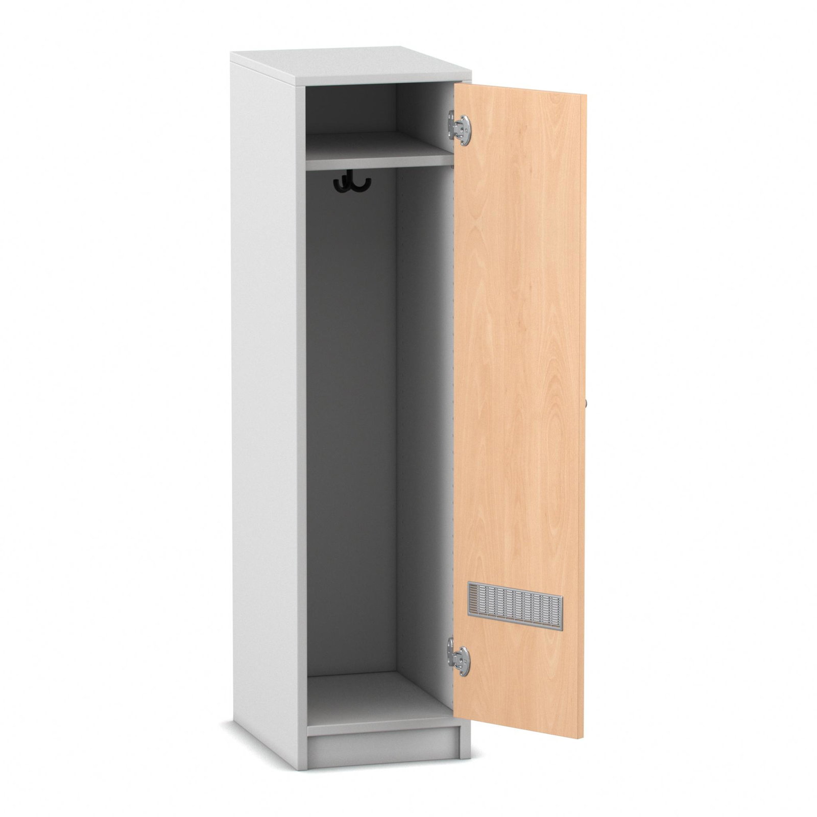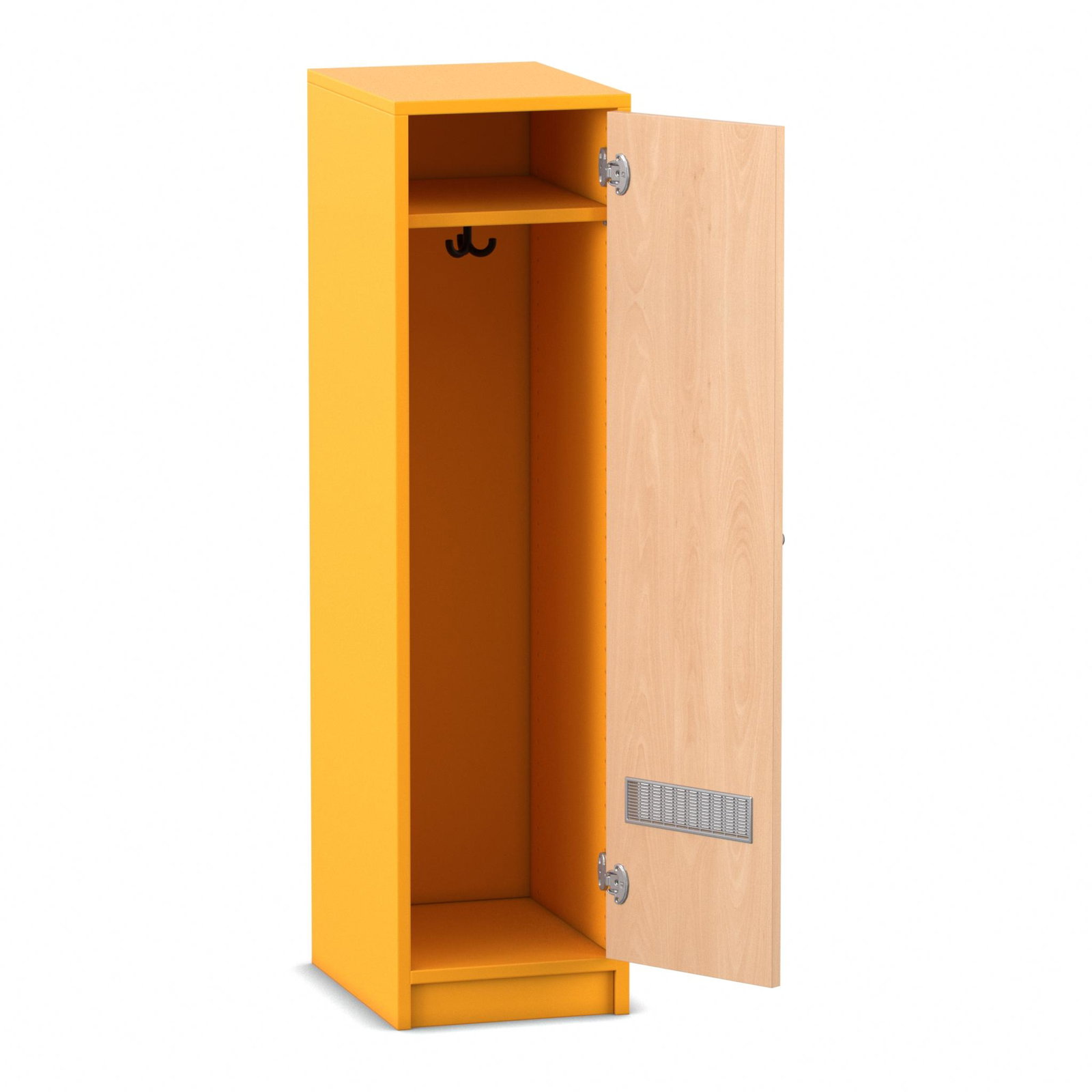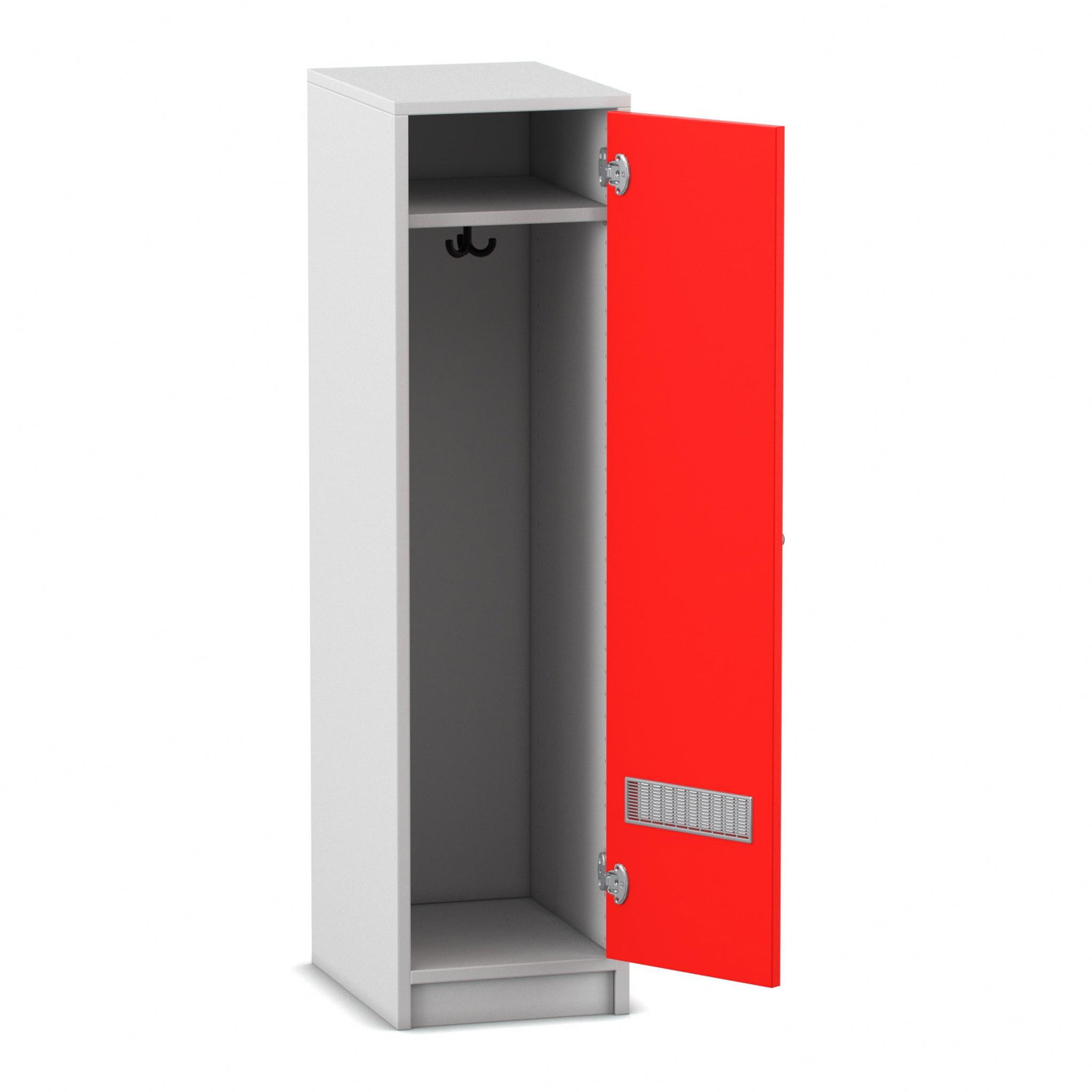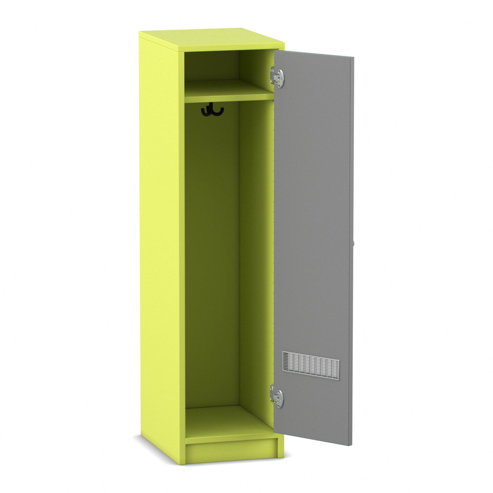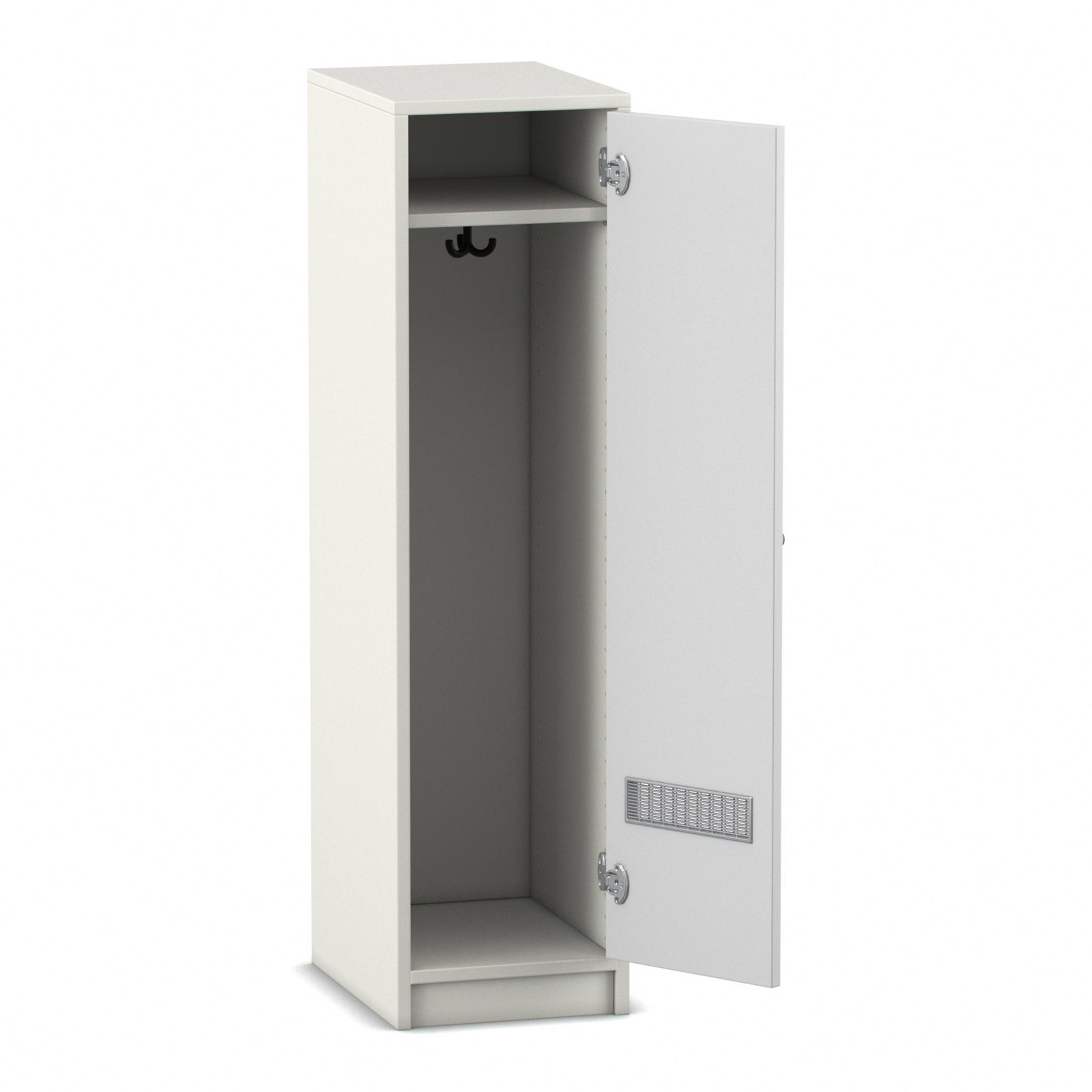 Im Inneren überzeugt der einreihige Schrank durch eine klare Aufteilung. Ein flexibel verstellbarer Fachboden schafft Platz für Rucksäcke oder kleine Schätze, während der robuste Dreifachhaken aus Kunststoff dicke Jacken und Matschhosen sicher aufnimmt. Um unangenehme Gerüche oder feuchte Kleidung zu vermeiden, verfügt der Garderobenschrank über clevere Belüftungskonzepte. Wählen Sie die Ausführung mit praktischem Muschelgriff, erhalten Sie eine verkürzte Tür, die oben und unten natürliche Lüftungsschlitze bildet. Bevorzugen Sie das sichere Zahlenschloss, schließt die Tür bündig mit dem Korpus ab, während ein fest verbautes Lüftungsgitter für eine stetige Luftzirkulation sorgt. Den Türanschlag können Sie passend zu Ihren Räumen ganz flexibel links oder rechts wählen.
