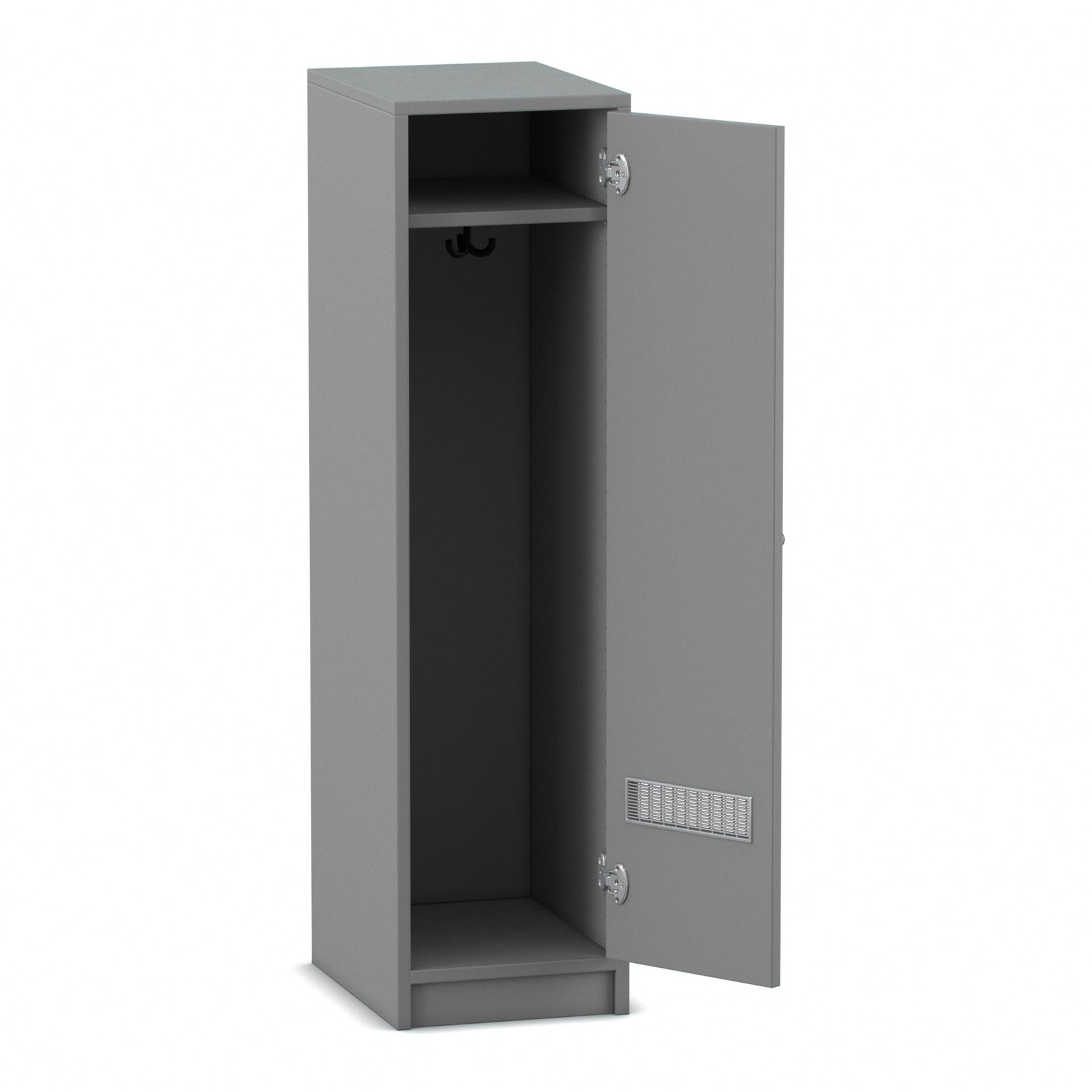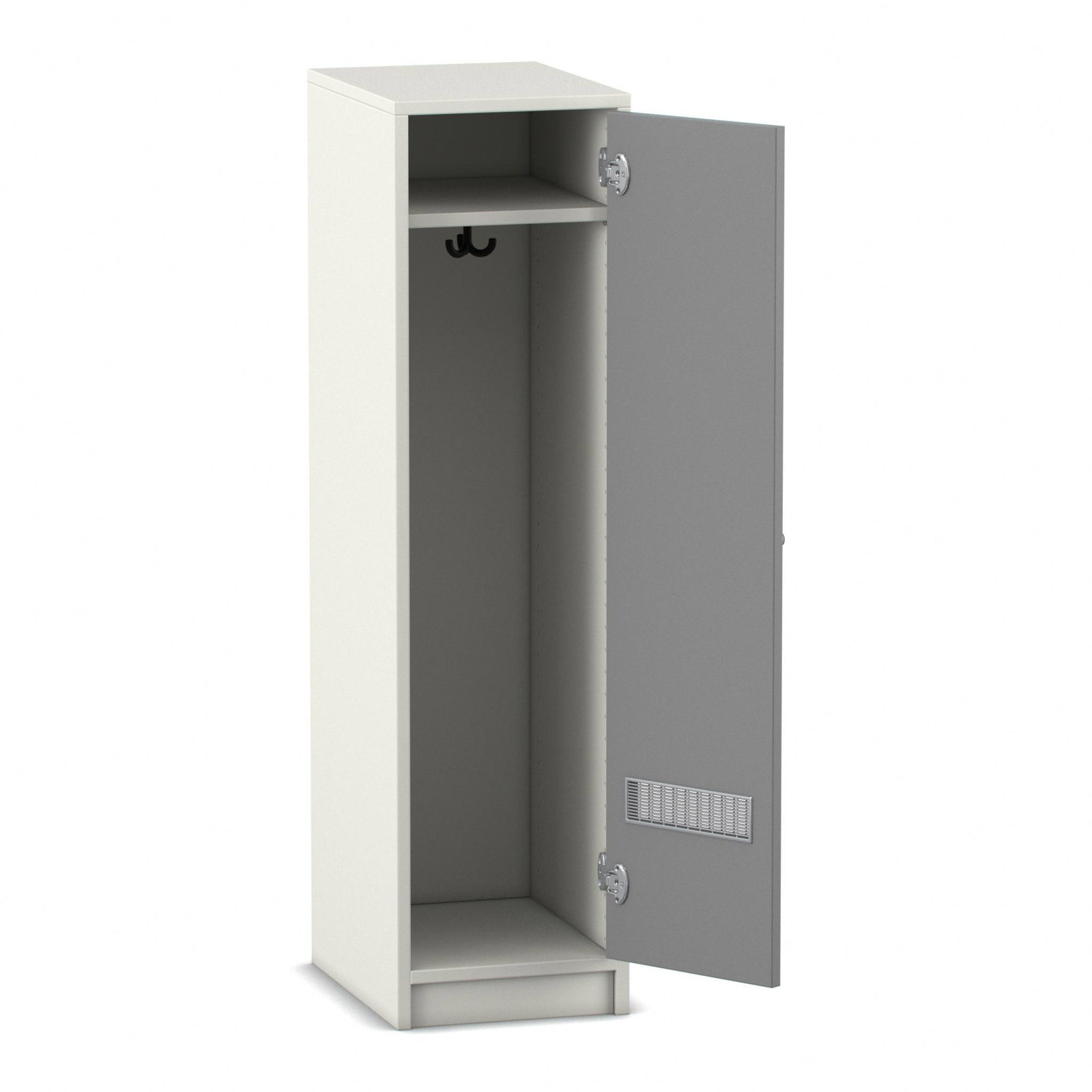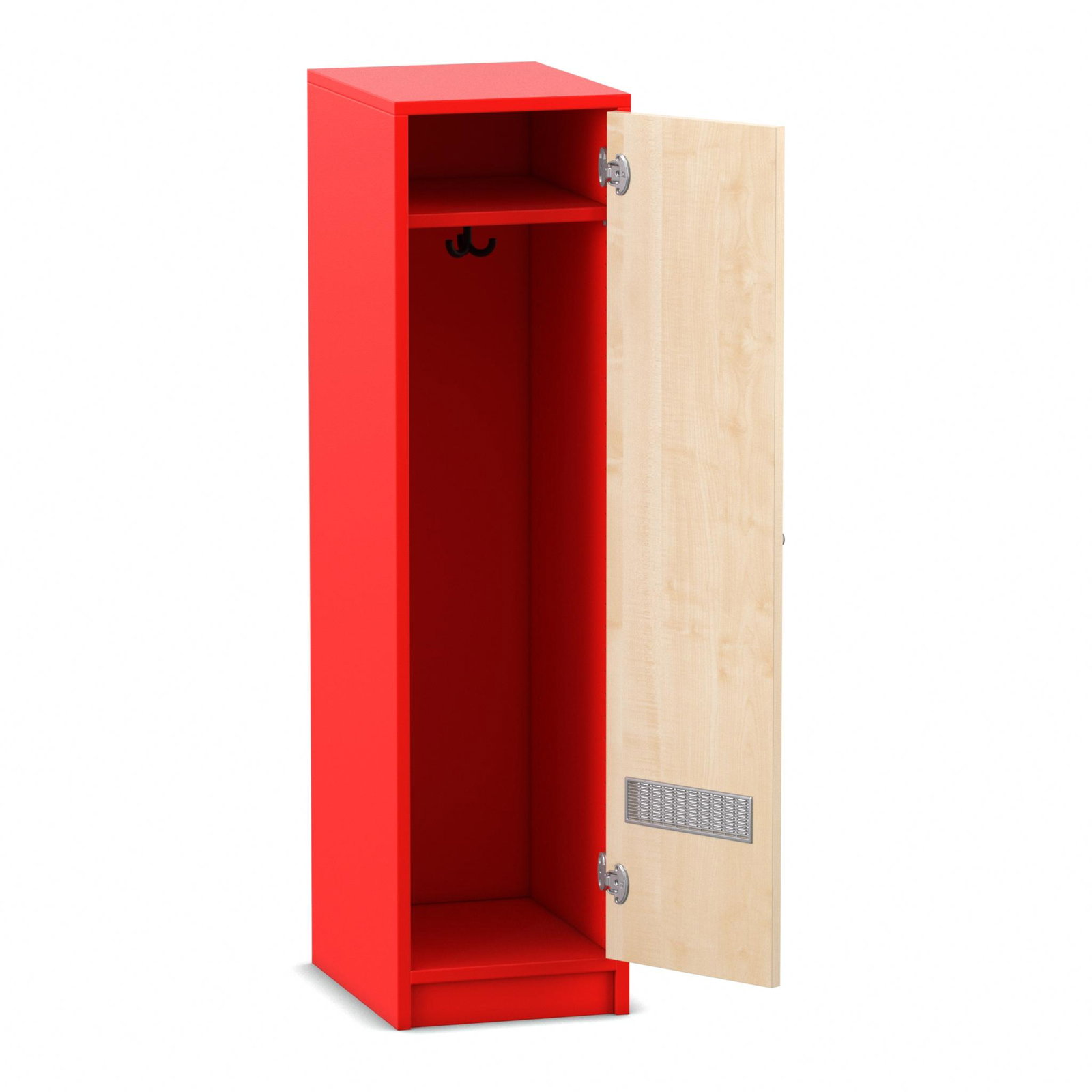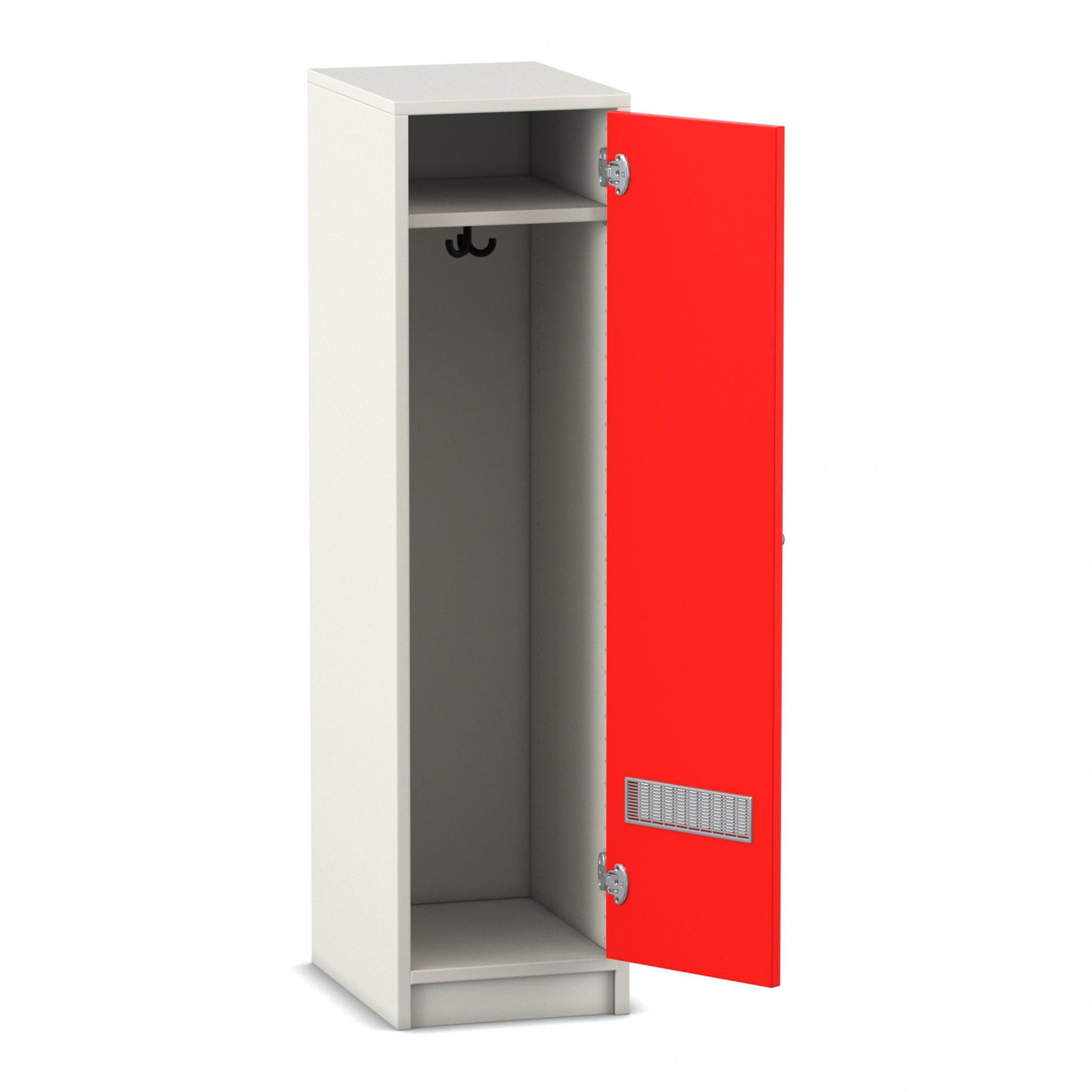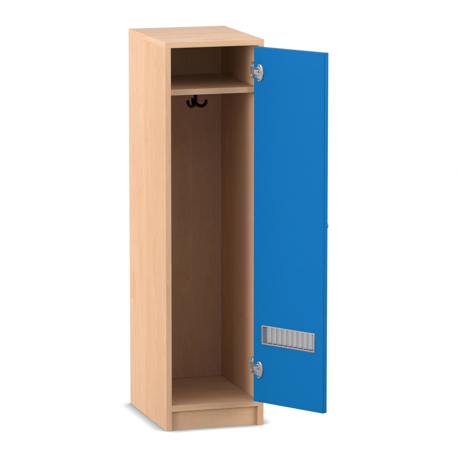Im Inneren überzeugt der einreihige Schrank durch eine klare Aufteilung. Ein flexibel verstellbarer Fachboden schafft Platz für Rucksäcke oder kleine Schätze, während der robuste Dreifachhaken aus Kunststoff dicke Jacken und Matschhosen sicher aufnimmt. Um unangenehme Gerüche oder feuchte Kleidung zu vermeiden, verfügt der Garderobenschrank über clevere Belüftungskonzepte. Wählen Sie die Ausführung mit praktischem Muschelgriff, erhalten Sie eine verkürzte Tür, die oben und unten natürliche Lüftungsschlitze bildet. Bevorzugen Sie das sichere Zahlenschloss, schließt die Tür bündig mit dem Korpus ab, während ein fest verbautes Lüftungsgitter für eine stetige Luftzirkulation sorgt. Den Türanschlag können Sie passend zu Ihren Räumen ganz flexibel links oder rechts wählen.