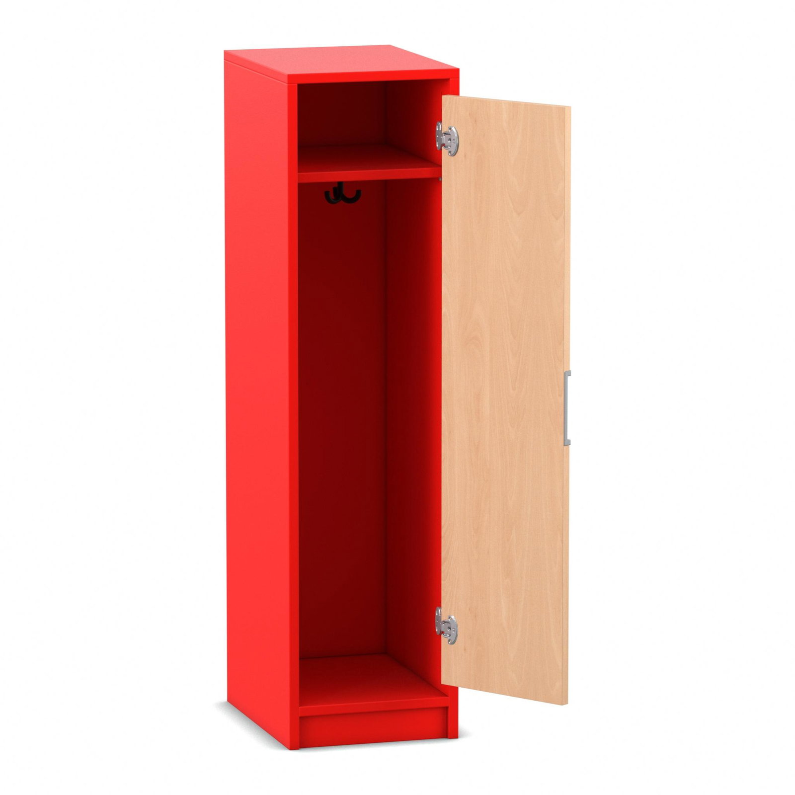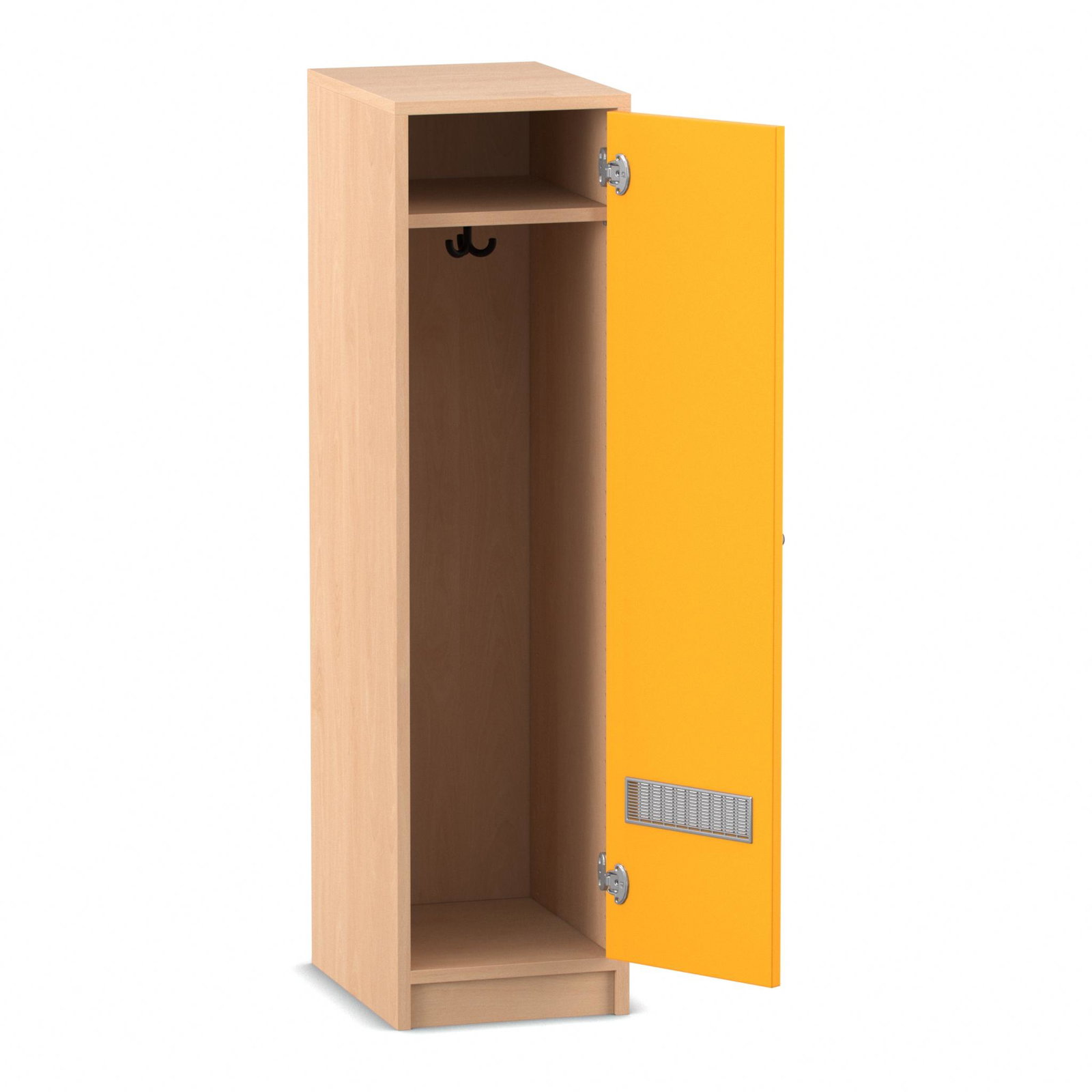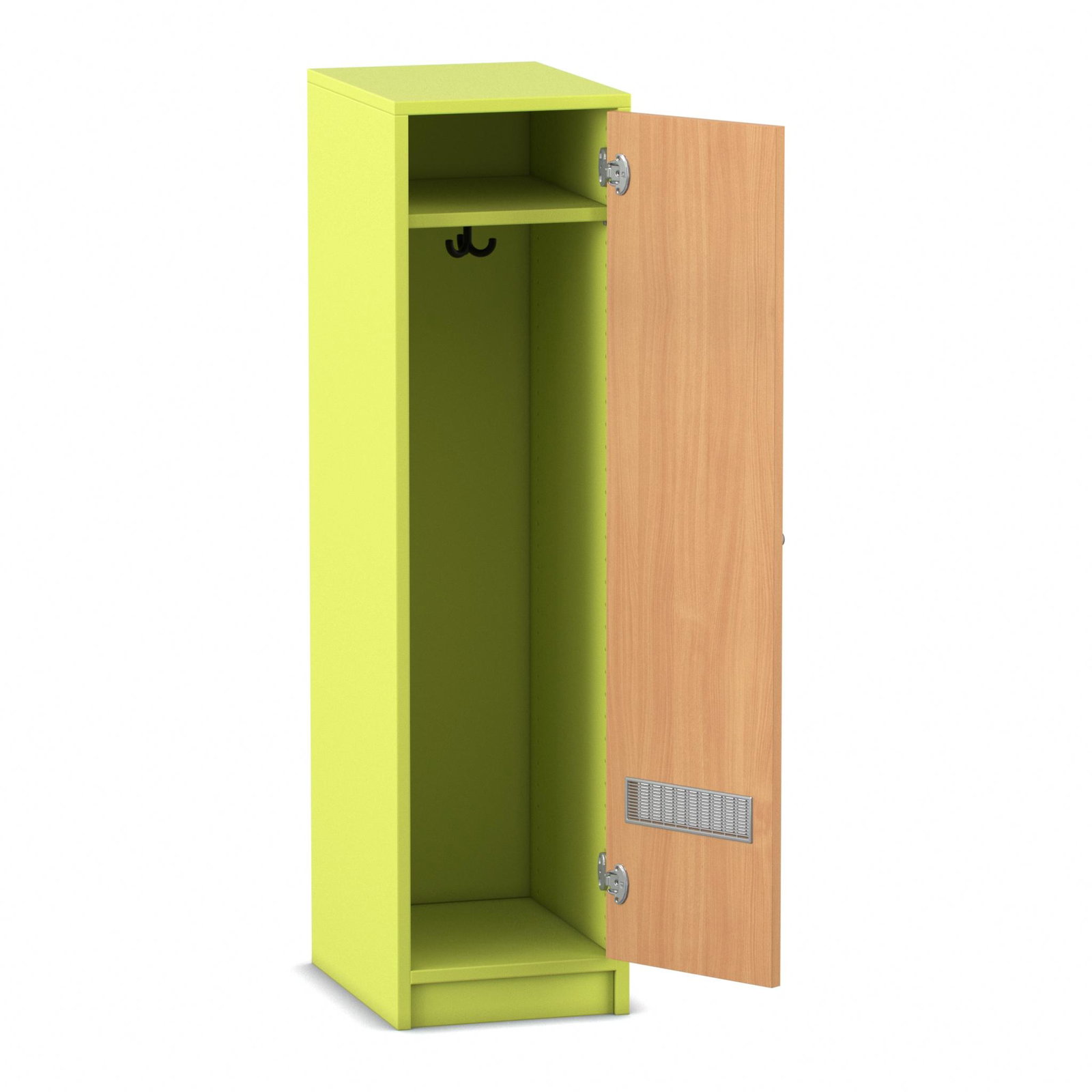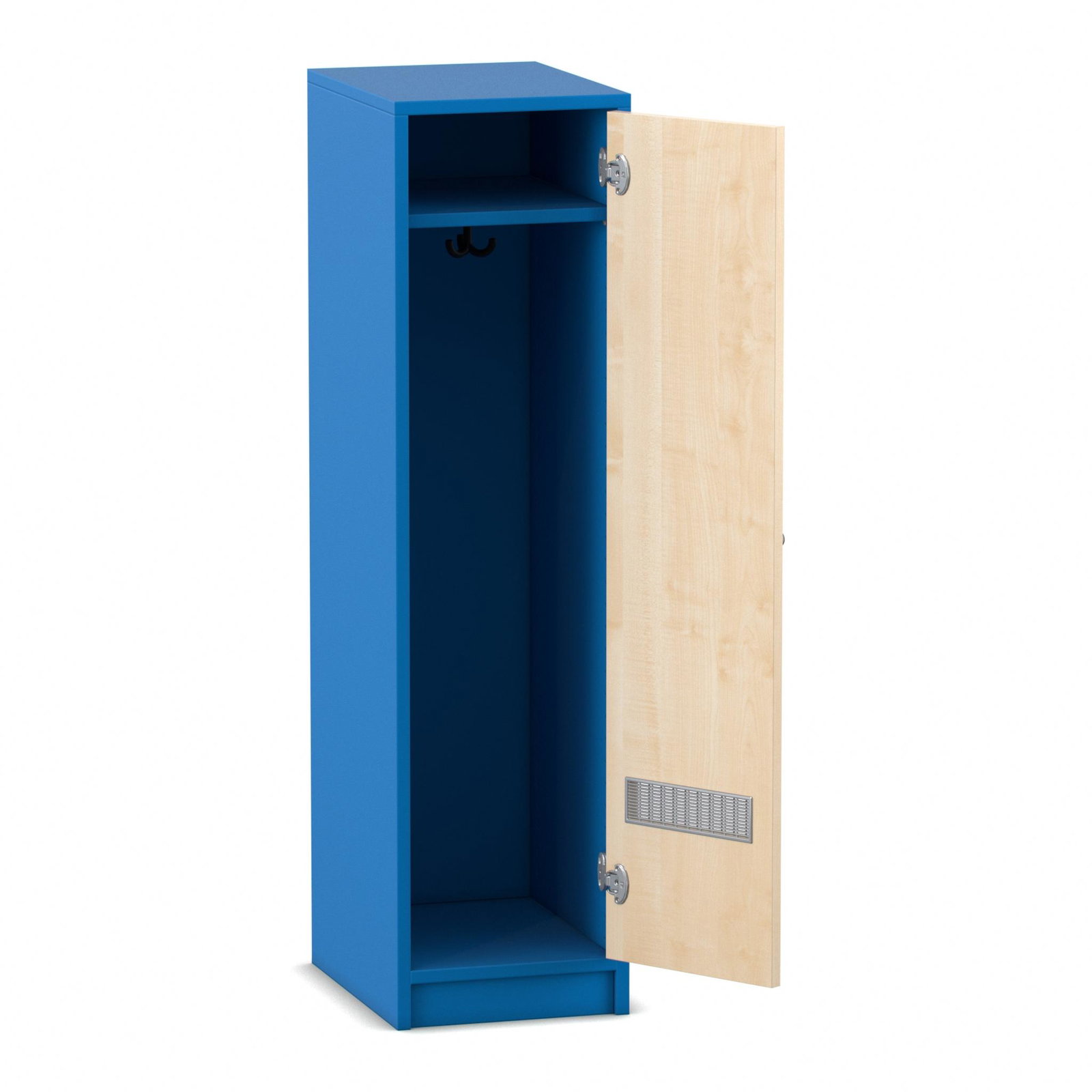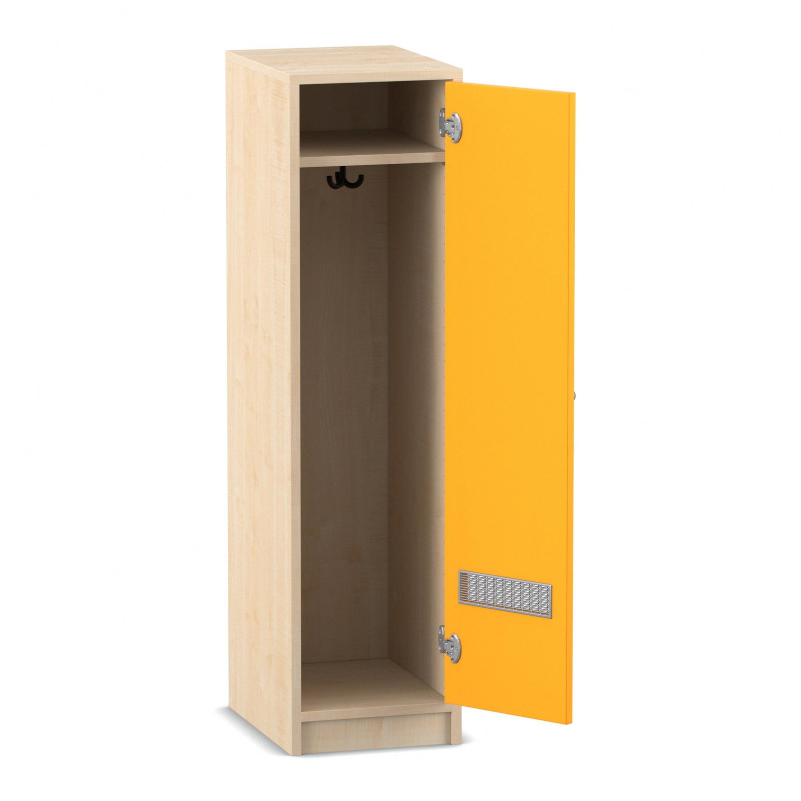 Im Inneren überzeugt der einreihige Schrank durch eine klare Aufteilung. Ein flexibel verstellbarer Fachboden schafft Platz für Rucksäcke oder kleine Schätze, während der robuste Dreifachhaken aus Kunststoff dicke Jacken und Matschhosen sicher aufnimmt. Um unangenehme Gerüche oder feuchte Kleidung zu vermeiden, verfügt der Garderobenschrank über clevere Belüftungskonzepte. Wählen Sie die Ausführung mit praktischem Muschelgriff, erhalten Sie eine verkürzte Tür, die oben und unten natürliche Lüftungsschlitze bildet. Bevorzugen Sie das sichere Zahlenschloss, schließt die Tür bündig mit dem Korpus ab, während ein fest verbautes Lüftungsgitter für eine stetige Luftzirkulation sorgt. Den Türanschlag können Sie passend zu Ihren Räumen ganz flexibel links oder rechts wählen.