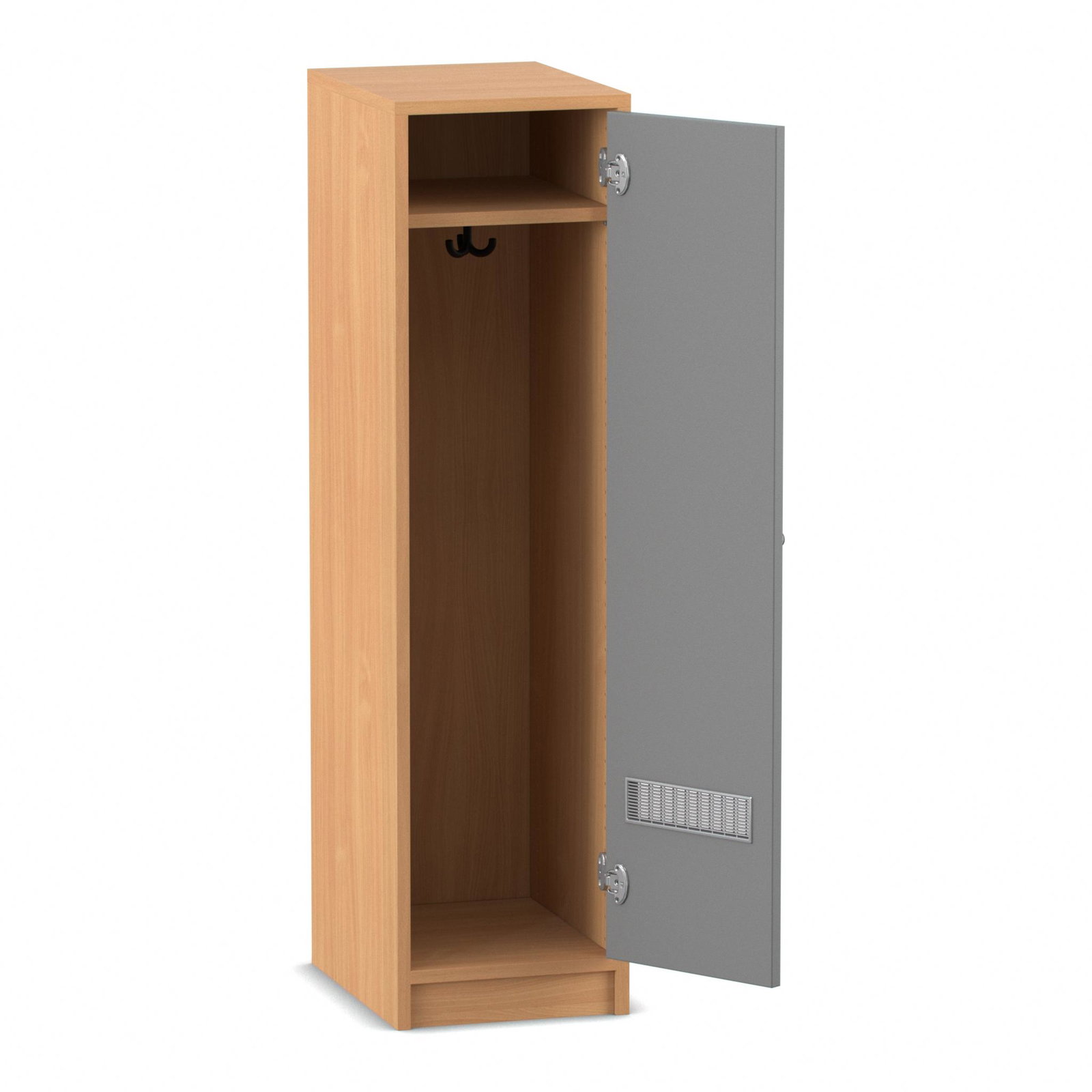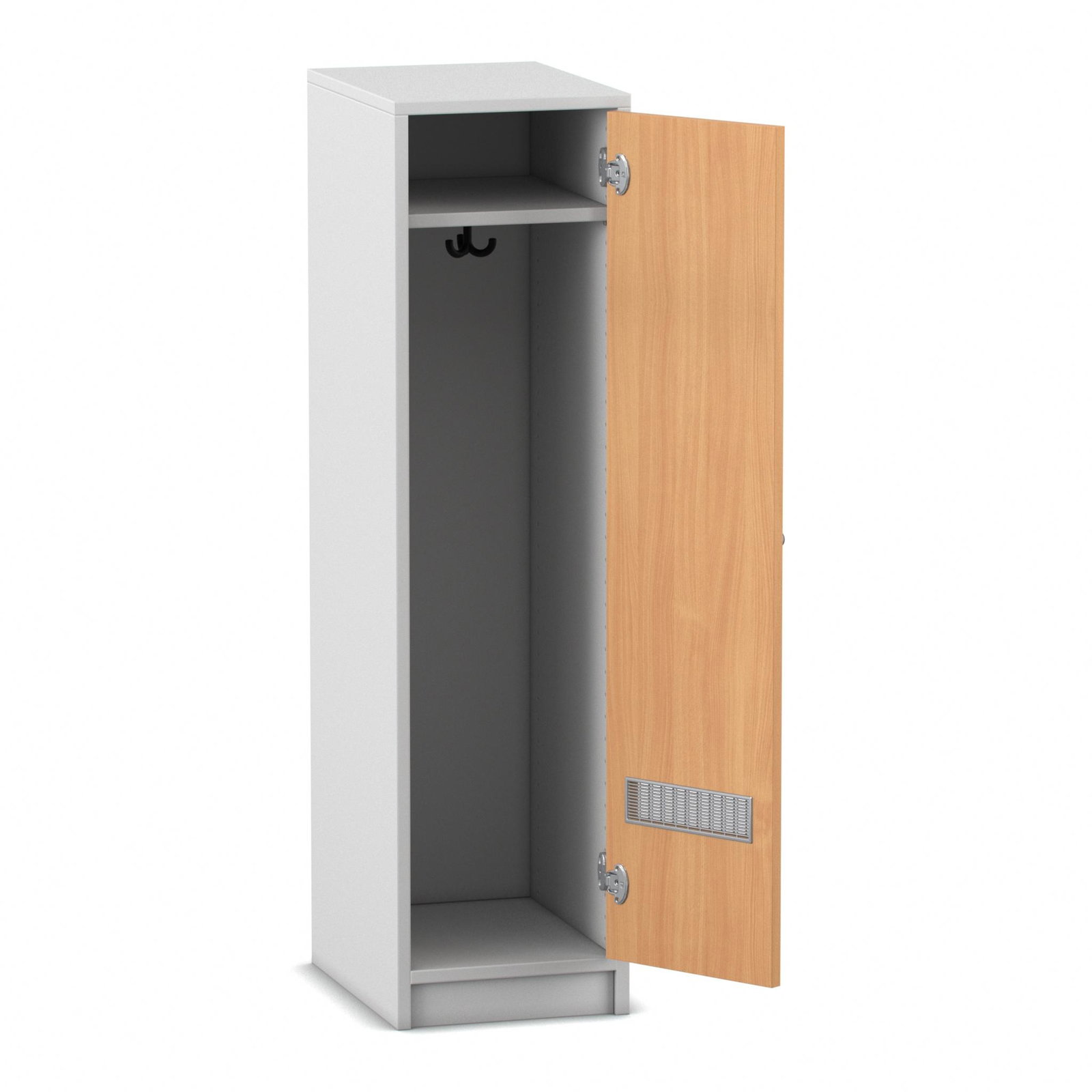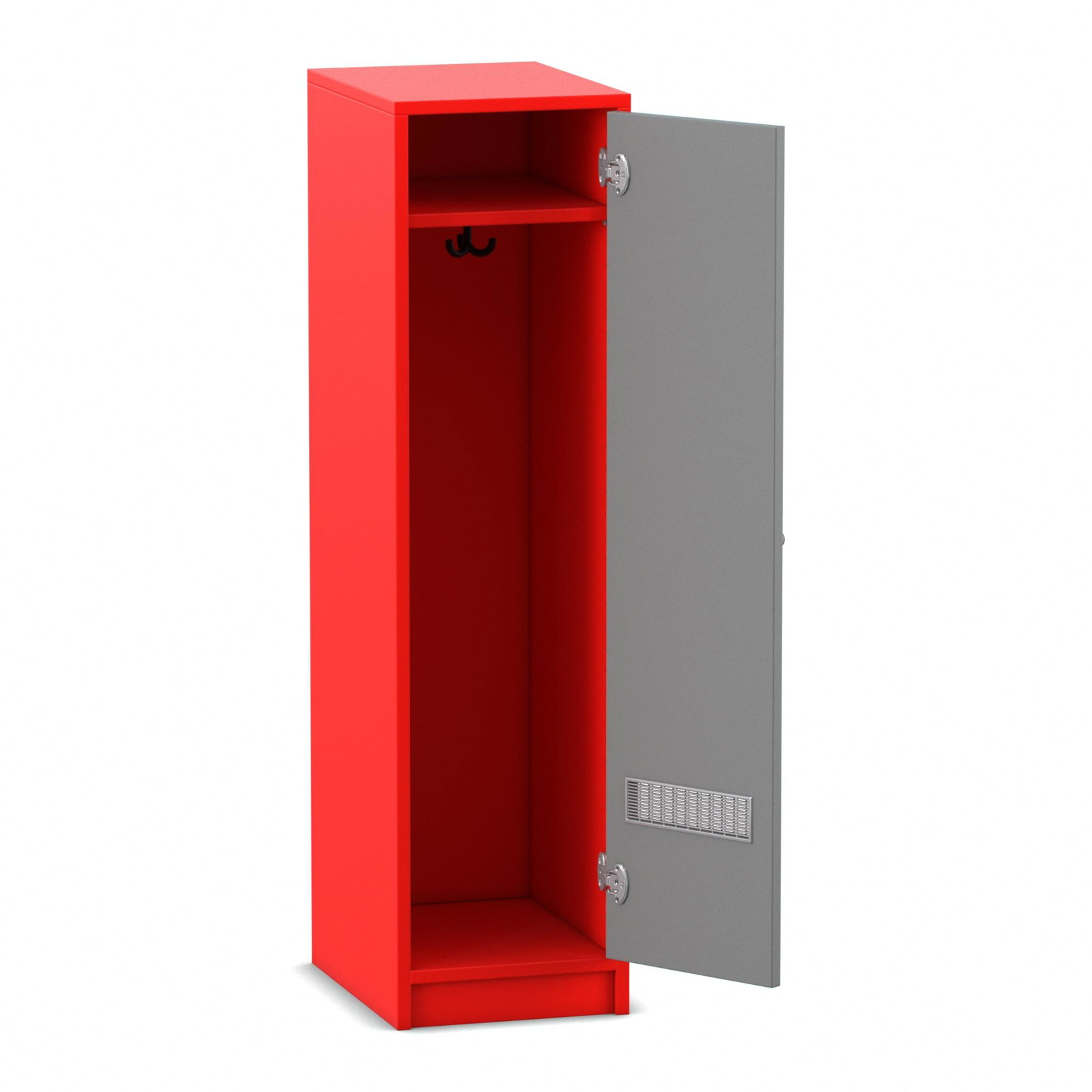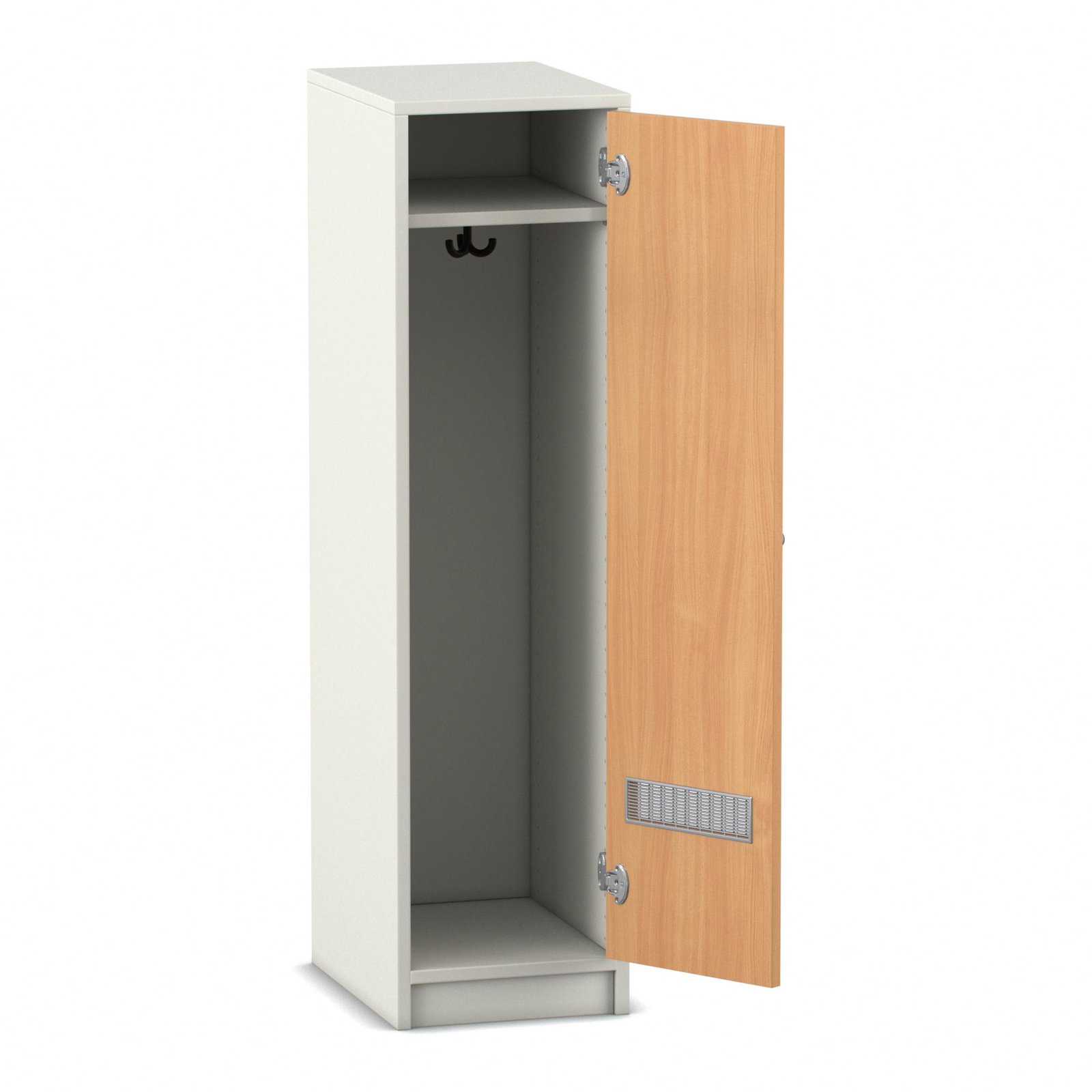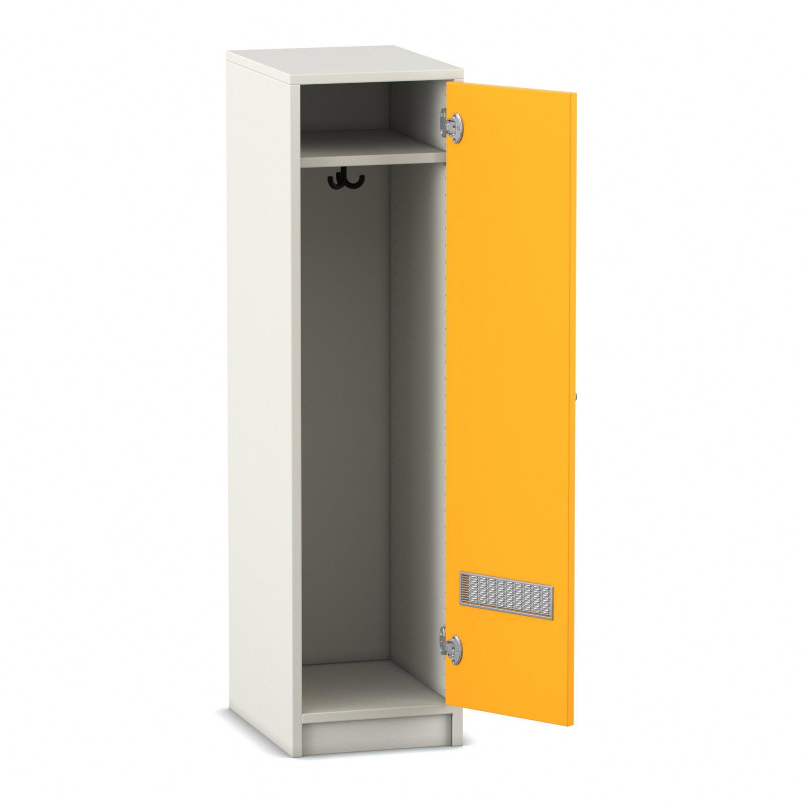 Im Inneren überzeugt der einreihige Schrank durch eine klare Aufteilung. Ein flexibel verstellbarer Fachboden schafft Platz für Rucksäcke oder kleine Schätze, während der robuste Dreifachhaken aus Kunststoff dicke Jacken und Matschhosen sicher aufnimmt. Um unangenehme Gerüche oder feuchte Kleidung zu vermeiden, verfügt der Garderobenschrank über clevere Belüftungskonzepte. Wählen Sie die Ausführung mit praktischem Muschelgriff, erhalten Sie eine verkürzte Tür, die oben und unten natürliche Lüftungsschlitze bildet. Bevorzugen Sie das sichere Zahlenschloss, schließt die Tür bündig mit dem Korpus ab, während ein fest verbautes Lüftungsgitter für eine stetige Luftzirkulation sorgt. Den Türanschlag können Sie passend zu Ihren Räumen ganz flexibel links oder rechts wählen.