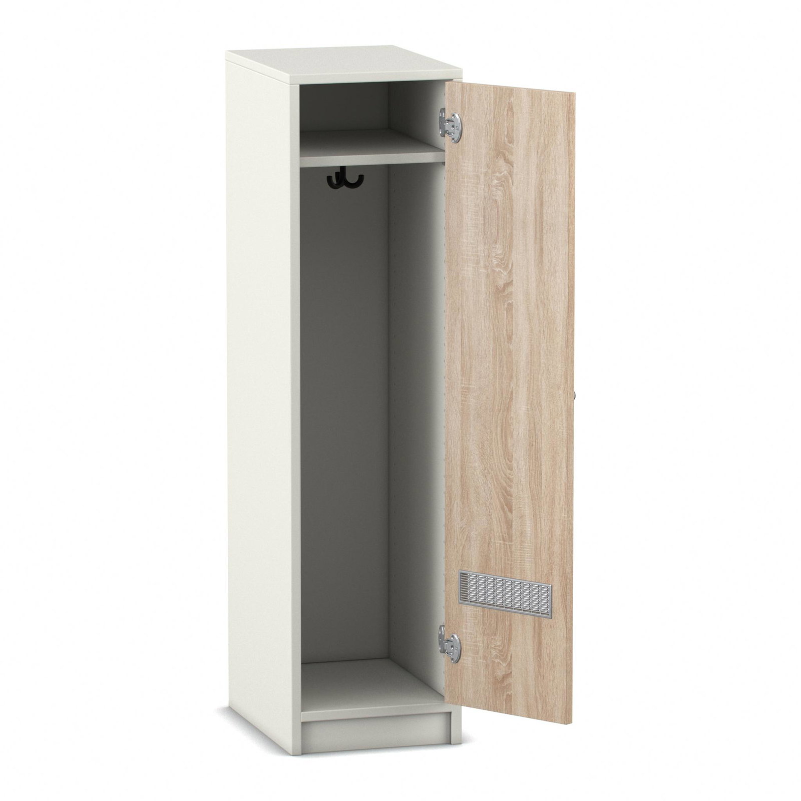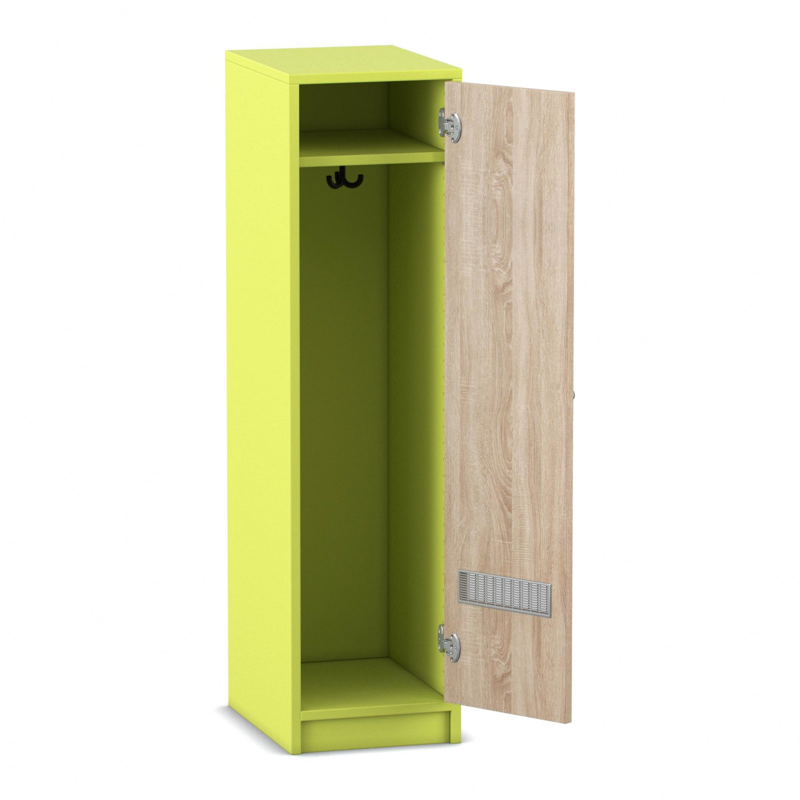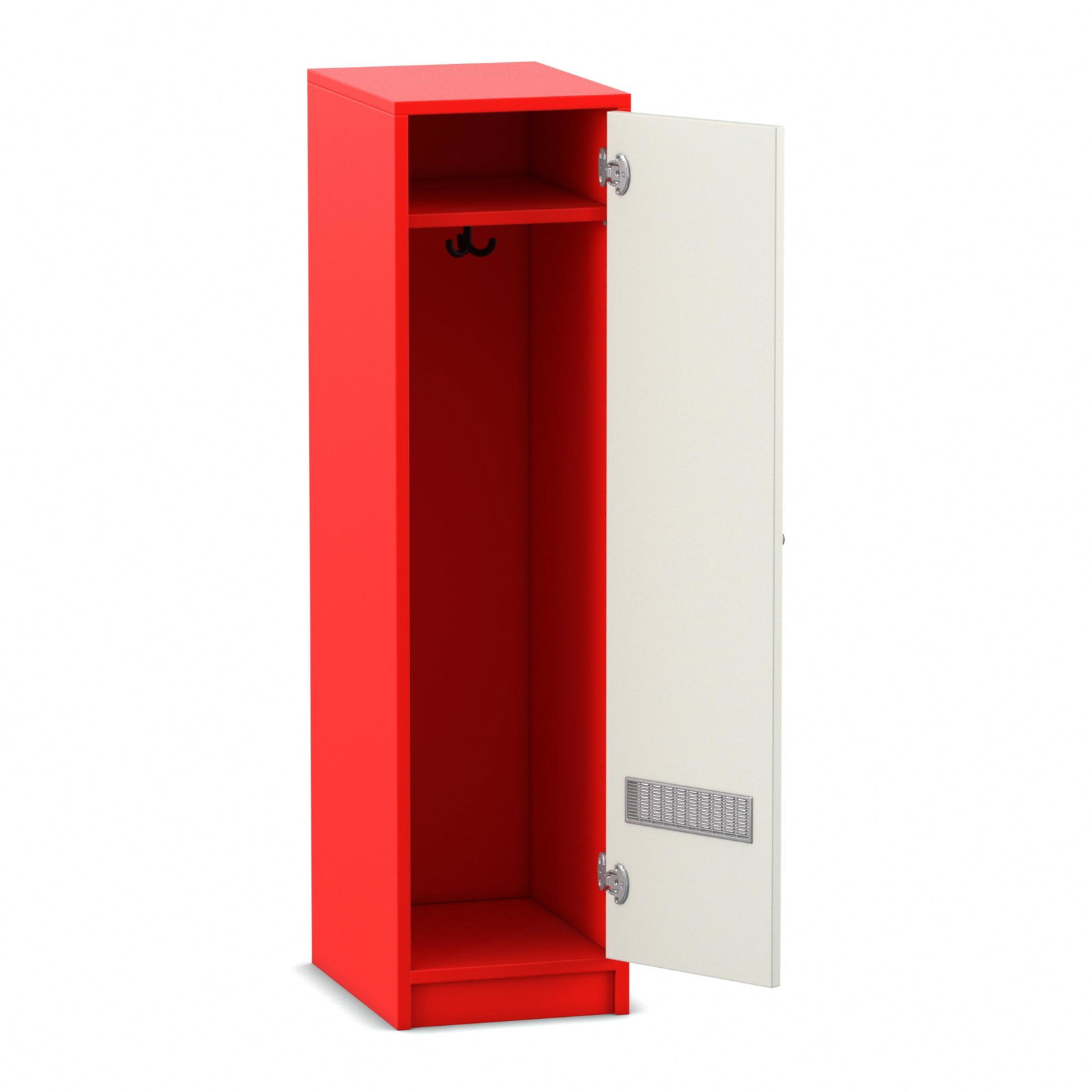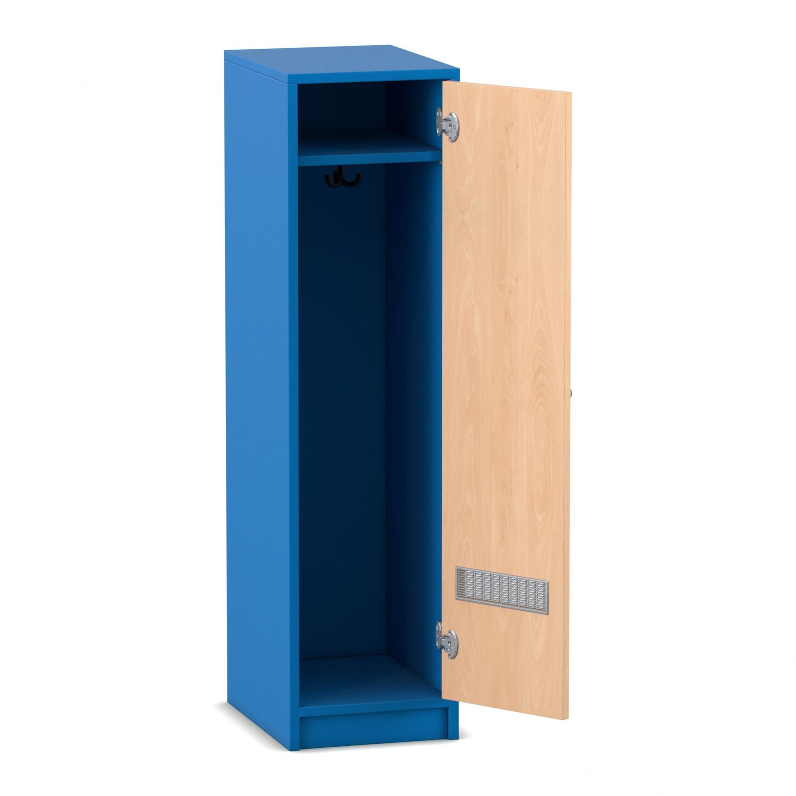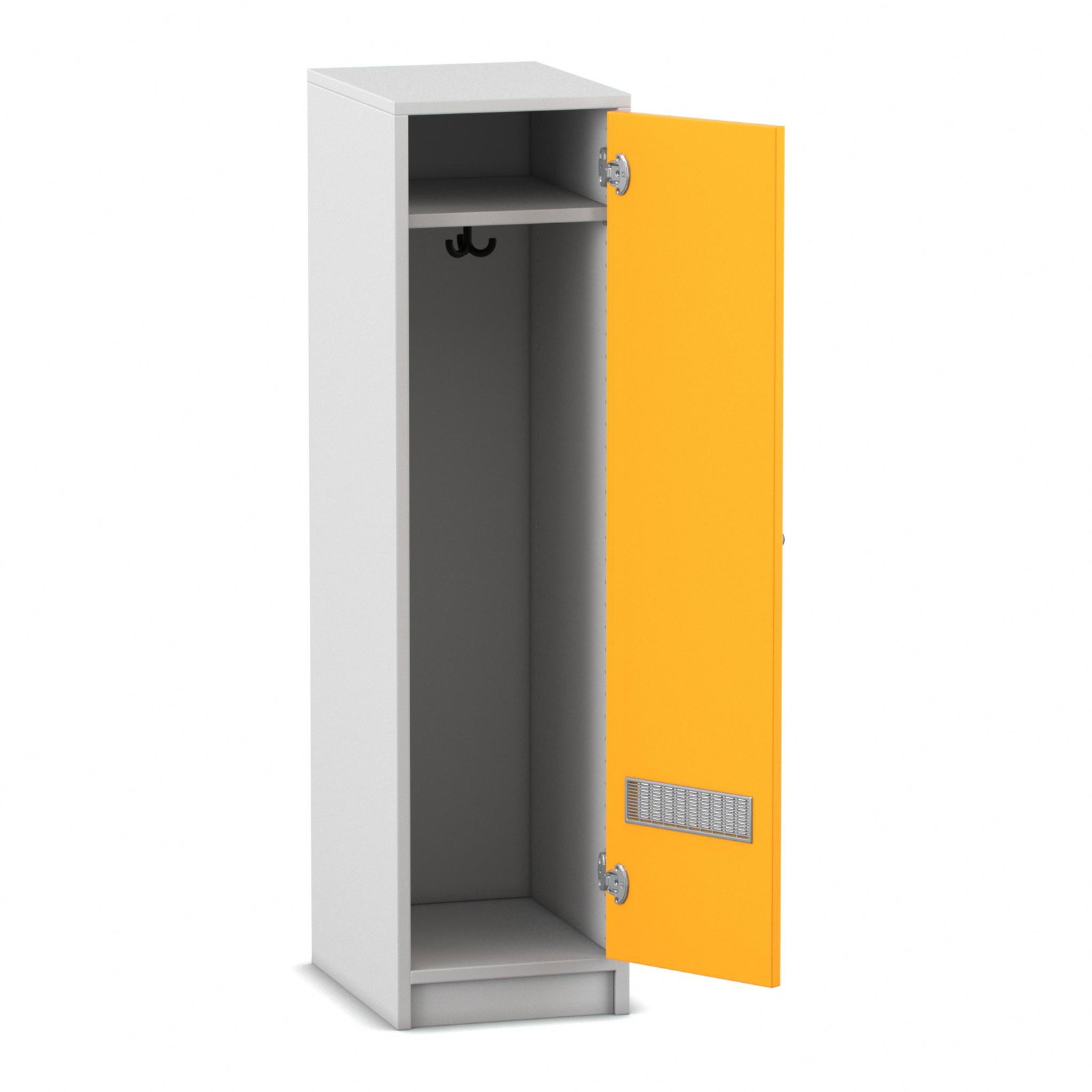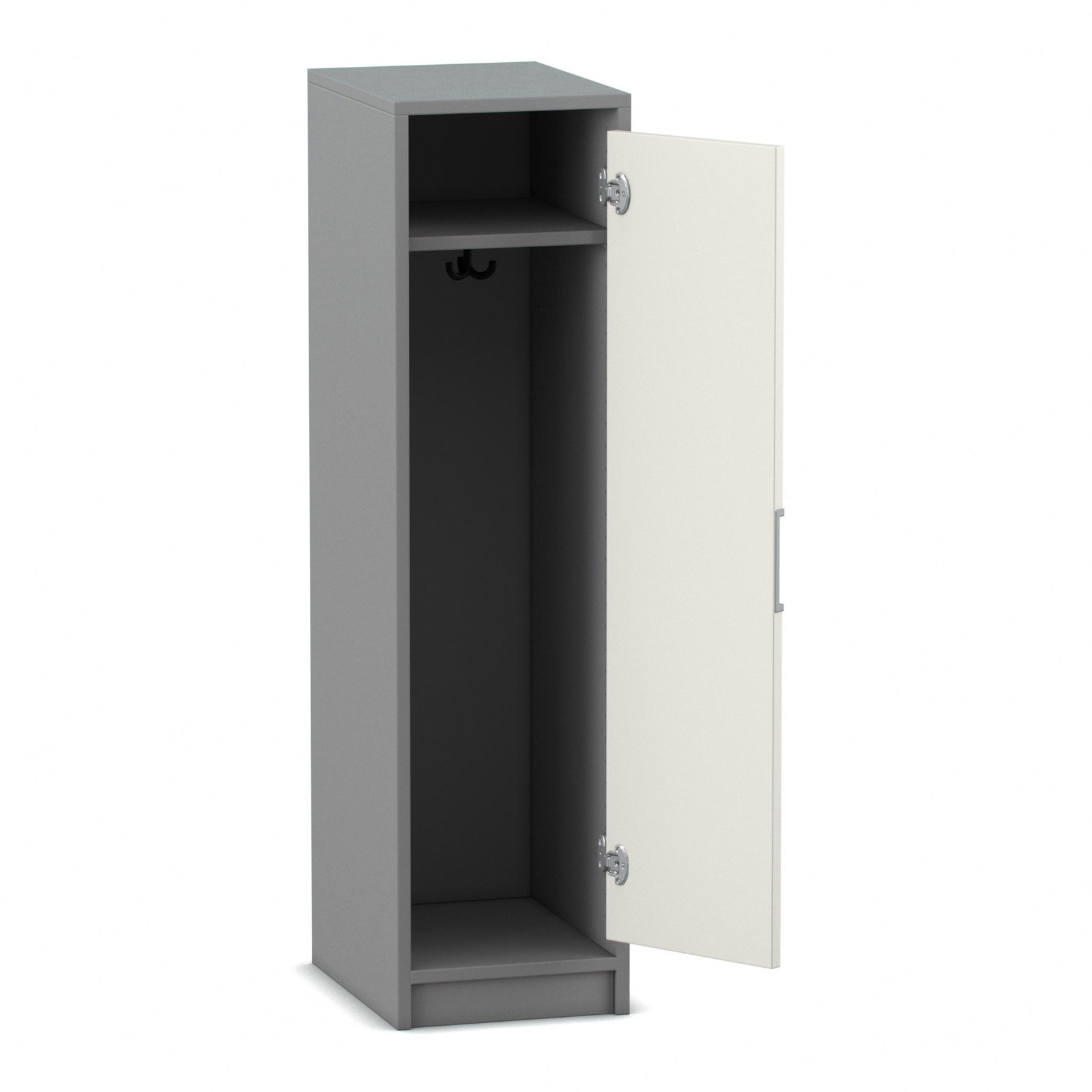 Im Inneren überzeugt der einreihige Schrank durch eine klare Aufteilung. Ein flexibel verstellbarer Fachboden schafft Platz für Rucksäcke oder kleine Schätze, während der robuste Dreifachhaken aus Kunststoff dicke Jacken und Matschhosen sicher aufnimmt. Um unangenehme Gerüche oder feuchte Kleidung zu vermeiden, verfügt der Garderobenschrank über clevere Belüftungskonzepte. Wählen Sie die Ausführung mit praktischem Muschelgriff, erhalten Sie eine verkürzte Tür, die oben und unten natürliche Lüftungsschlitze bildet. Bevorzugen Sie das sichere Zahlenschloss, schließt die Tür bündig mit dem Korpus ab, während ein fest verbautes Lüftungsgitter für eine stetige Luftzirkulation sorgt. Den Türanschlag können Sie passend zu Ihren Räumen ganz flexibel links oder rechts wählen.