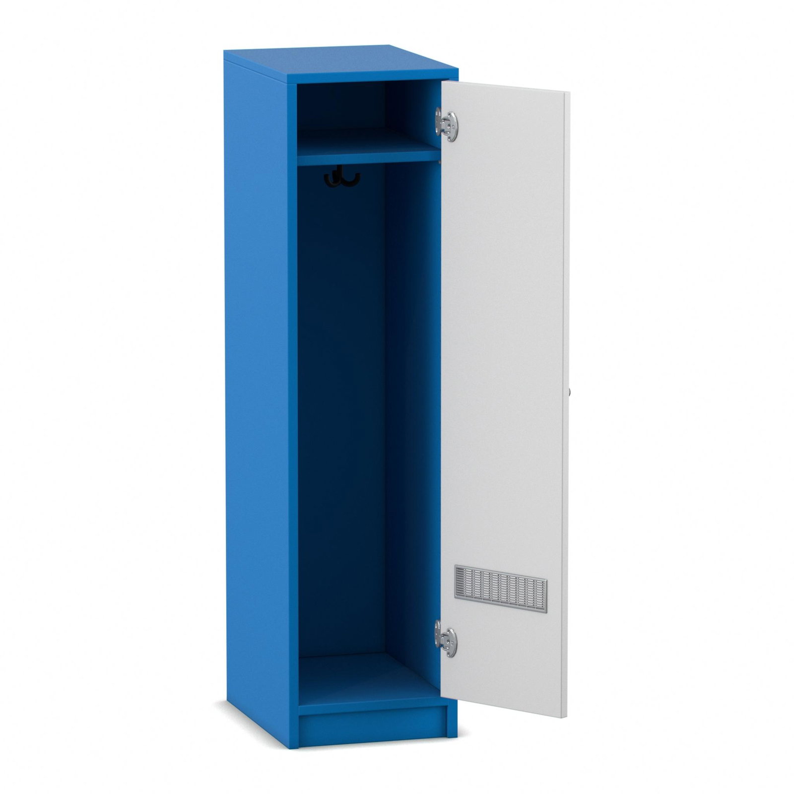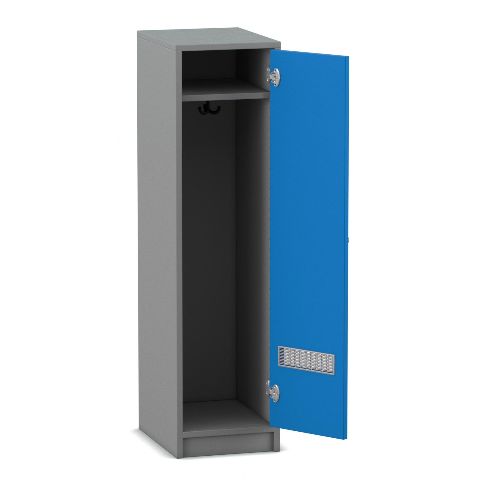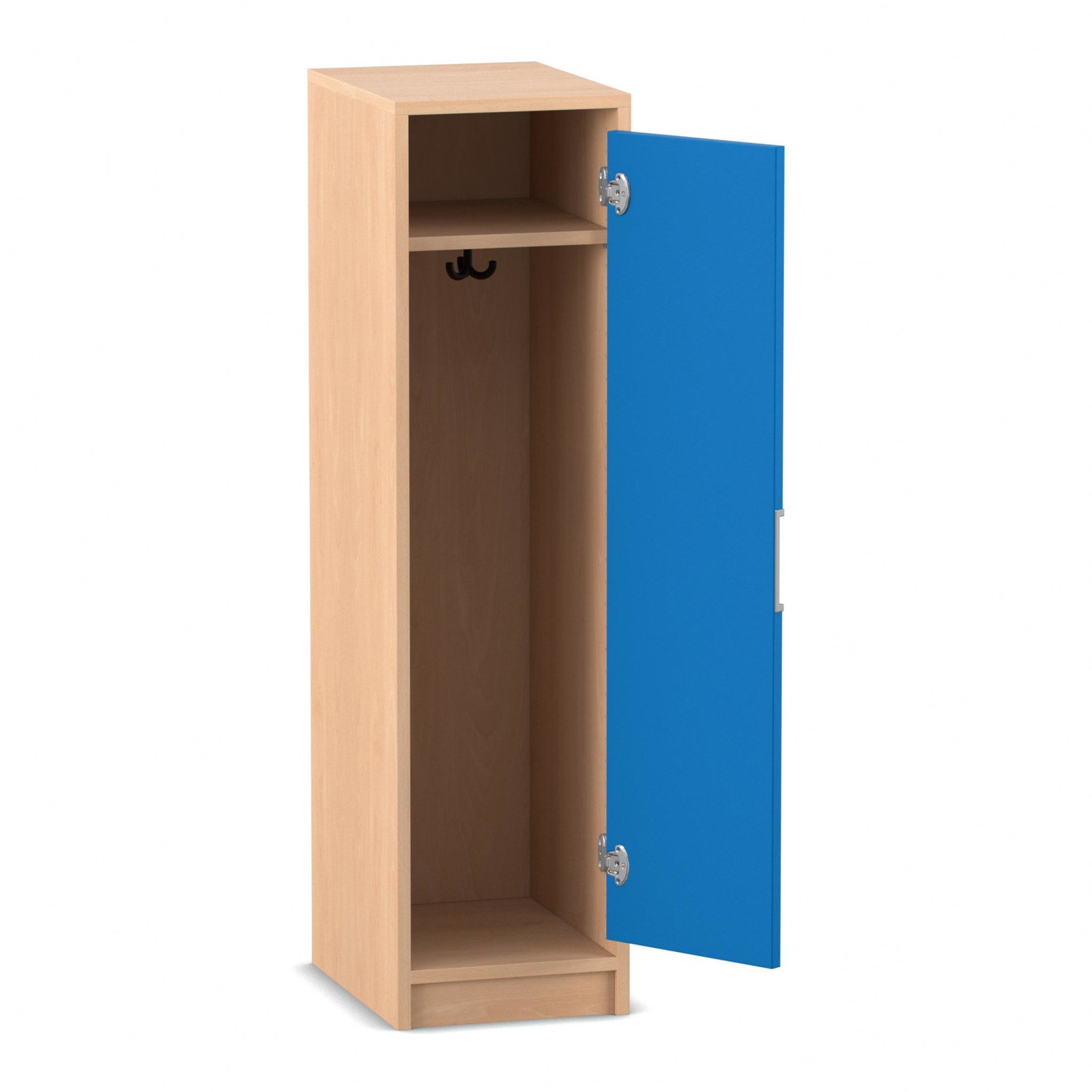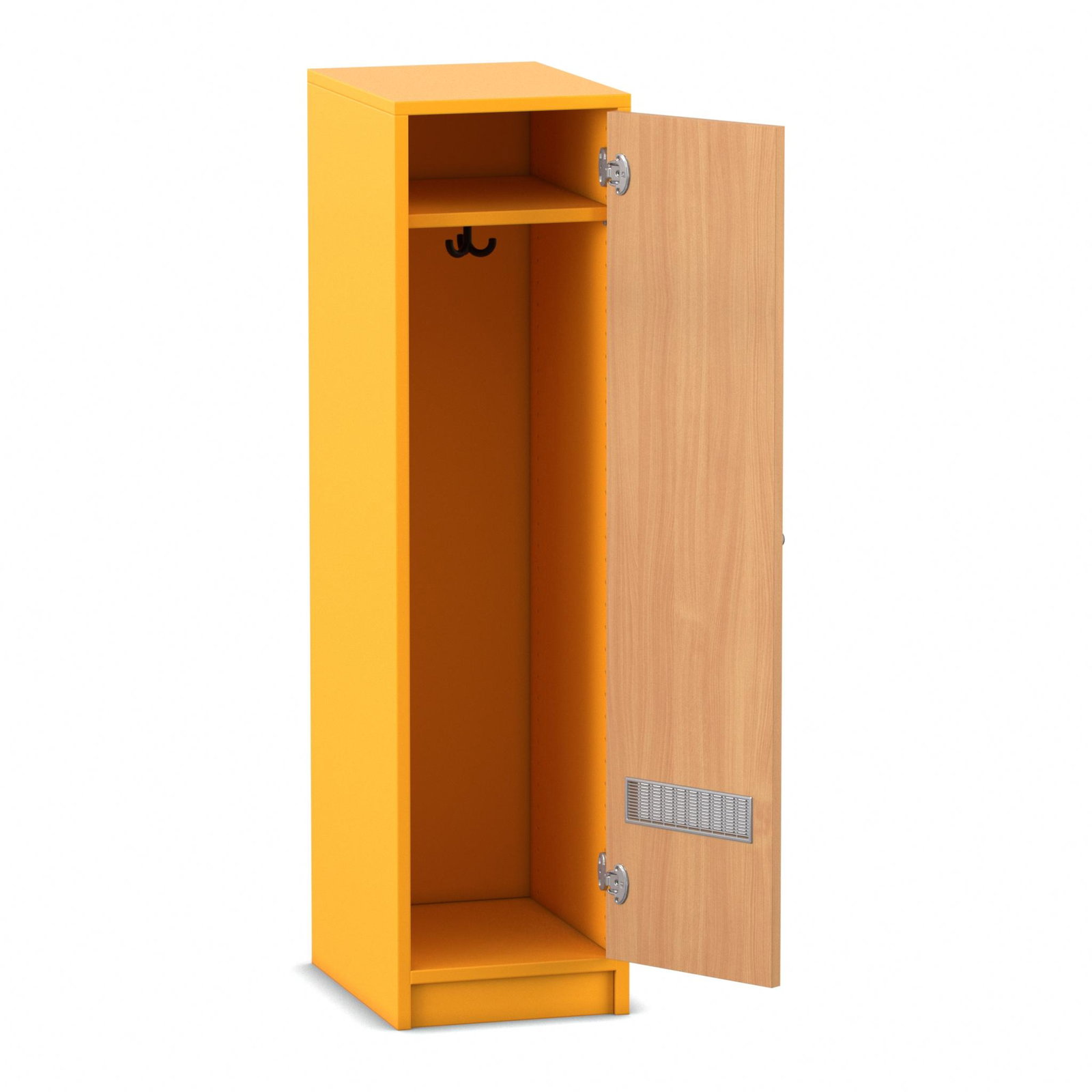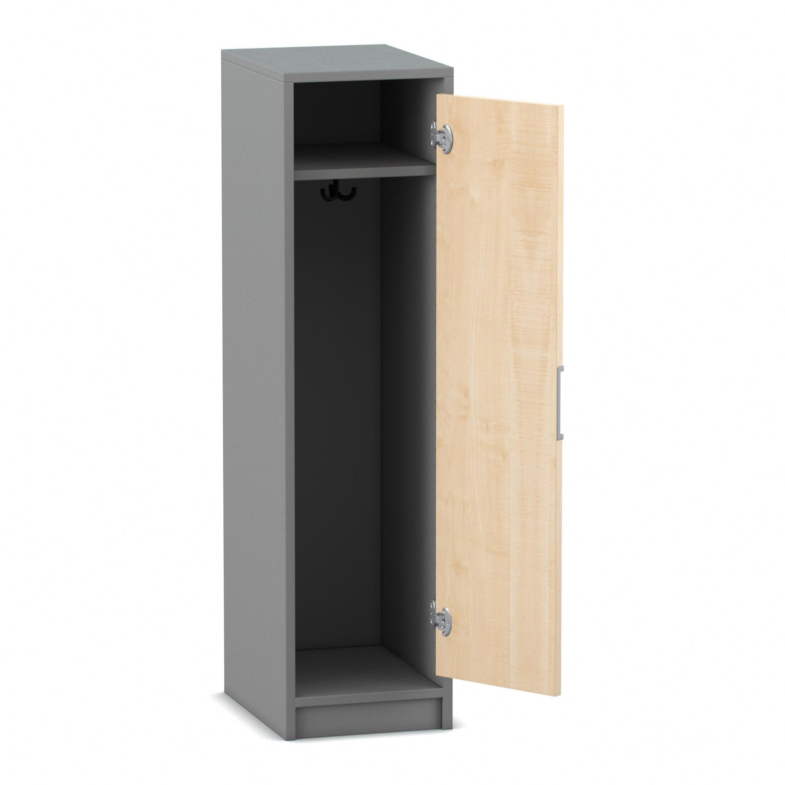 Im Inneren überzeugt der einreihige Schrank durch eine klare Aufteilung. Ein flexibel verstellbarer Fachboden schafft Platz für Rucksäcke oder kleine Schätze, während der robuste Dreifachhaken aus Kunststoff dicke Jacken und Matschhosen sicher aufnimmt. Um unangenehme Gerüche oder feuchte Kleidung zu vermeiden, verfügt der Garderobenschrank über clevere Belüftungskonzepte. Wählen Sie die Ausführung mit praktischem Muschelgriff, erhalten Sie eine verkürzte Tür, die oben und unten natürliche Lüftungsschlitze bildet. Bevorzugen Sie das sichere Zahlenschloss, schließt die Tür bündig mit dem Korpus ab, während ein fest verbautes Lüftungsgitter für eine stetige Luftzirkulation sorgt. Den Türanschlag können Sie passend zu Ihren Räumen ganz flexibel links oder rechts wählen.