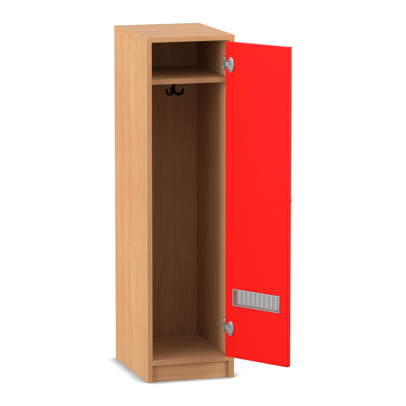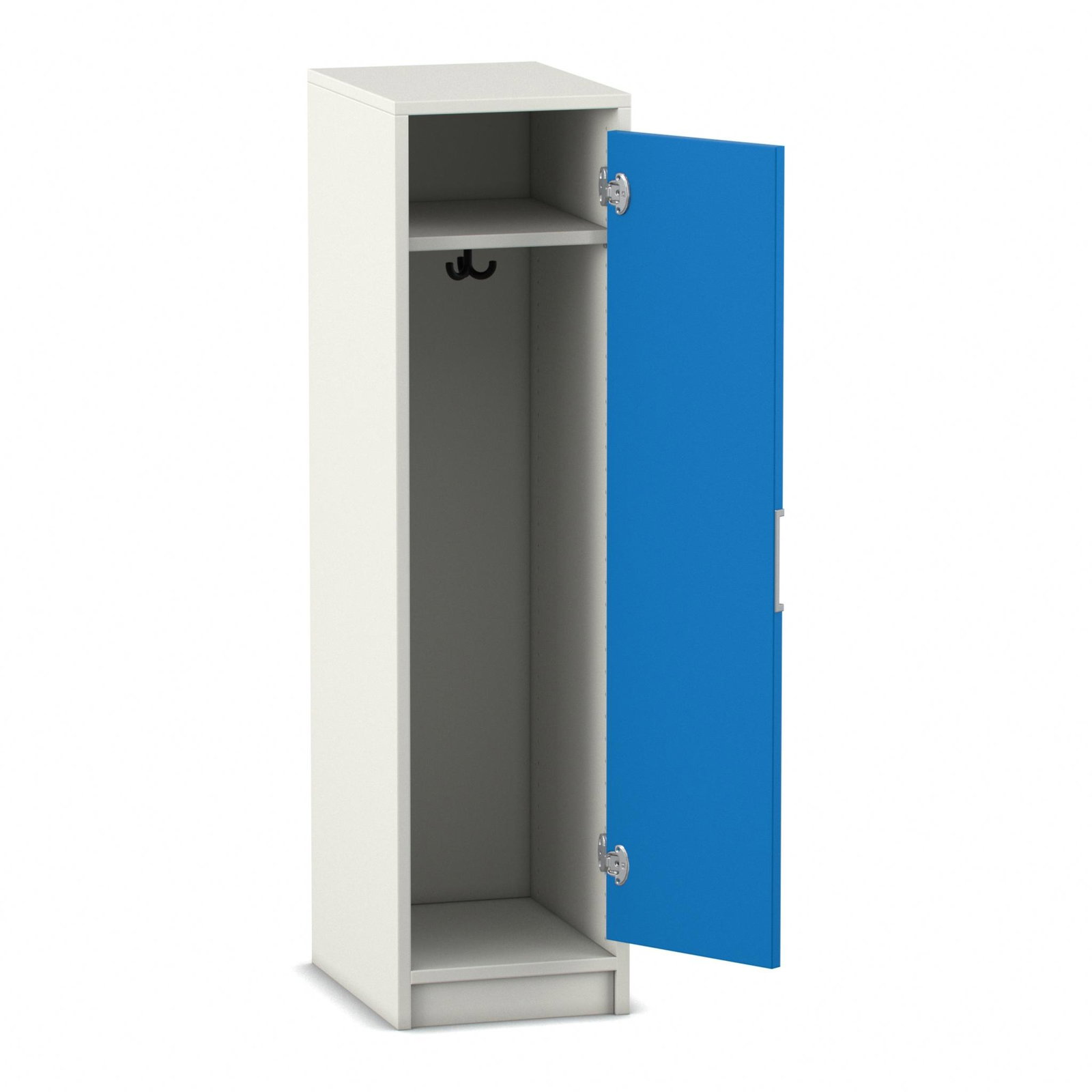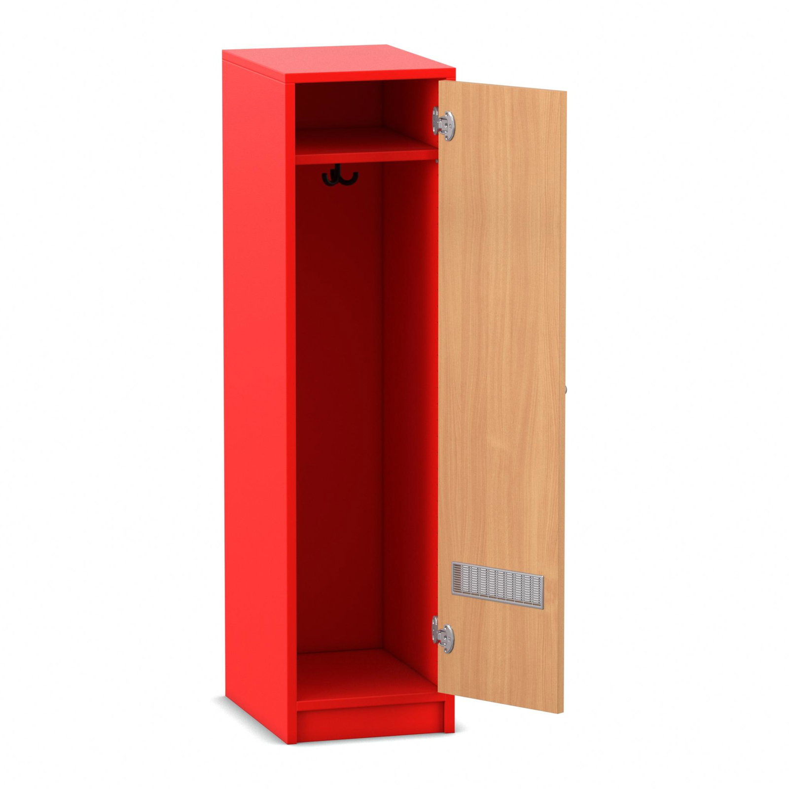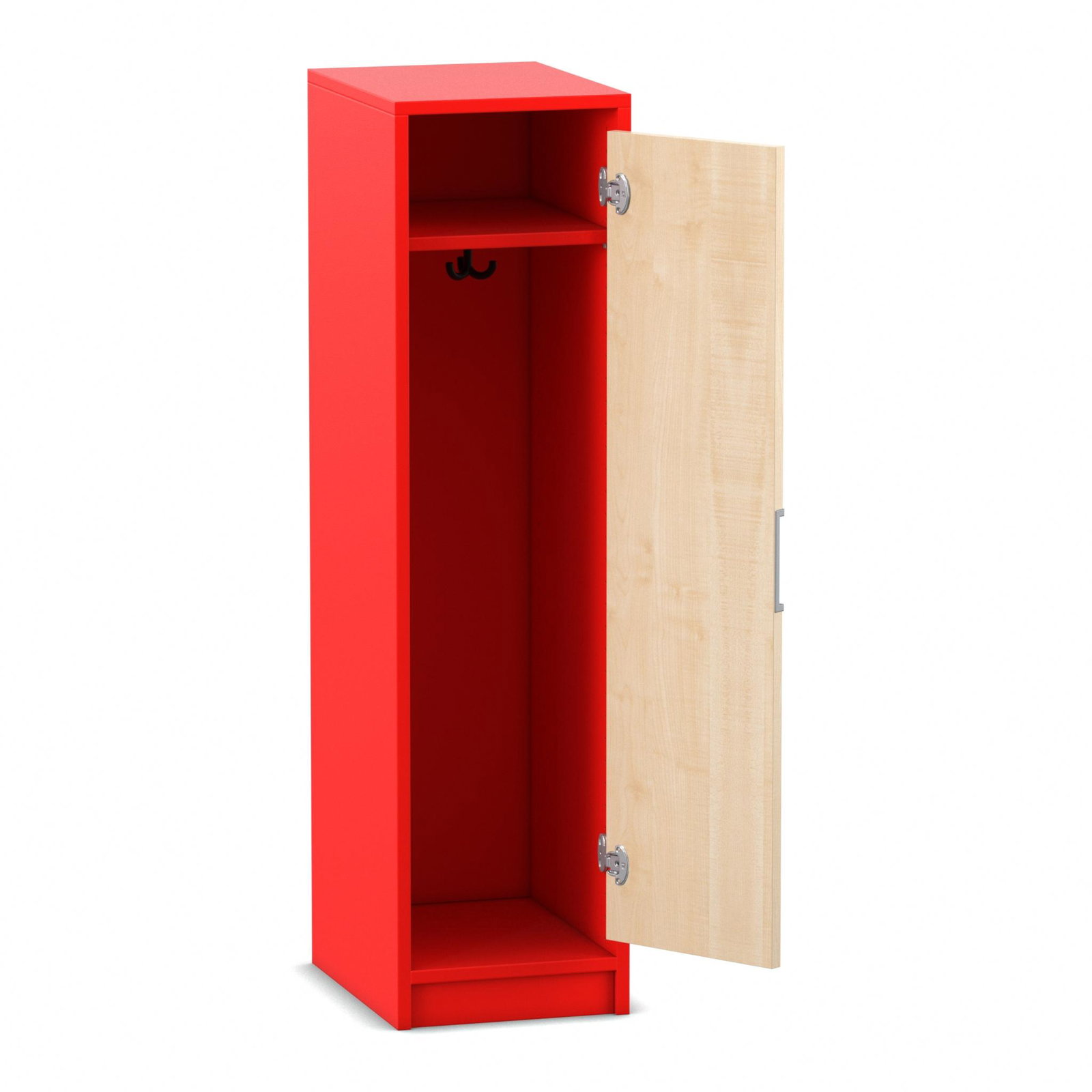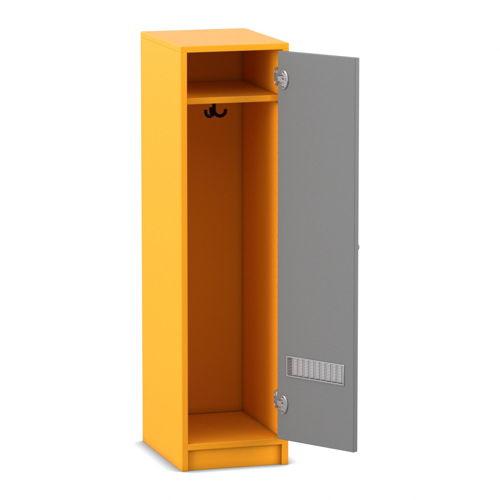 Im Inneren überzeugt der einreihige Schrank durch eine klare Aufteilung. Ein flexibel verstellbarer Fachboden schafft Platz für Rucksäcke oder kleine Schätze, während der robuste Dreifachhaken aus Kunststoff dicke Jacken und Matschhosen sicher aufnimmt. Um unangenehme Gerüche oder feuchte Kleidung zu vermeiden, verfügt der Garderobenschrank über clevere Belüftungskonzepte. Wählen Sie die Ausführung mit praktischem Muschelgriff, erhalten Sie eine verkürzte Tür, die oben und unten natürliche Lüftungsschlitze bildet. Bevorzugen Sie das sichere Zahlenschloss, schließt die Tür bündig mit dem Korpus ab, während ein fest verbautes Lüftungsgitter für eine stetige Luftzirkulation sorgt. Den Türanschlag können Sie passend zu Ihren Räumen ganz flexibel links oder rechts wählen.