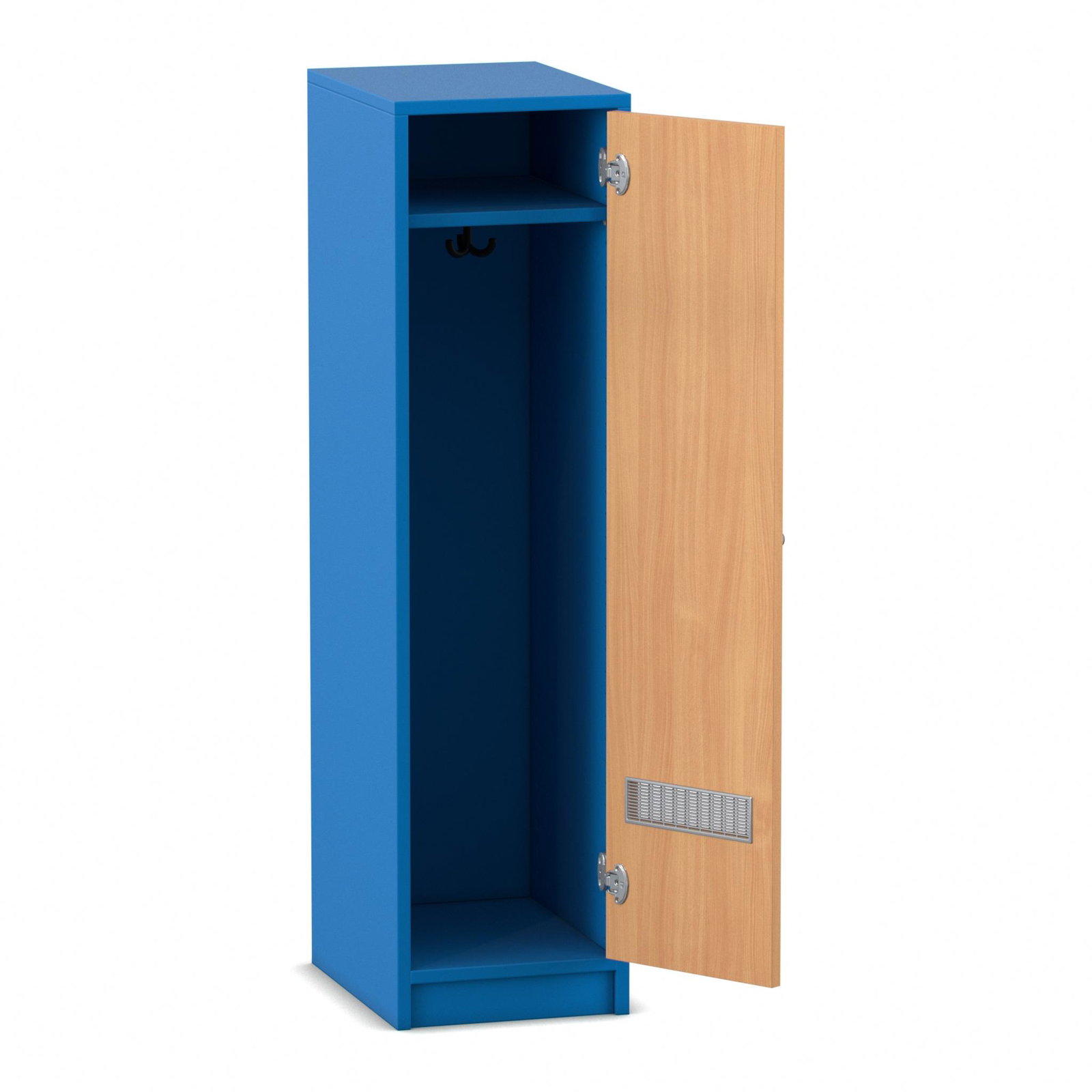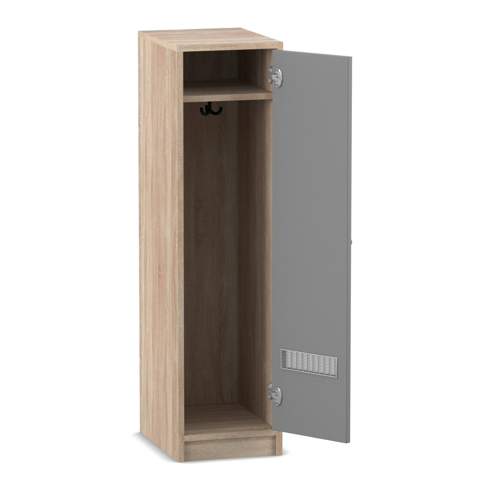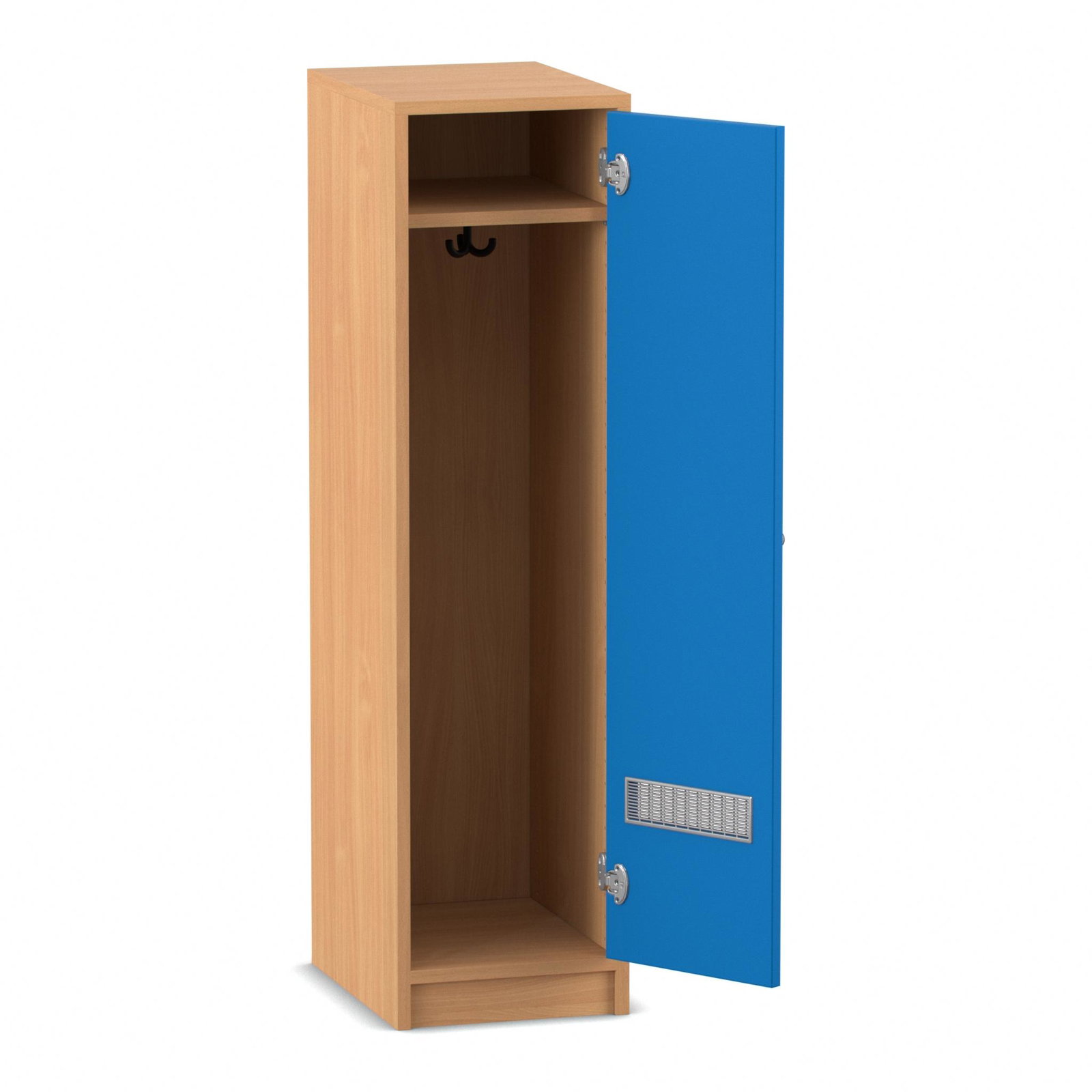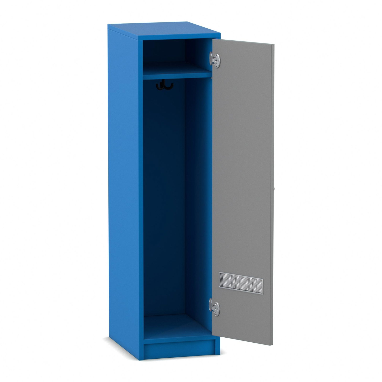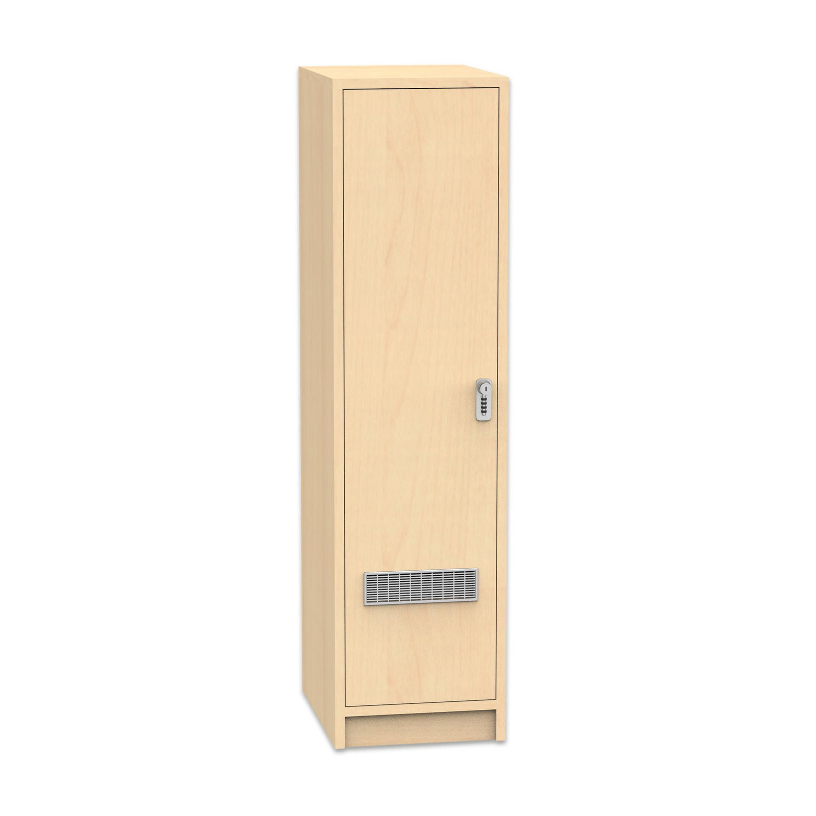 Im Inneren überzeugt der einreihige Schrank durch eine klare Aufteilung. Ein flexibel verstellbarer Fachboden schafft Platz für Rucksäcke oder kleine Schätze, während der robuste Dreifachhaken aus Kunststoff dicke Jacken und Matschhosen sicher aufnimmt. Um unangenehme Gerüche oder feuchte Kleidung zu vermeiden, verfügt der Garderobenschrank über clevere Belüftungskonzepte. Wählen Sie die Ausführung mit praktischem Muschelgriff, erhalten Sie eine verkürzte Tür, die oben und unten natürliche Lüftungsschlitze bildet. Bevorzugen Sie das sichere Zahlenschloss, schließt die Tür bündig mit dem Korpus ab, während ein fest verbautes Lüftungsgitter für eine stetige Luftzirkulation sorgt. Den Türanschlag können Sie passend zu Ihren Räumen ganz flexibel links oder rechts wählen.