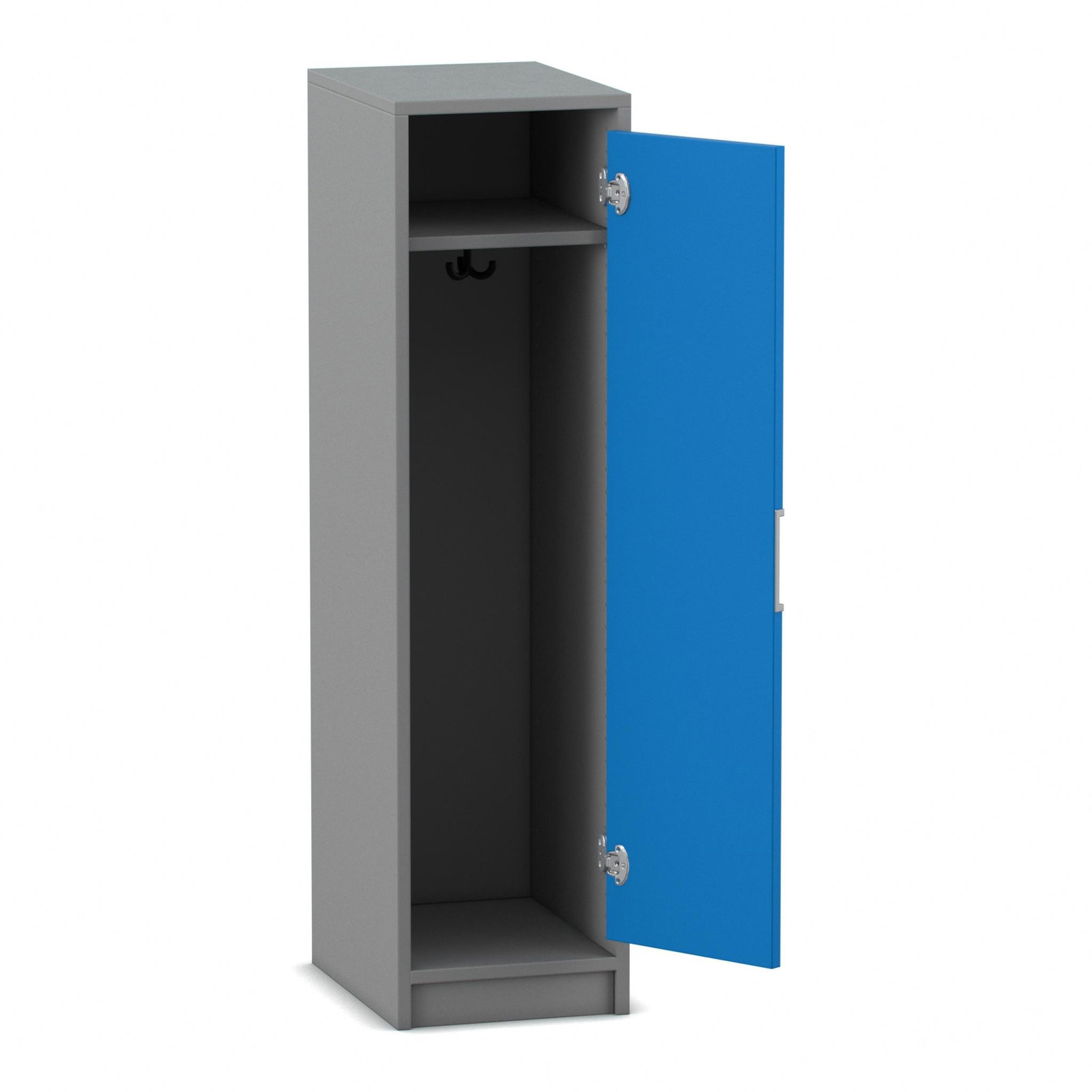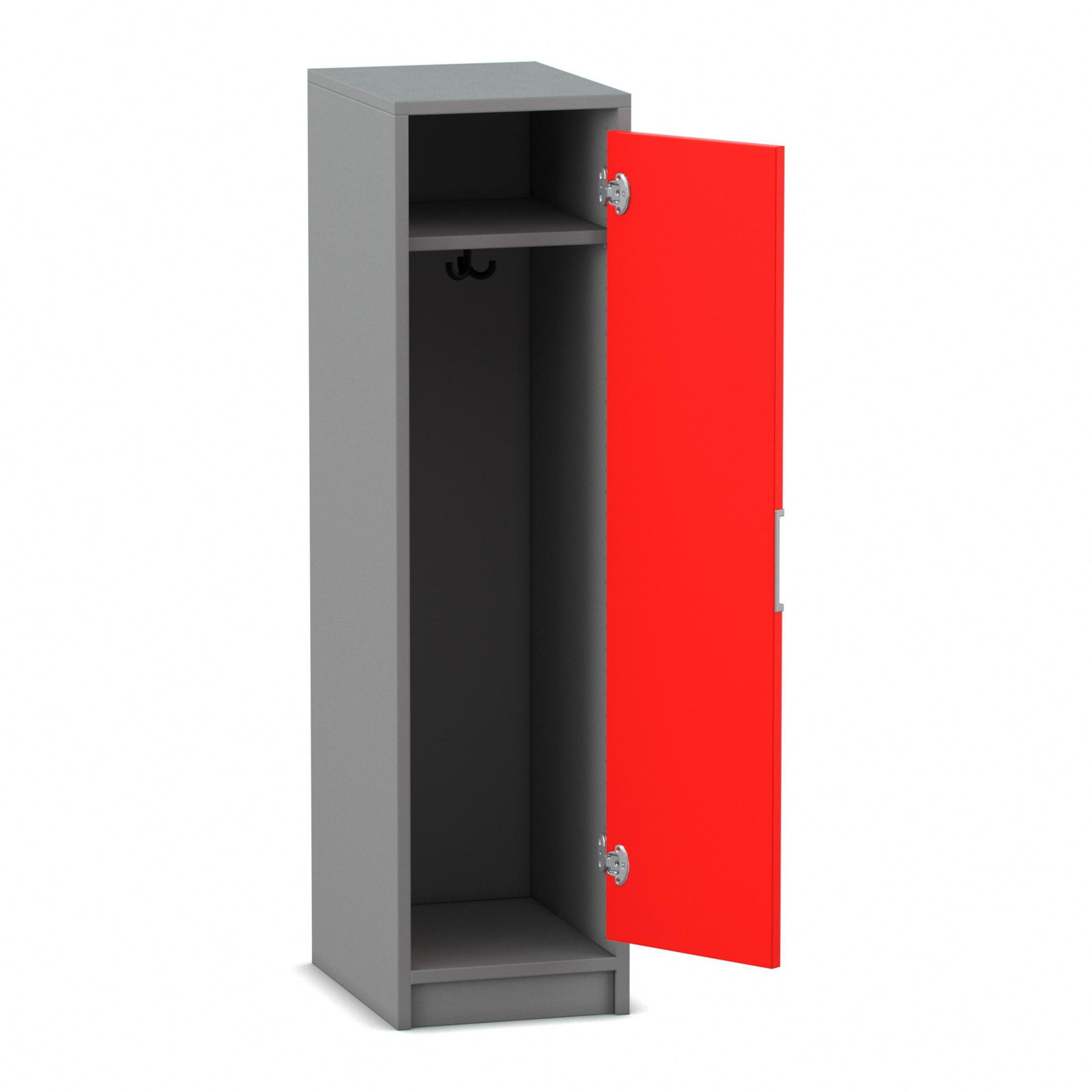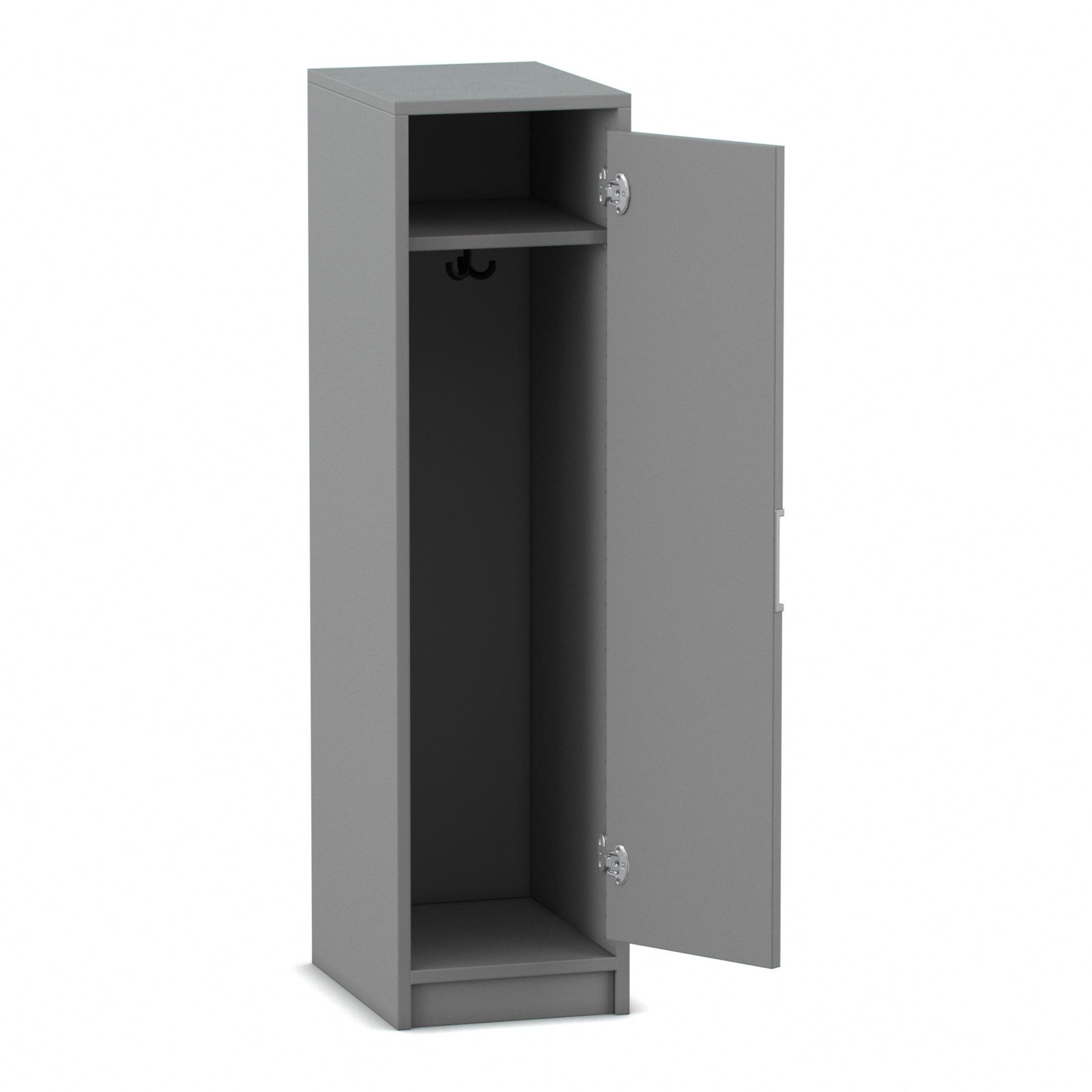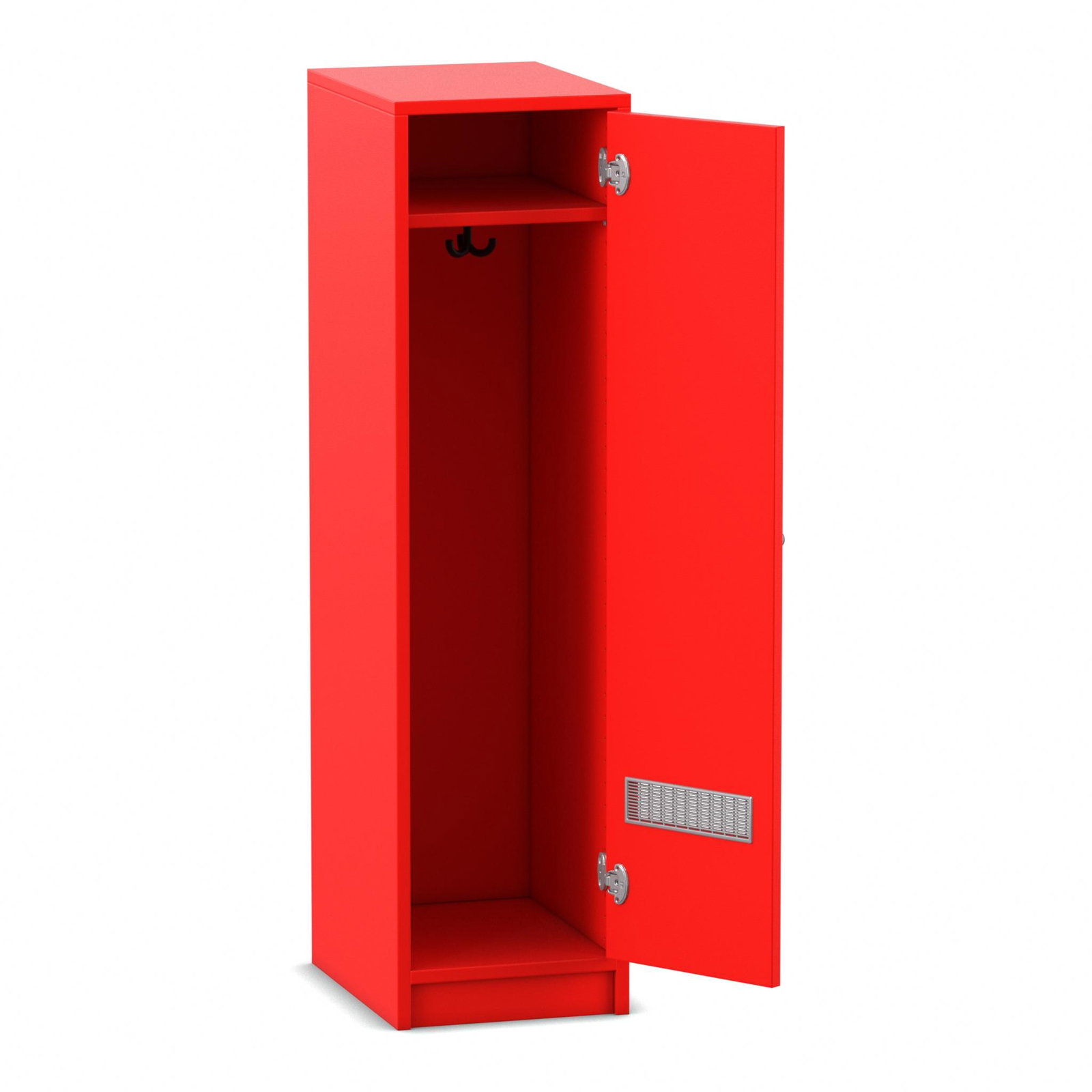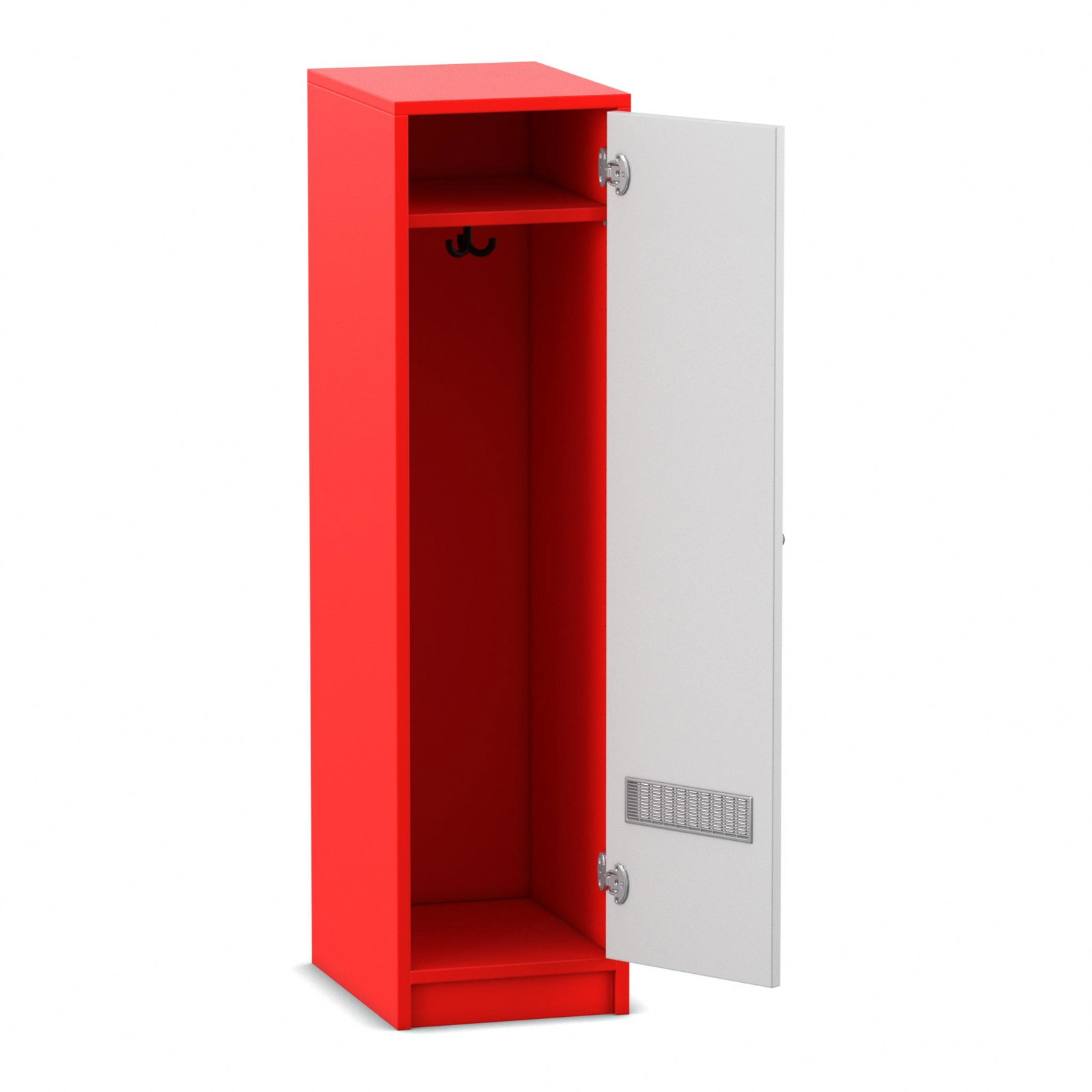 Im Inneren überzeugt der einreihige Schrank durch eine klare Aufteilung. Ein flexibel verstellbarer Fachboden schafft Platz für Rucksäcke oder kleine Schätze, während der robuste Dreifachhaken aus Kunststoff dicke Jacken und Matschhosen sicher aufnimmt. Um unangenehme Gerüche oder feuchte Kleidung zu vermeiden, verfügt der Garderobenschrank über clevere Belüftungskonzepte. Wählen Sie die Ausführung mit praktischem Muschelgriff, erhalten Sie eine verkürzte Tür, die oben und unten natürliche Lüftungsschlitze bildet. Bevorzugen Sie das sichere Zahlenschloss, schließt die Tür bündig mit dem Korpus ab, während ein fest verbautes Lüftungsgitter für eine stetige Luftzirkulation sorgt. Den Türanschlag können Sie passend zu Ihren Räumen ganz flexibel links oder rechts wählen.