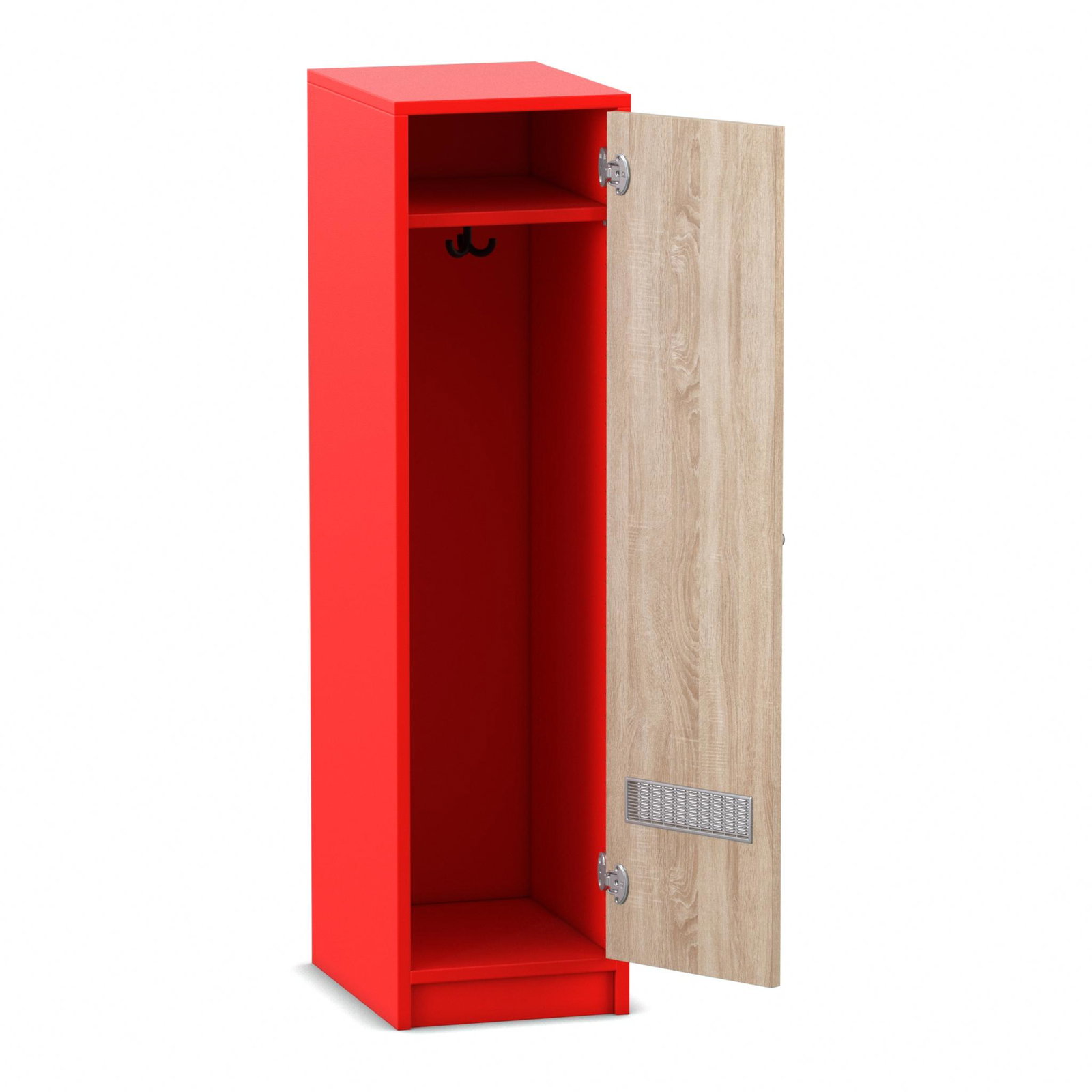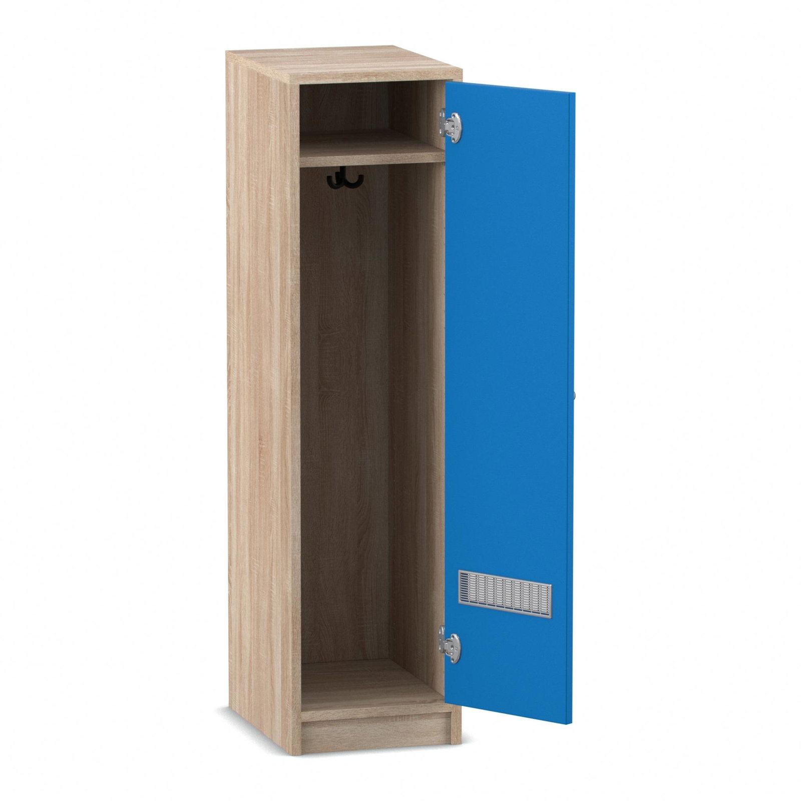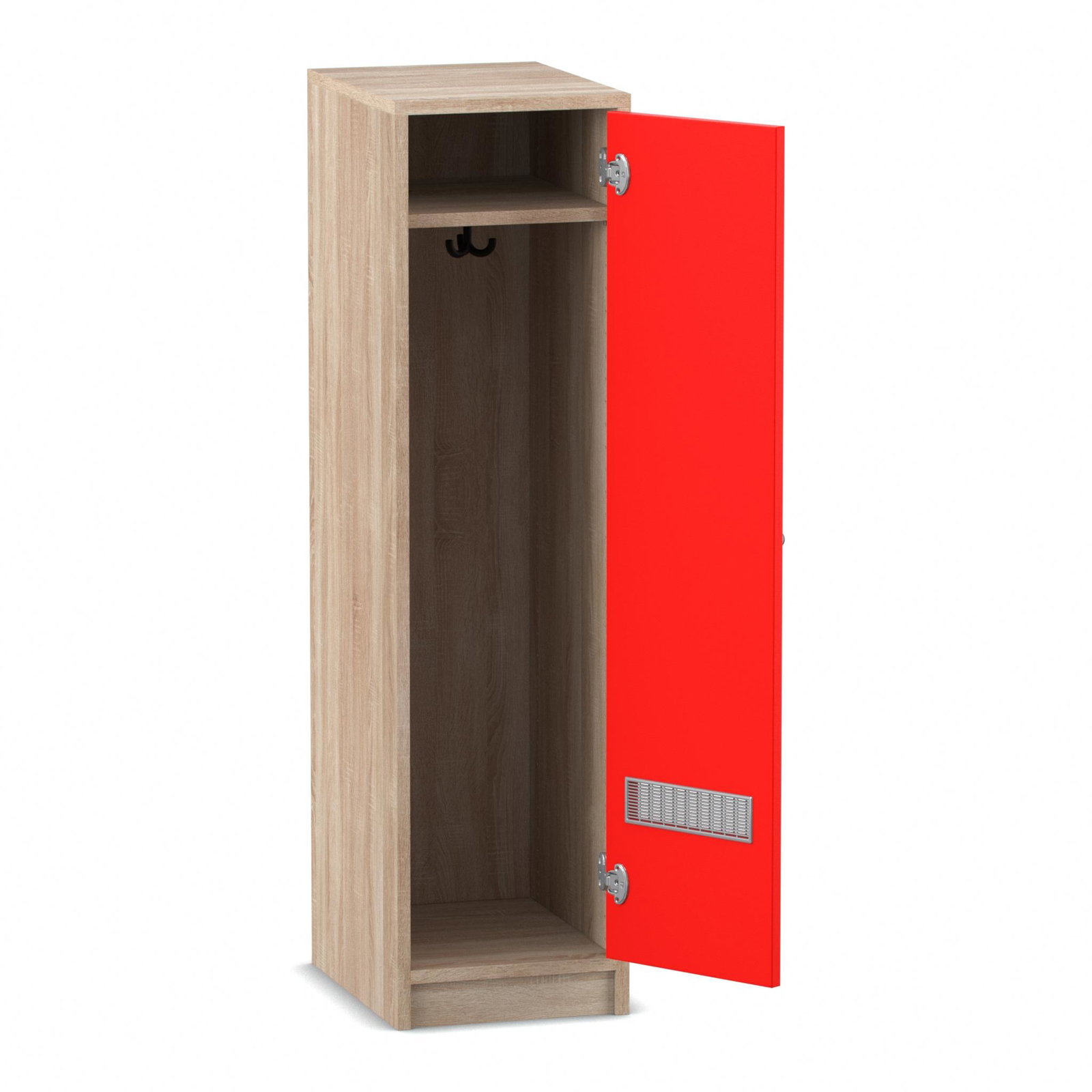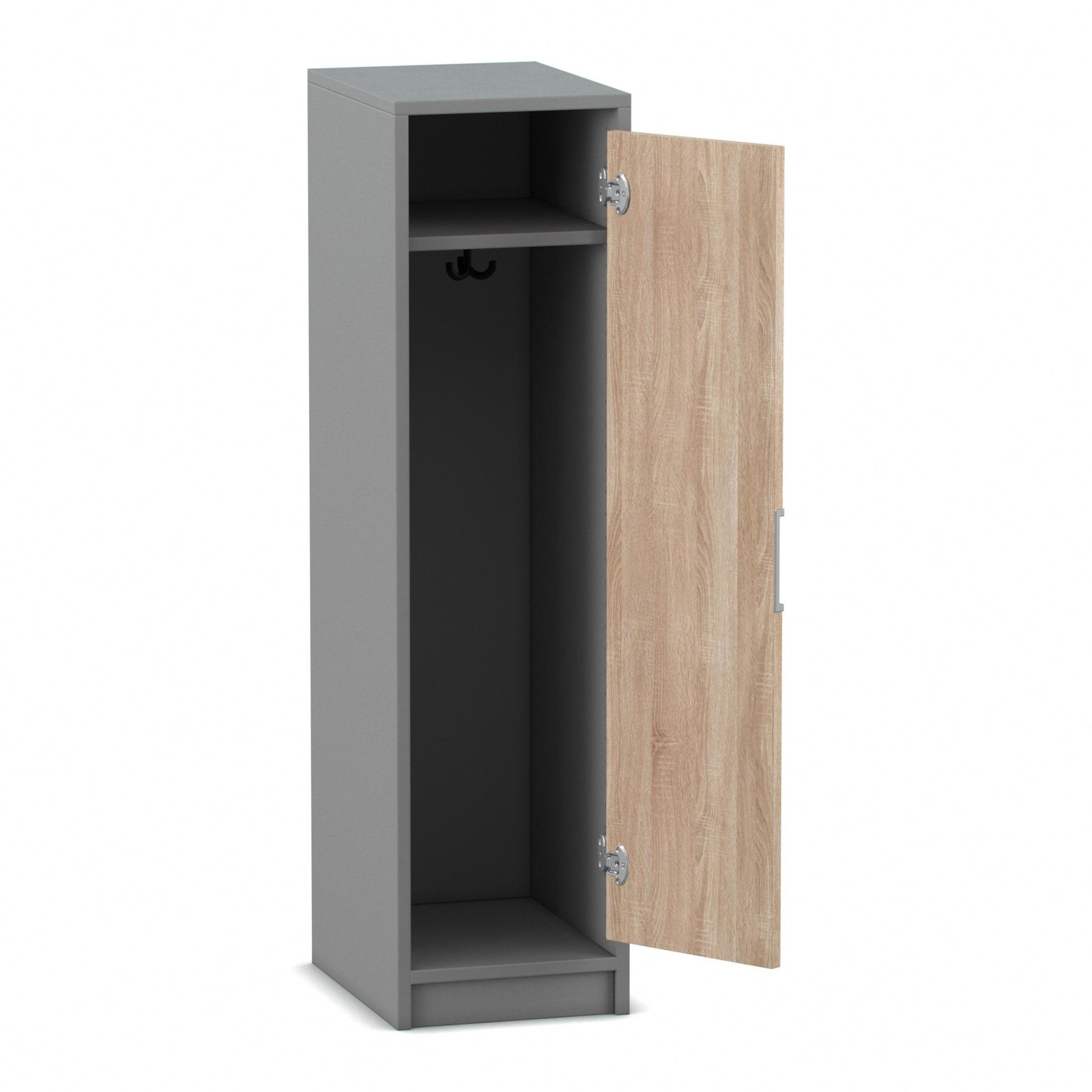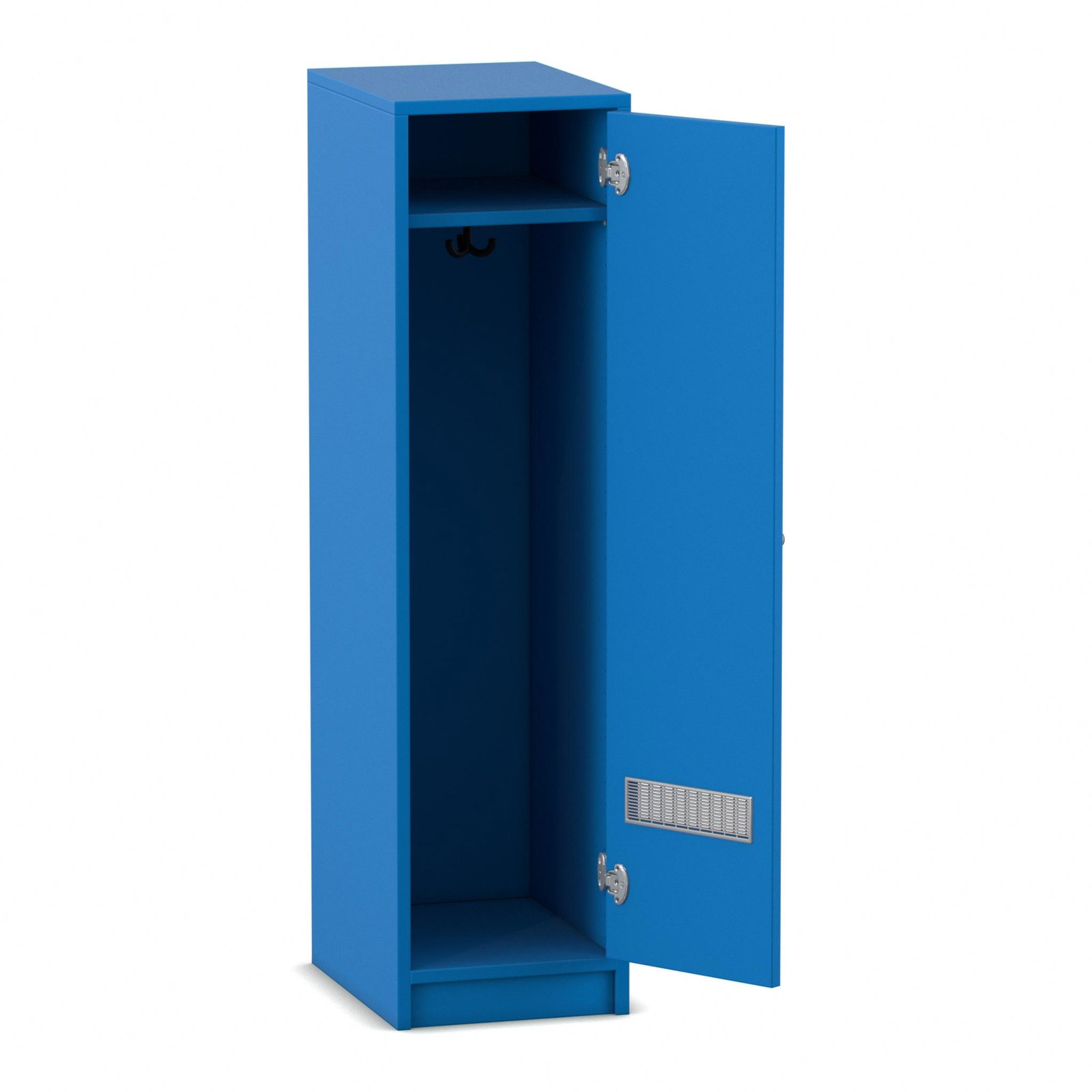 Im Inneren überzeugt der einreihige Schrank durch eine klare Aufteilung. Ein flexibel verstellbarer Fachboden schafft Platz für Rucksäcke oder kleine Schätze, während der robuste Dreifachhaken aus Kunststoff dicke Jacken und Matschhosen sicher aufnimmt. Um unangenehme Gerüche oder feuchte Kleidung zu vermeiden, verfügt der Garderobenschrank über clevere Belüftungskonzepte. Wählen Sie die Ausführung mit praktischem Muschelgriff, erhalten Sie eine verkürzte Tür, die oben und unten natürliche Lüftungsschlitze bildet. Bevorzugen Sie das sichere Zahlenschloss, schließt die Tür bündig mit dem Korpus ab, während ein fest verbautes Lüftungsgitter für eine stetige Luftzirkulation sorgt. Den Türanschlag können Sie passend zu Ihren Räumen ganz flexibel links oder rechts wählen.