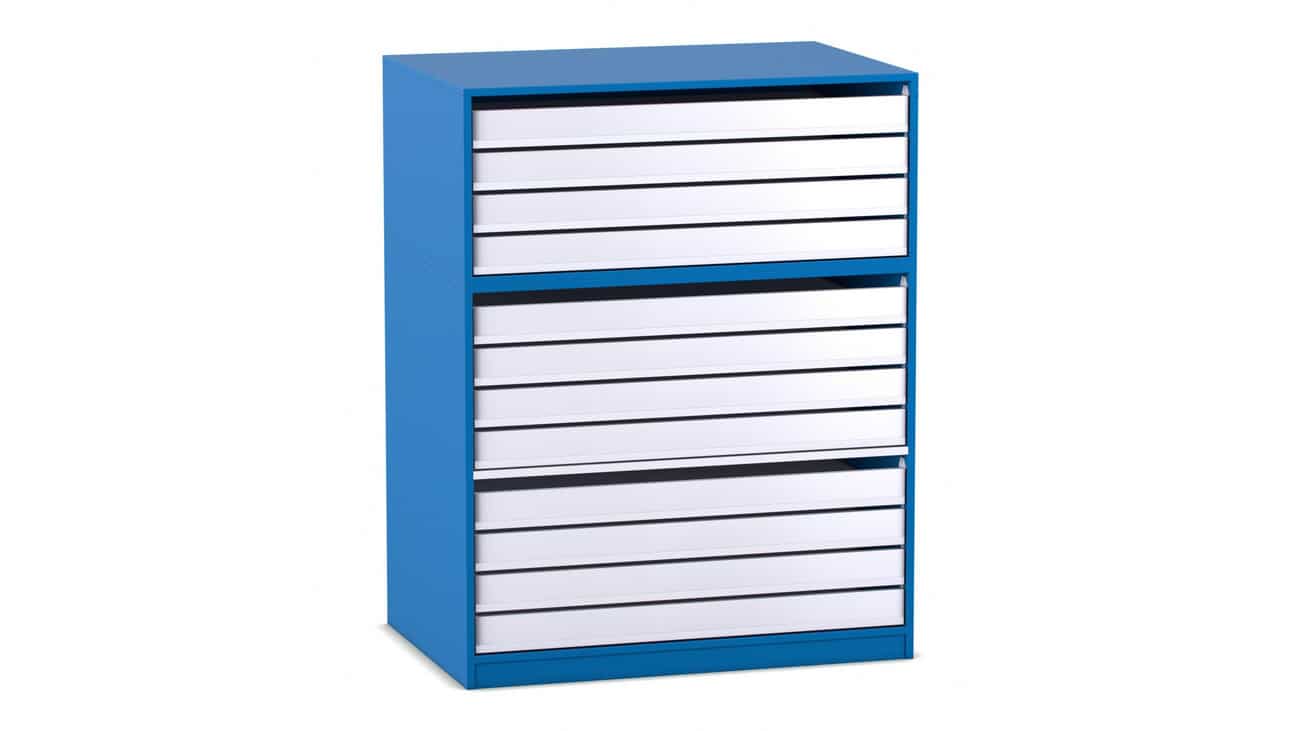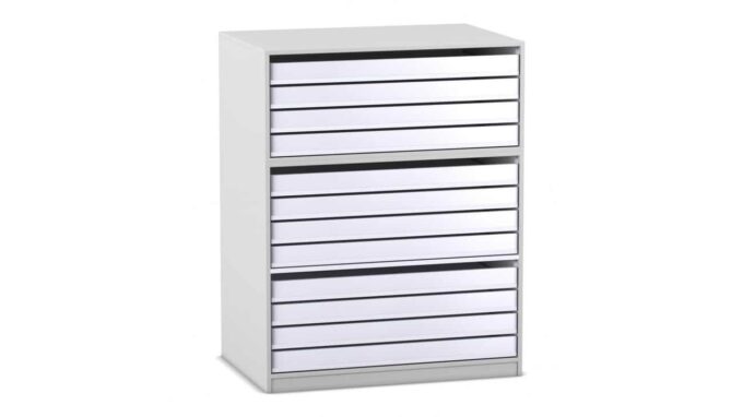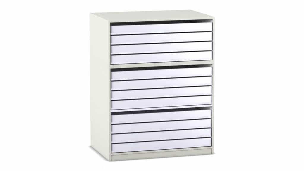 Der Flexeo® Schrank bietet jede Menge Stauraum für Papiere bis zu einem Format von DIN A1. Die 12 großen Auszüge sind nicht nur geräumig, sondern auch mit praktischen Grifflöchern ausgestattet, die ein bequemes Öffnen und Schließen ermöglichen. Dank der integrierten Sicherheitsschiene lässt sich immer nur ein Auszug gleichzeitig öffnen, wodurch Risiken einer Kippgefahr minimiert werden.