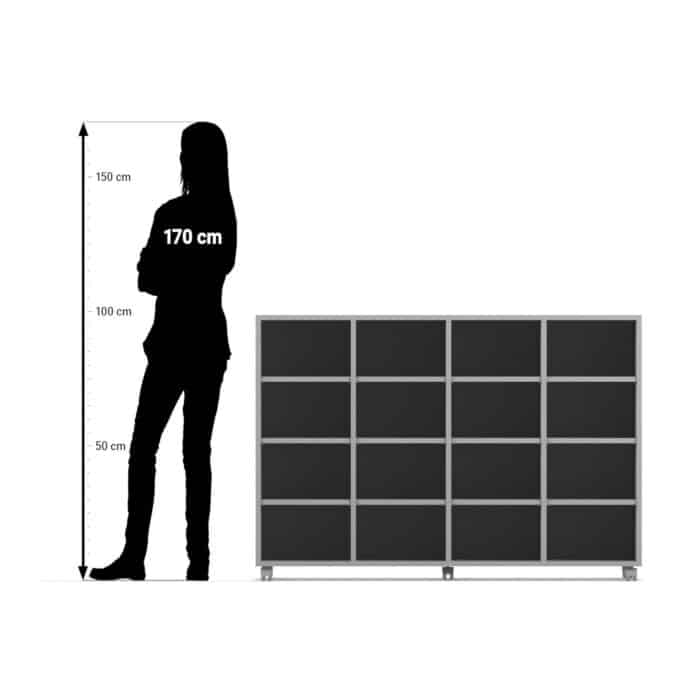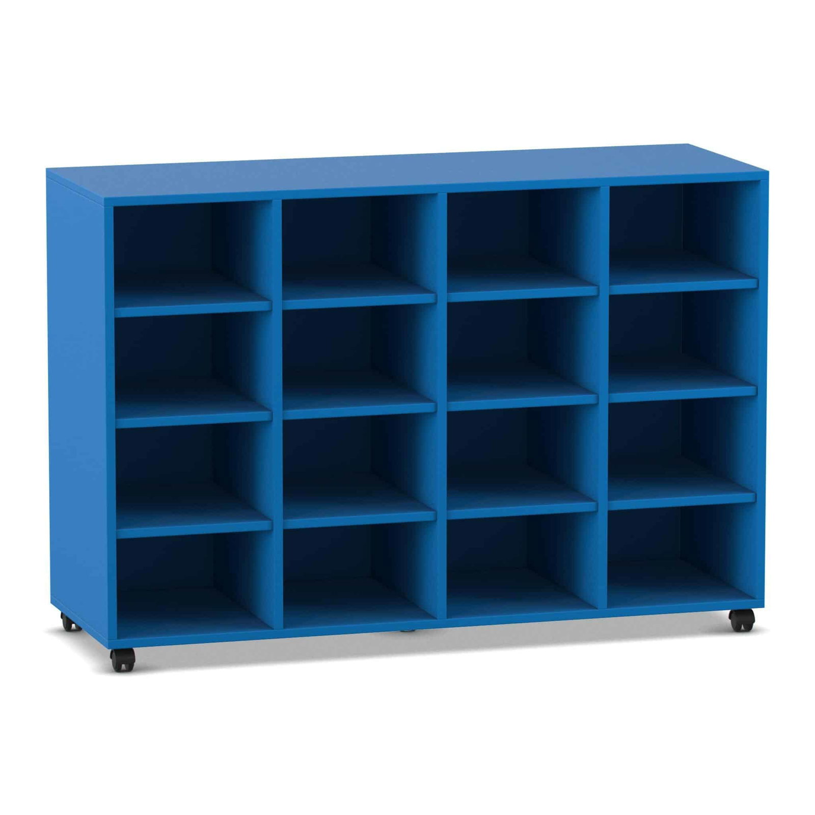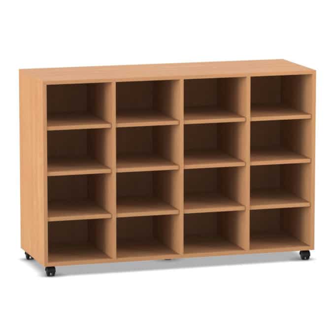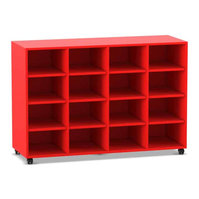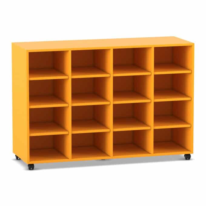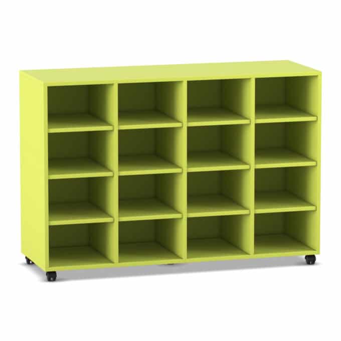 Setzen Sie neue Maßstäbe in Sachen Ordnung und Flexibilität mit dem Flexeo® Regal PRO. Dieses enorm stabile und vielseitige Regalsystem wurde entwickelt, um den dynamischen Anforderungen moderner Klassenzimmer, Gruppenräume und Bibliotheken gerecht zu werden. Mit 16 geräumigen Fächern, die auf vier Reihen verteilt sind, bietet es maximalen Stauraum auf optimaler Höhe. Seine besondere Stärke liegt nicht nur in der robusten Konstruktion, sondern auch in seiner Fähigkeit, als stilvoller Raumteiler zu fungieren. Ob an der Wand oder frei im Raum stehend – dieses Regal schafft Struktur, fördert die Organisation und passt sich jeder Raumsituation perfekt an.