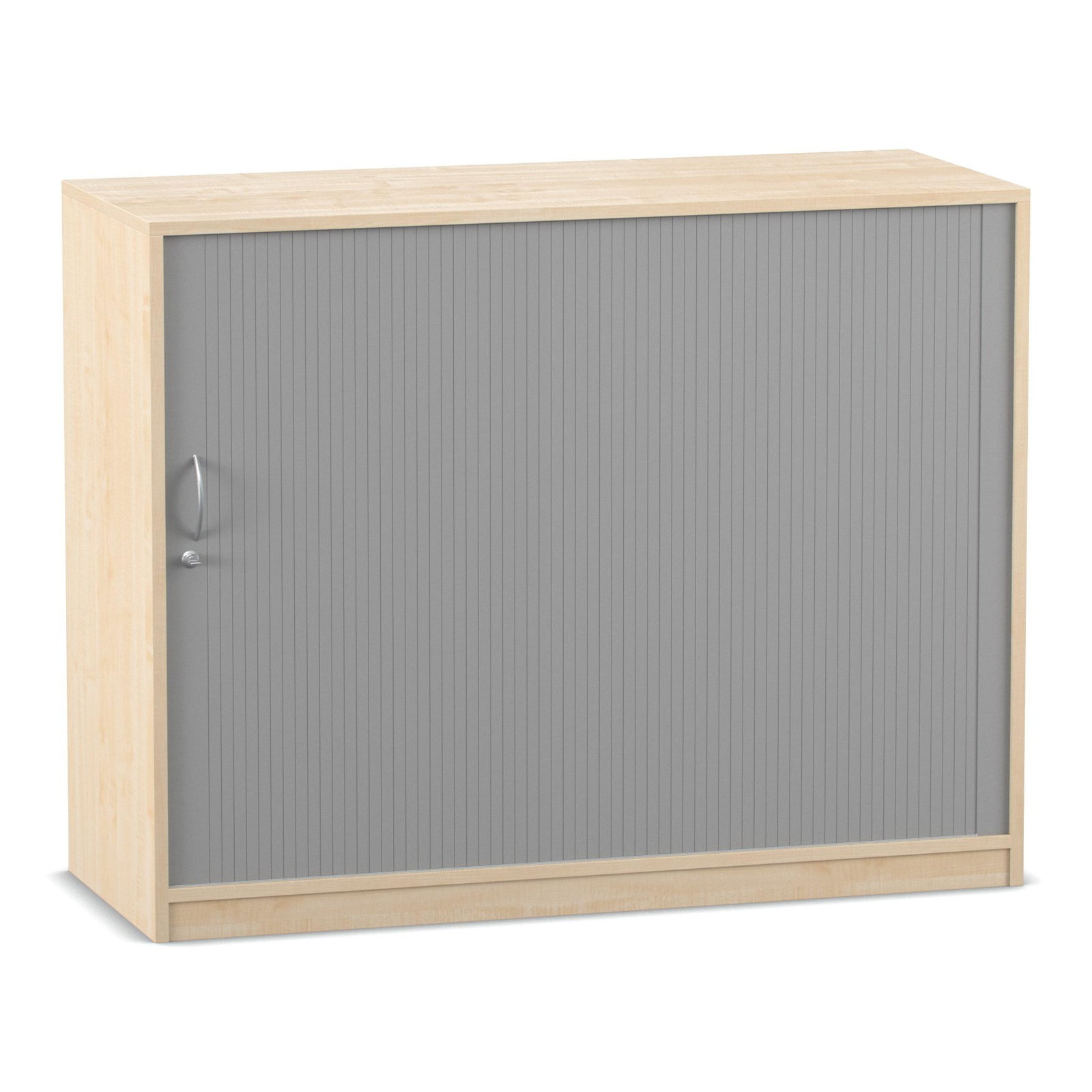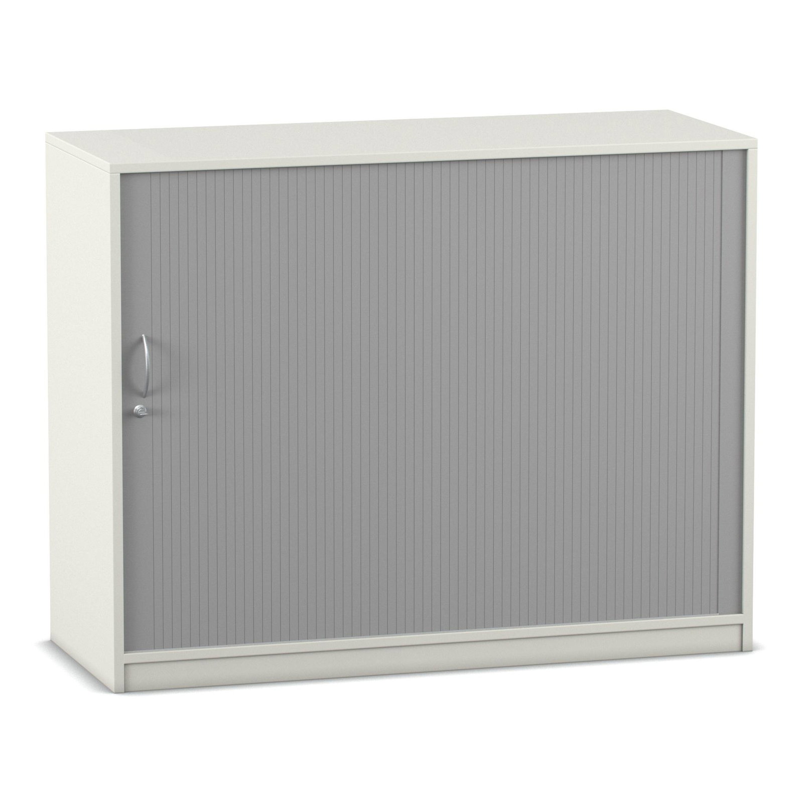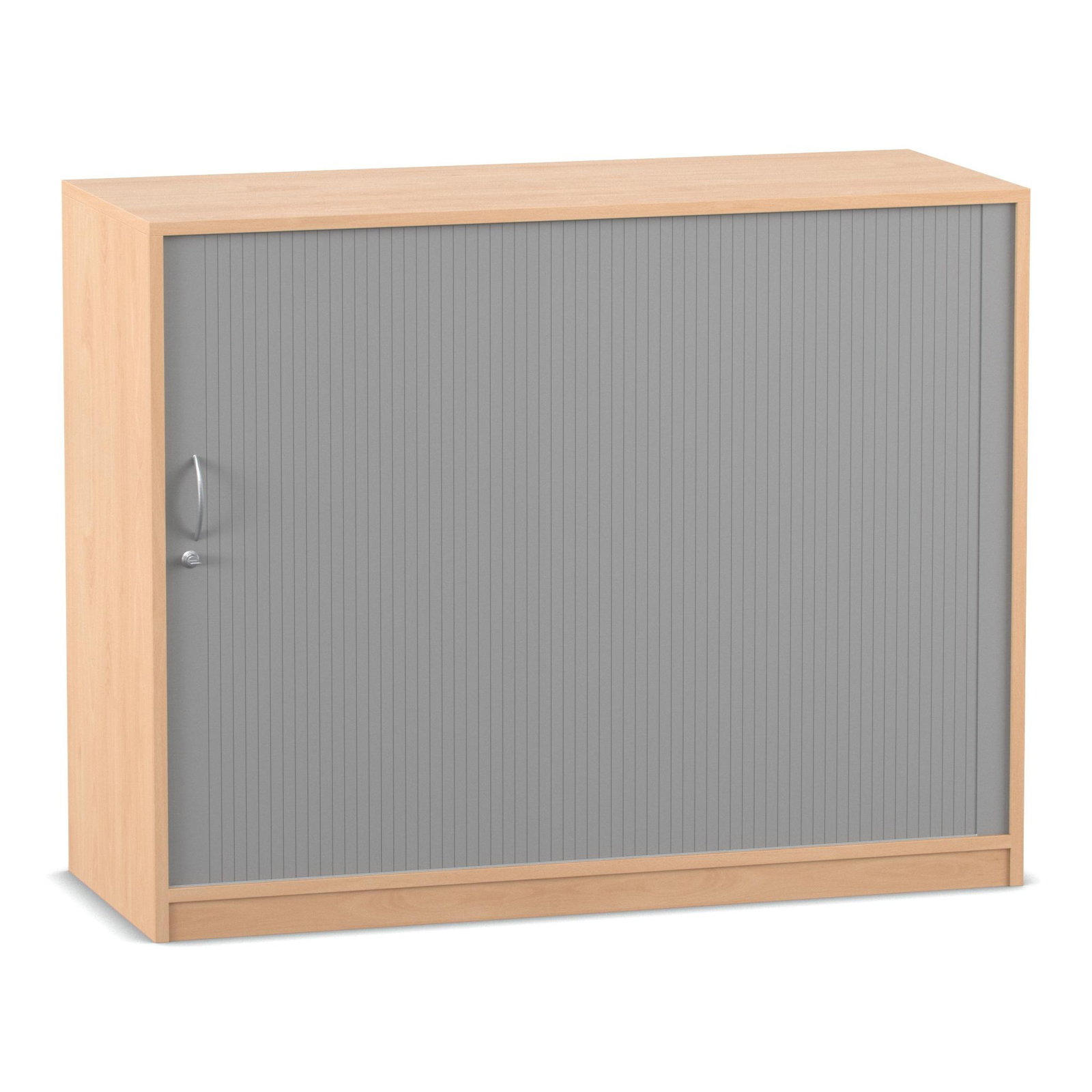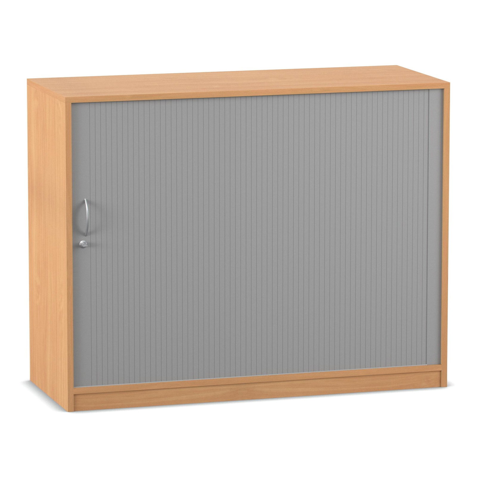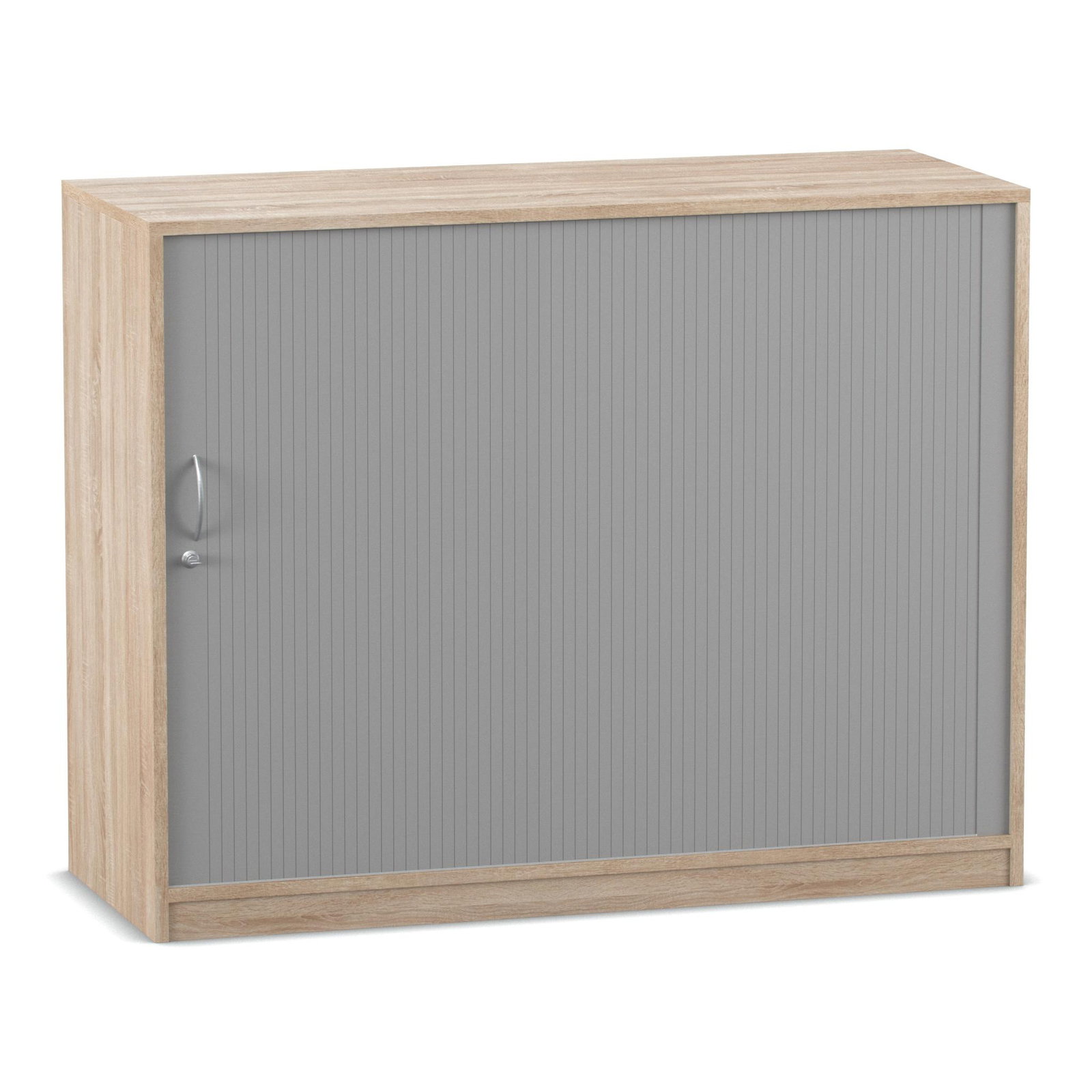 Das absolute Highlight dieses großzügigen Schranks ist sein innovatives Türsystem. Der alufarbige Kunststoff-Rollladen lässt sich sanft von links nach rechts öffnen und verschwindet dabei unsichtbar in der doppelwandigen Rückwand. Im Gegensatz zu herkömmlichen Flügeltüren ragen hier keine Türen in den Raum hinein. Das bedeutet für Sie: Kein Raumverlust und keine gefährlichen Stolperfallen bei offen stehendem Schrank. Diese Eigenschaft macht den Rollladenschrank zur idealen Wahl für schmale Flure oder belebte Räume. Zudem ist das Möbelstück mit einem ergonomischen Bogengriff inklusive Schloss ausgestattet. So schließen Sie sensible Dokumente oder teure Arbeitsmaterialien zuverlässig vor unbefugtem Zugriff weg.