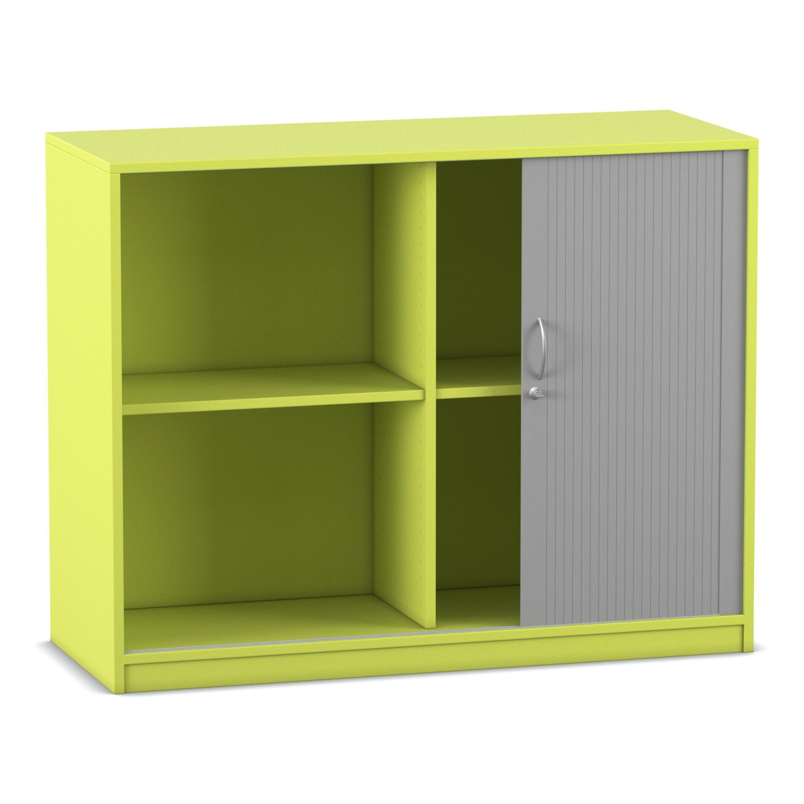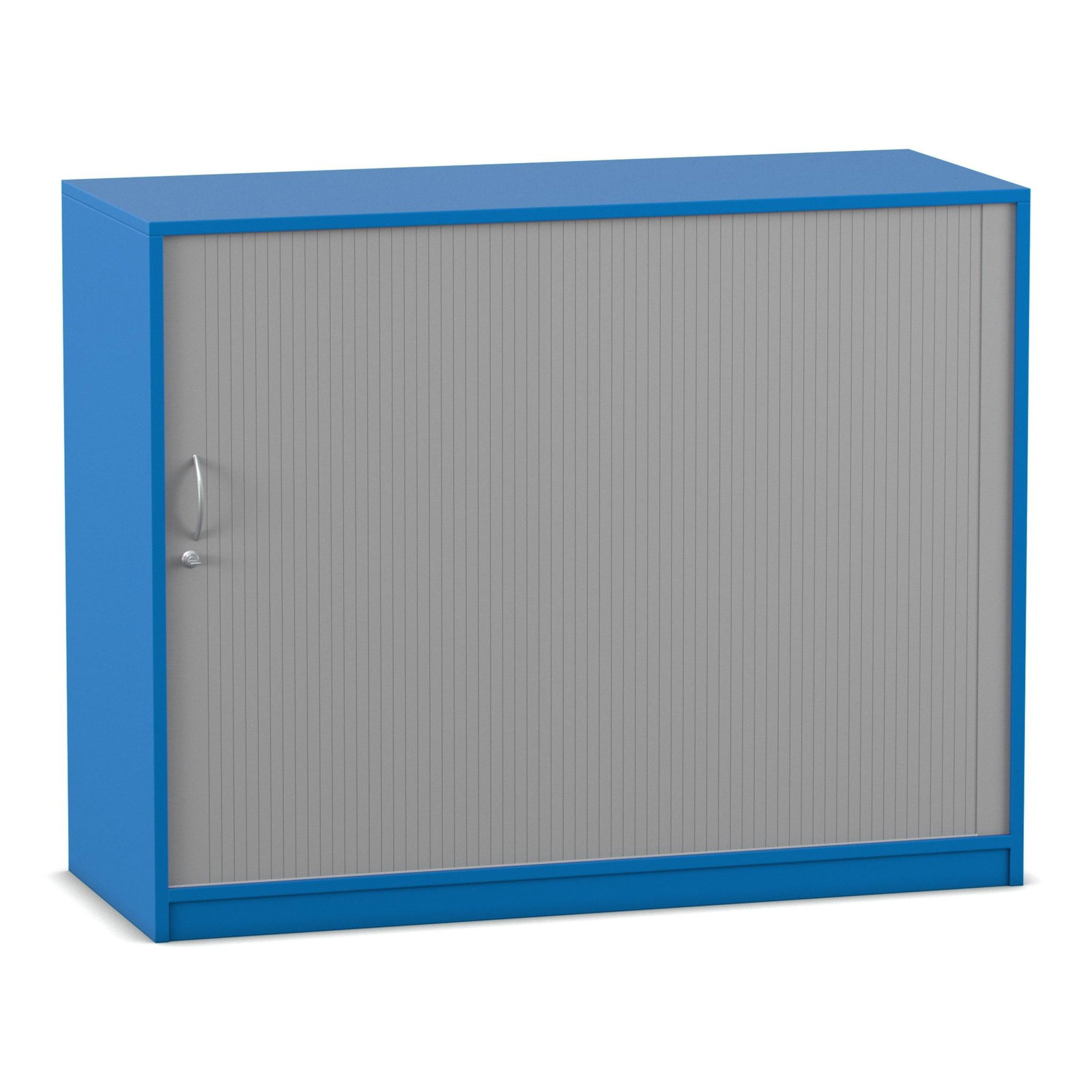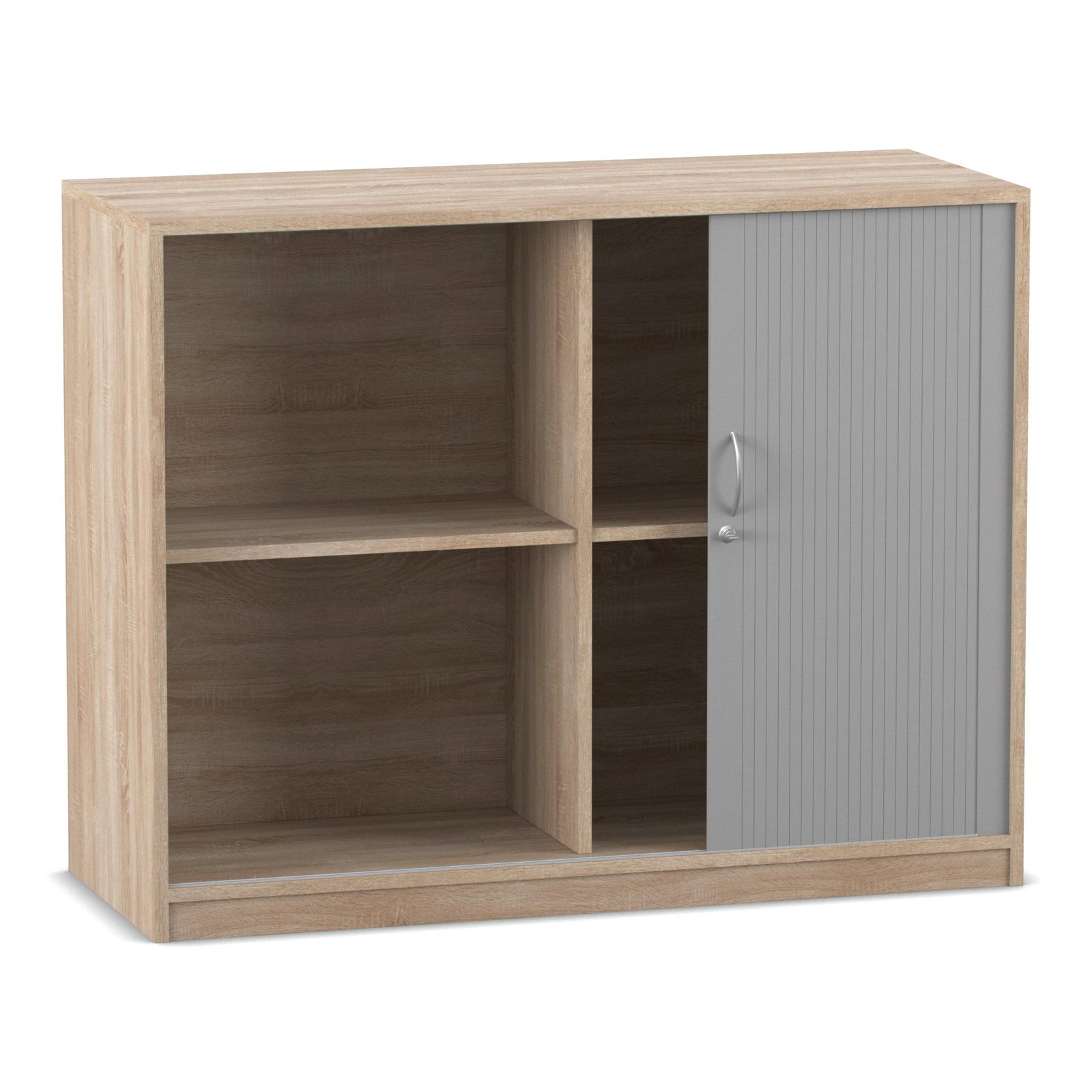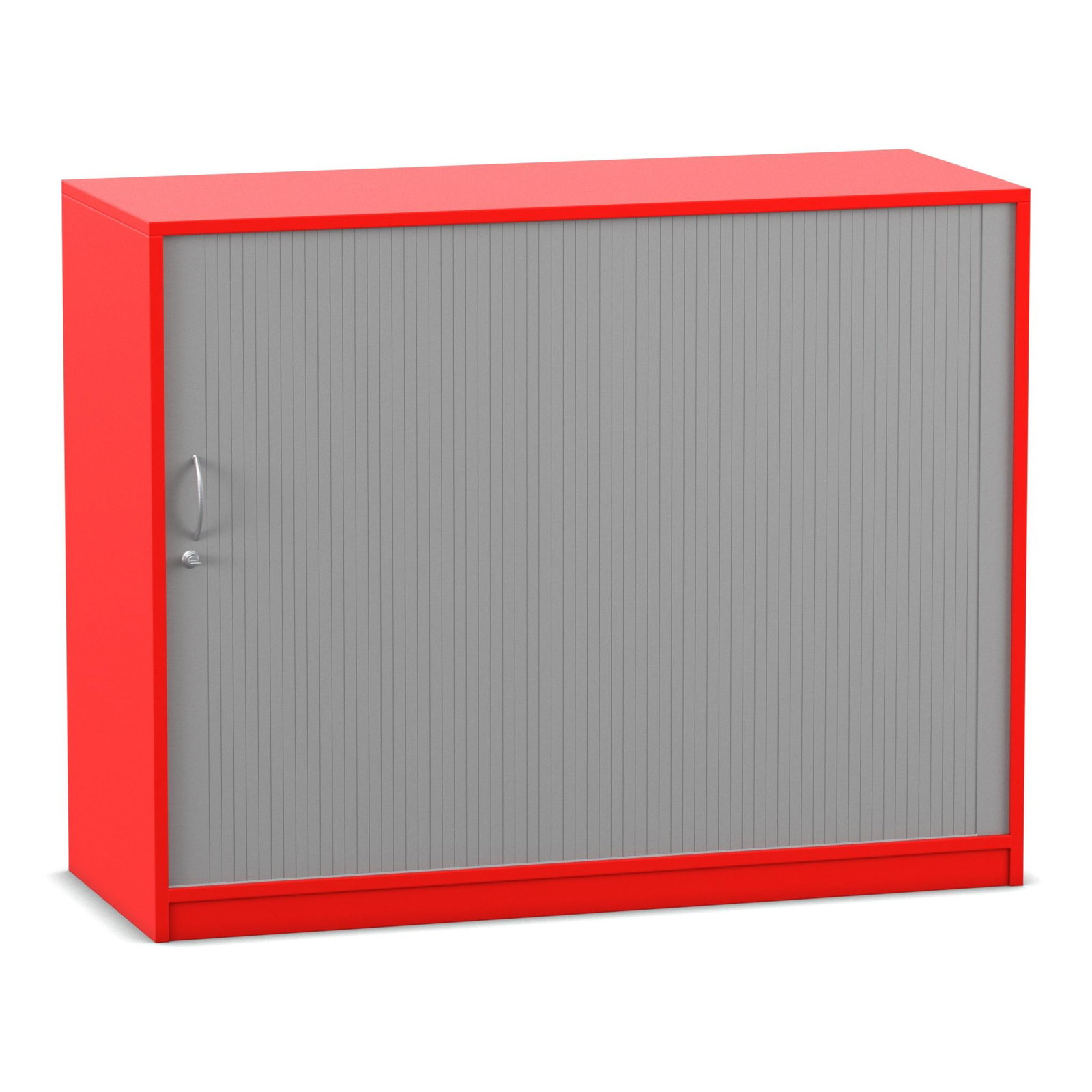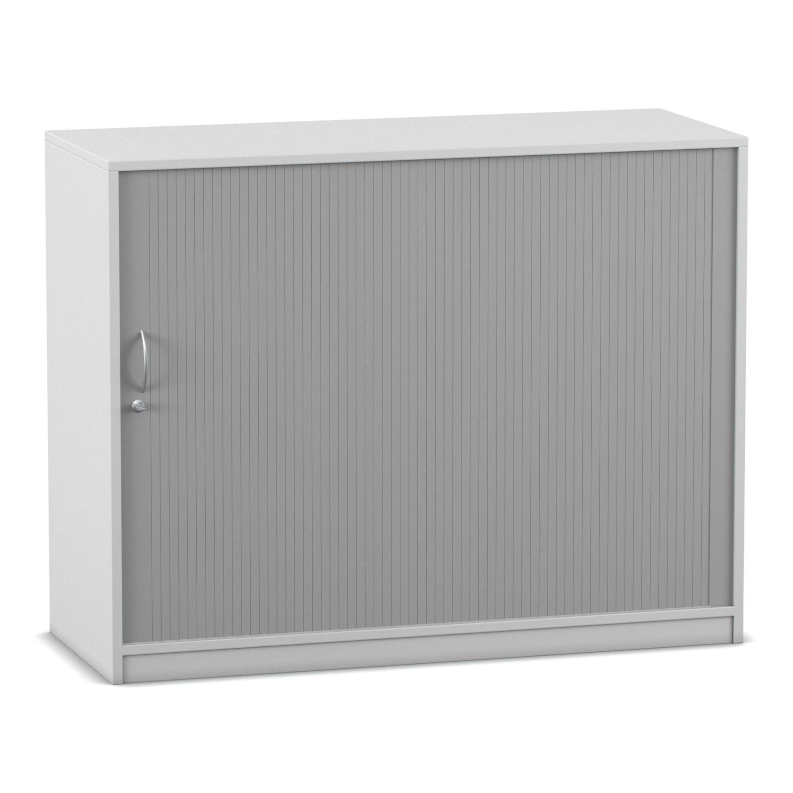 Das absolute Highlight dieses großzügigen Schranks ist sein innovatives Türsystem. Der alufarbige Kunststoff-Rollladen lässt sich sanft von links nach rechts öffnen und verschwindet dabei unsichtbar in der doppelwandigen Rückwand. Im Gegensatz zu herkömmlichen Flügeltüren ragen hier keine Türen in den Raum hinein. Das bedeutet für Sie: Kein Raumverlust und keine gefährlichen Stolperfallen bei offen stehendem Schrank. Diese Eigenschaft macht den Rollladenschrank zur idealen Wahl für schmale Flure oder belebte Räume. Zudem ist das Möbelstück mit einem ergonomischen Bogengriff inklusive Schloss ausgestattet. So schließen Sie sensible Dokumente oder teure Arbeitsmaterialien zuverlässig vor unbefugtem Zugriff weg.