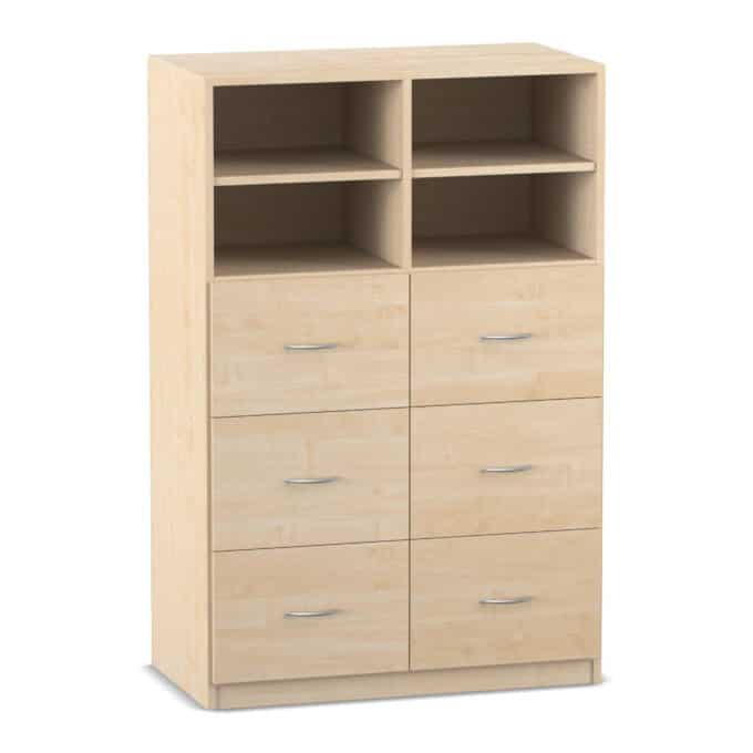 - Aufteilung: 6 große Holzschubladen, 4 offene Fächer