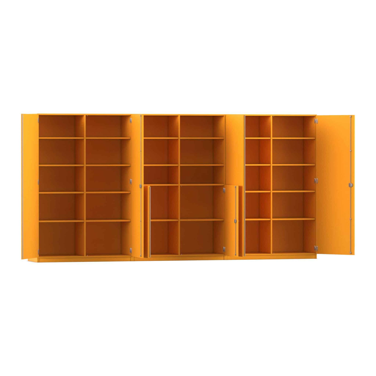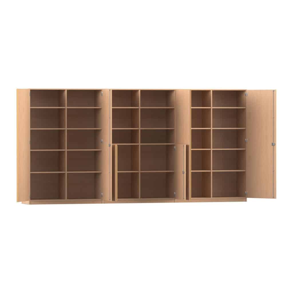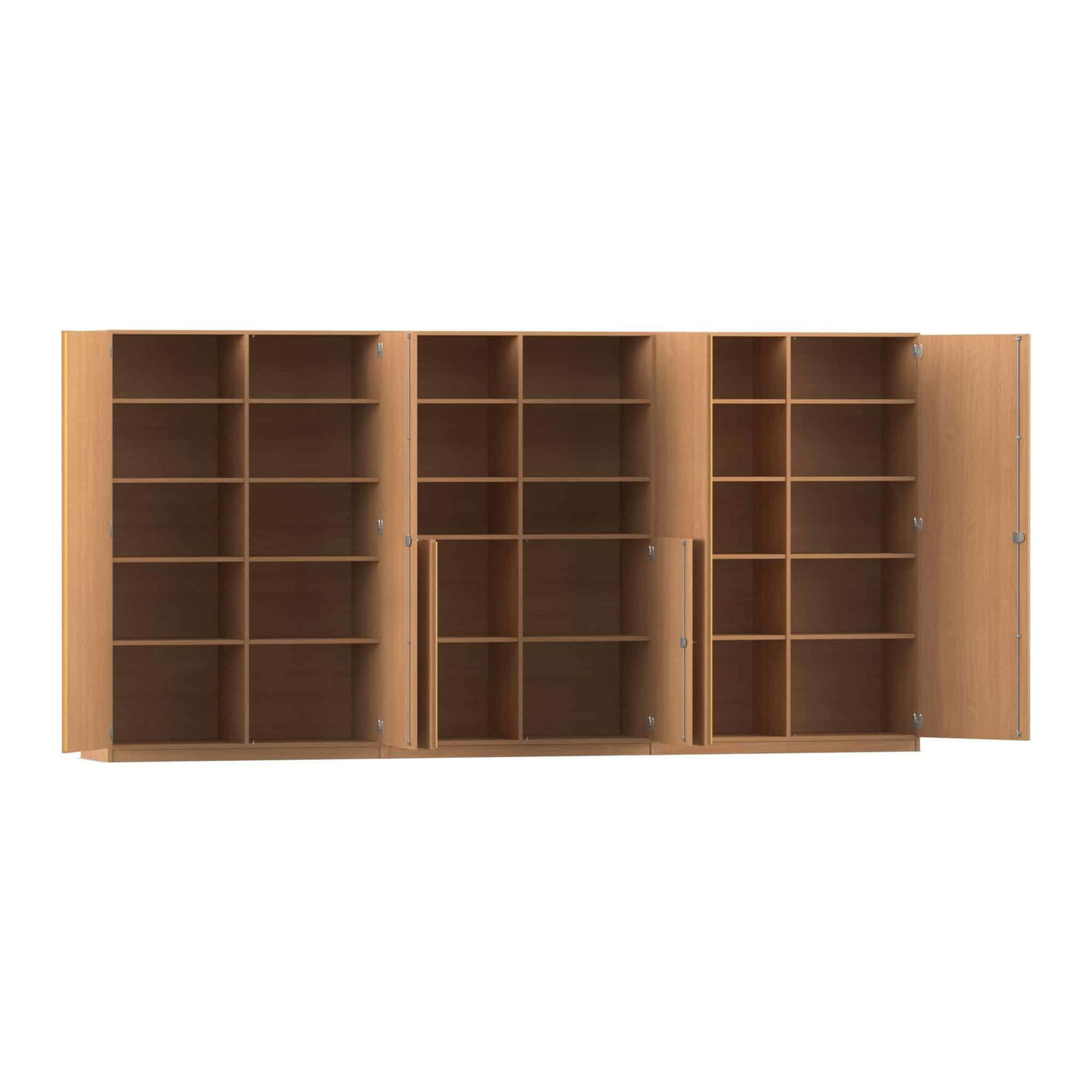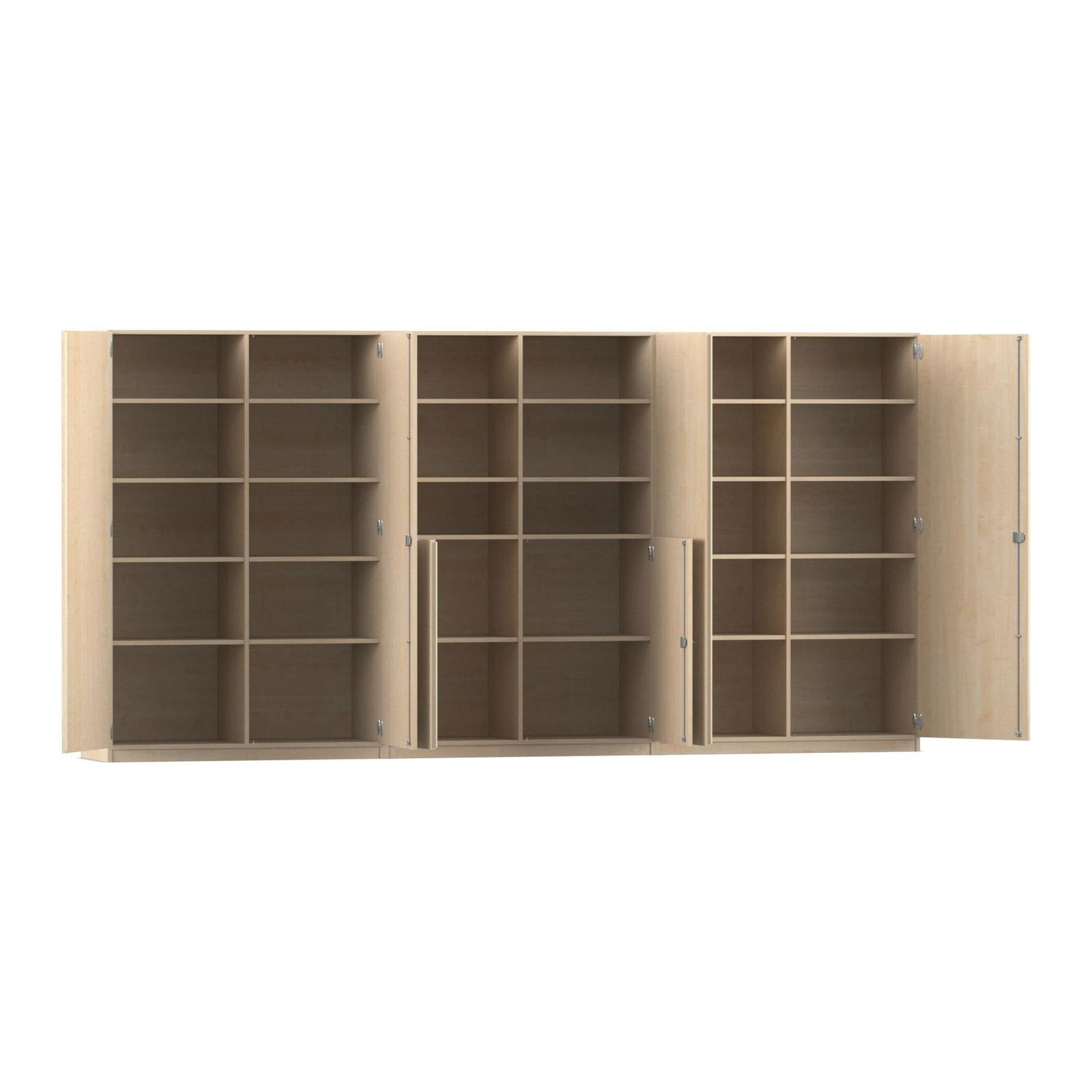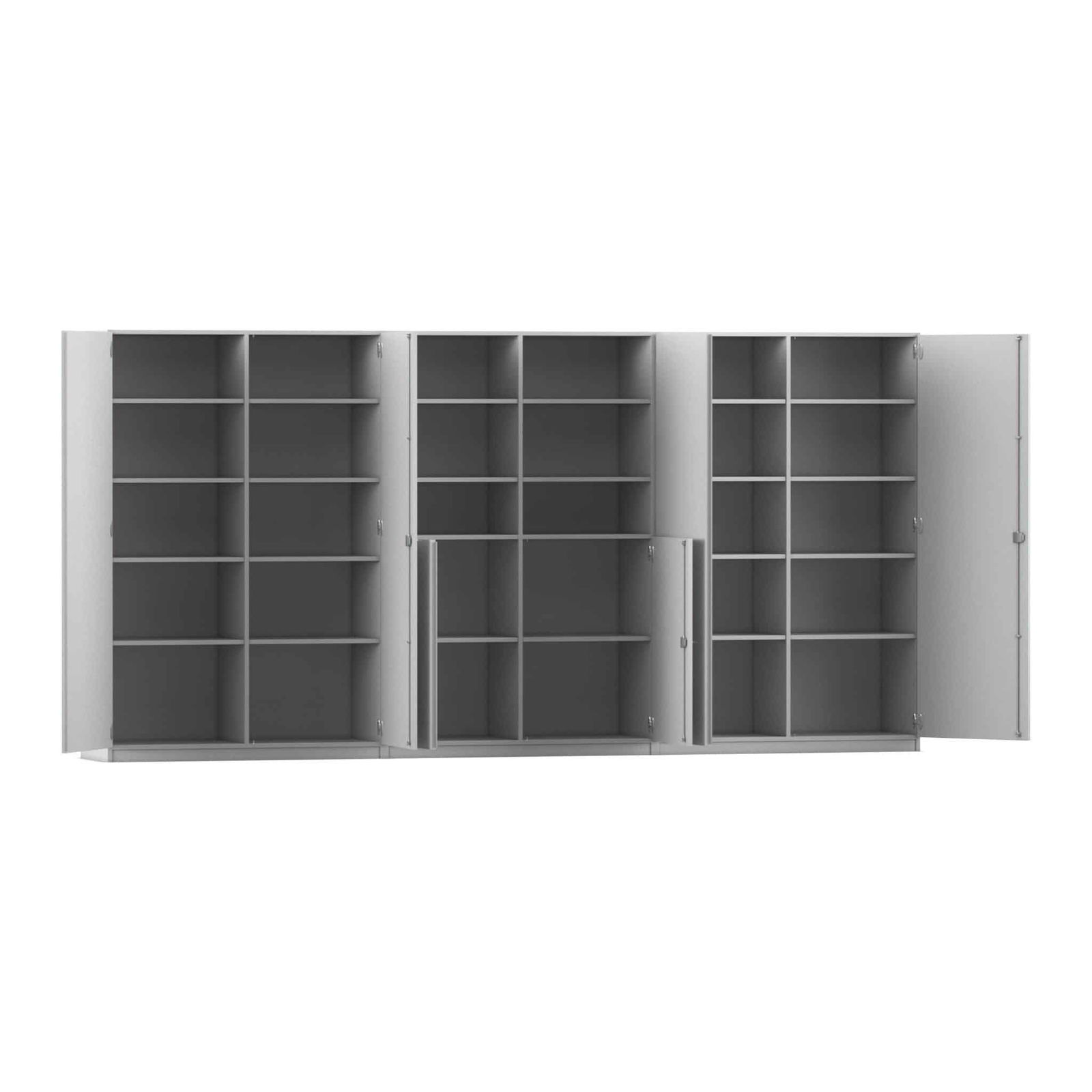 Verbinden Sie großzügigen, sicheren Stauraum mit einer repräsentativen Ausstellungsfläche. Diese Flexeo® Systemschrankwand ist die ideale Lösung für größere Lehrmittelsammlungen, das Lehrerzimmer oder als zentrales Ordnungssystem in der Verwaltung. Die intelligente Aufteilung mit einem offenen Mittelregal und beidseitig abschließbaren, großen Schrankelementen schafft eine perfekte Balance zwischen schnellem Zugriff und geschützter Aufbewahrung. Mit insgesamt 30 Fächern auf fast vier Metern Breite, einer extrem robusten Bauweise und einer 5-Jahres-Garantie investieren Sie in eine langlebige, flexible und professionelle Stauraumlösung, die sofort einsatzbereit ist.
