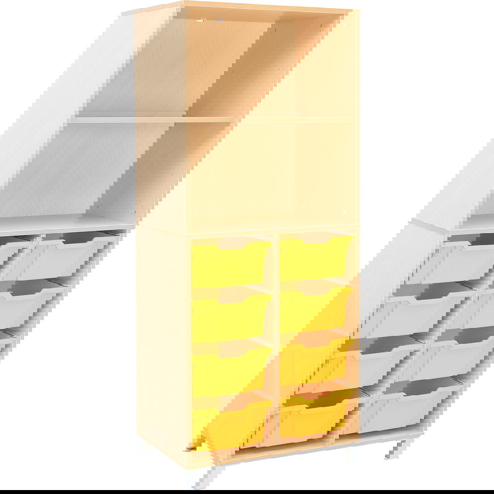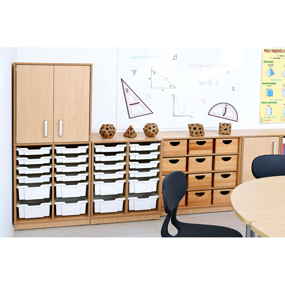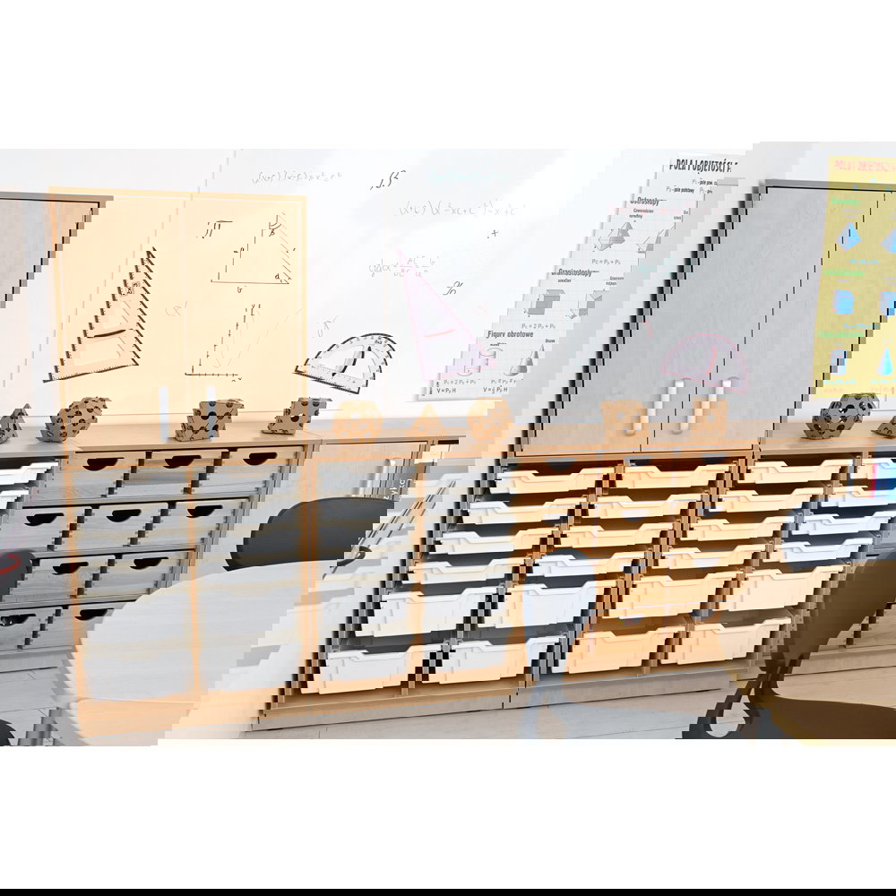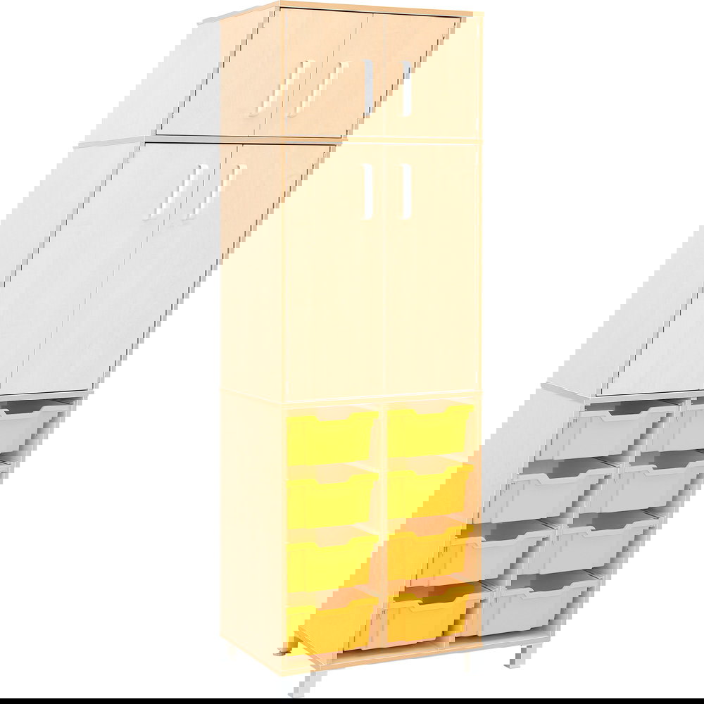 In belebten Umgebungen wie Gruppenräumen oder Klassenzimmern hat Sicherheit oberste Priorität. Durch die Montage des Aufsatzes verlagert sich der Schwerpunkt nach oben. Daher ist eine Befestigung an der Wand zwingend erforderlich. Das passende Montagematerial liefern wir direkt mit, damit Sie sofort für Stabilität sorgen können. - Individuelle Gestaltung mit Türen