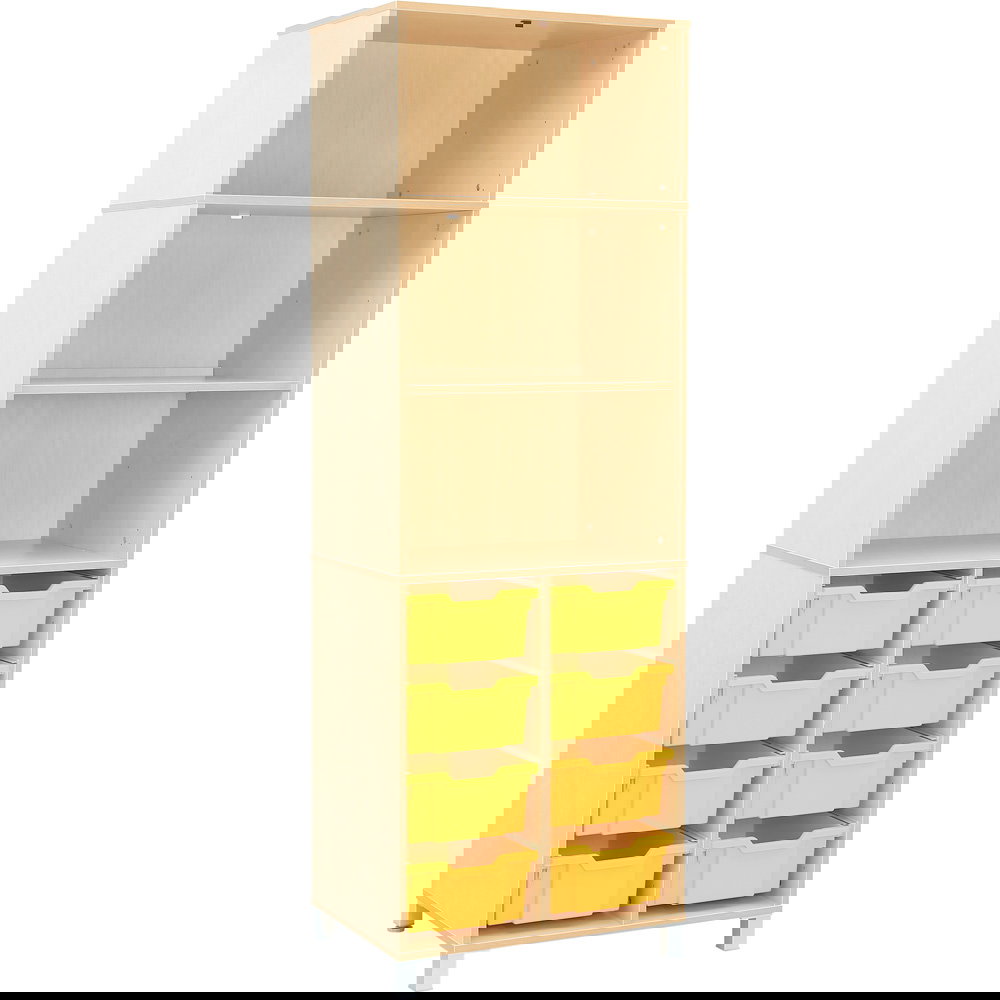 Mit einer komfortablen Höhe von knapp 80 cm bietet dieser Aufsatz fast so viel Platz wie ein eigenständiger kleiner Schrank. Hier finden Ordnerreihen, Bücherstapel, Materialkisten oder pädagogische Lehrmittel bequem ihren Platz. Das zeitlose Design im natürlichen Birke-Dekor sorgt dabei für eine ruhige und aufgeräumte Atmosphäre. Wer den Inhalt lieber verbergen oder farbliche Akzente setzen möchte, kann den offenen Korpus problemlos mit den passenden Türen (separat erhältlich, Art. 092835-092842) ergänzen. So schaffen Sie eine harmonische Schrankwand, die Funktionalität und Ästhetik perfekt vereint.