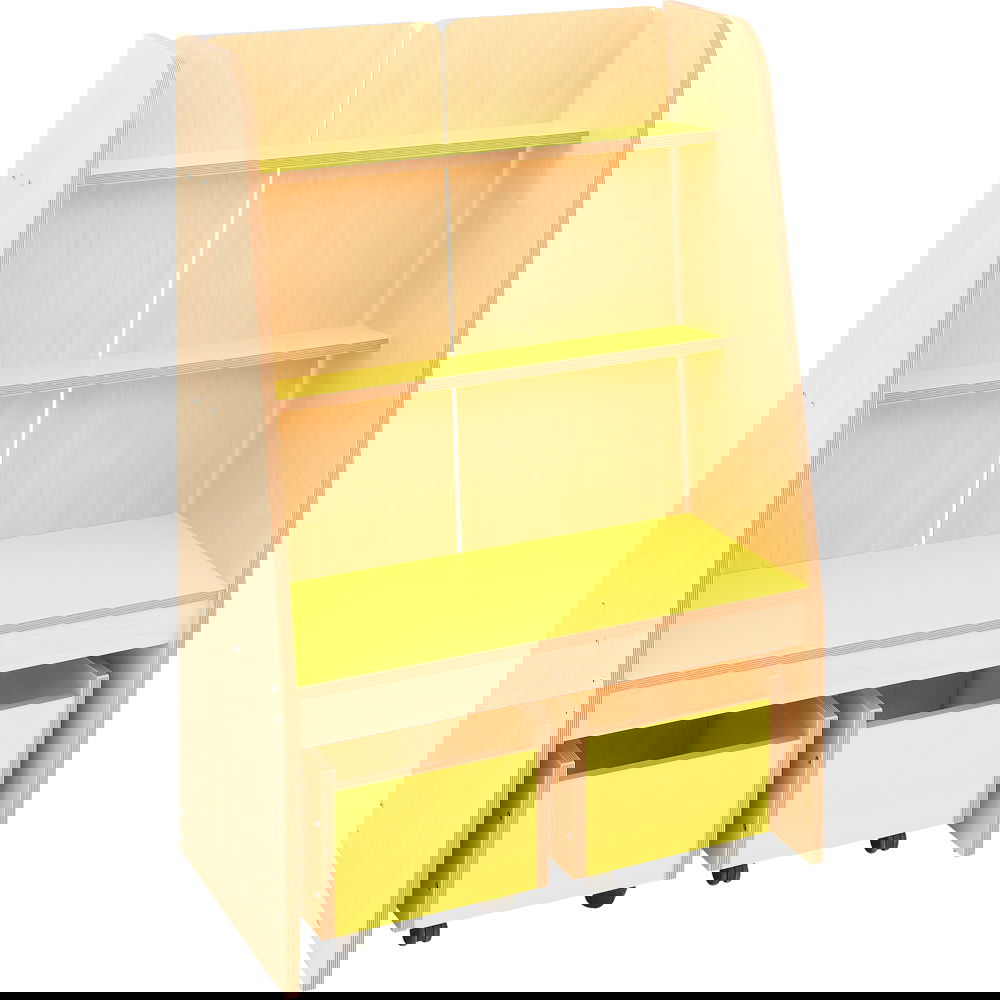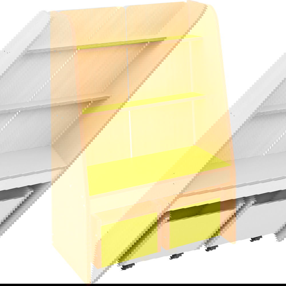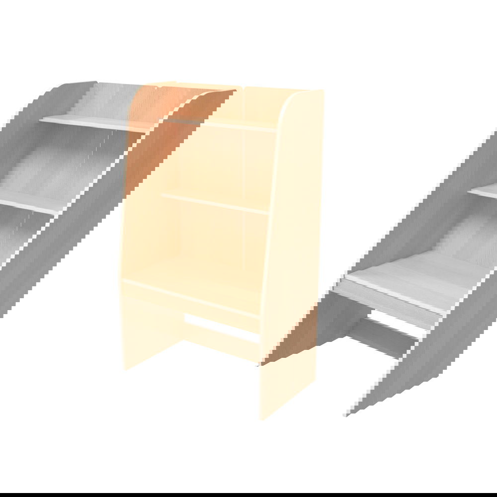 Dieses Möbelstück ist beides: ein klassisches Bücherregal und eine clevere Garage für mobile Aufbewahrung. Die drei großzügigen Fächer bieten viel Platz für Bücher, während der untere Bereich perfekt für zwei kleine Rollbehälter ausgelegt ist.