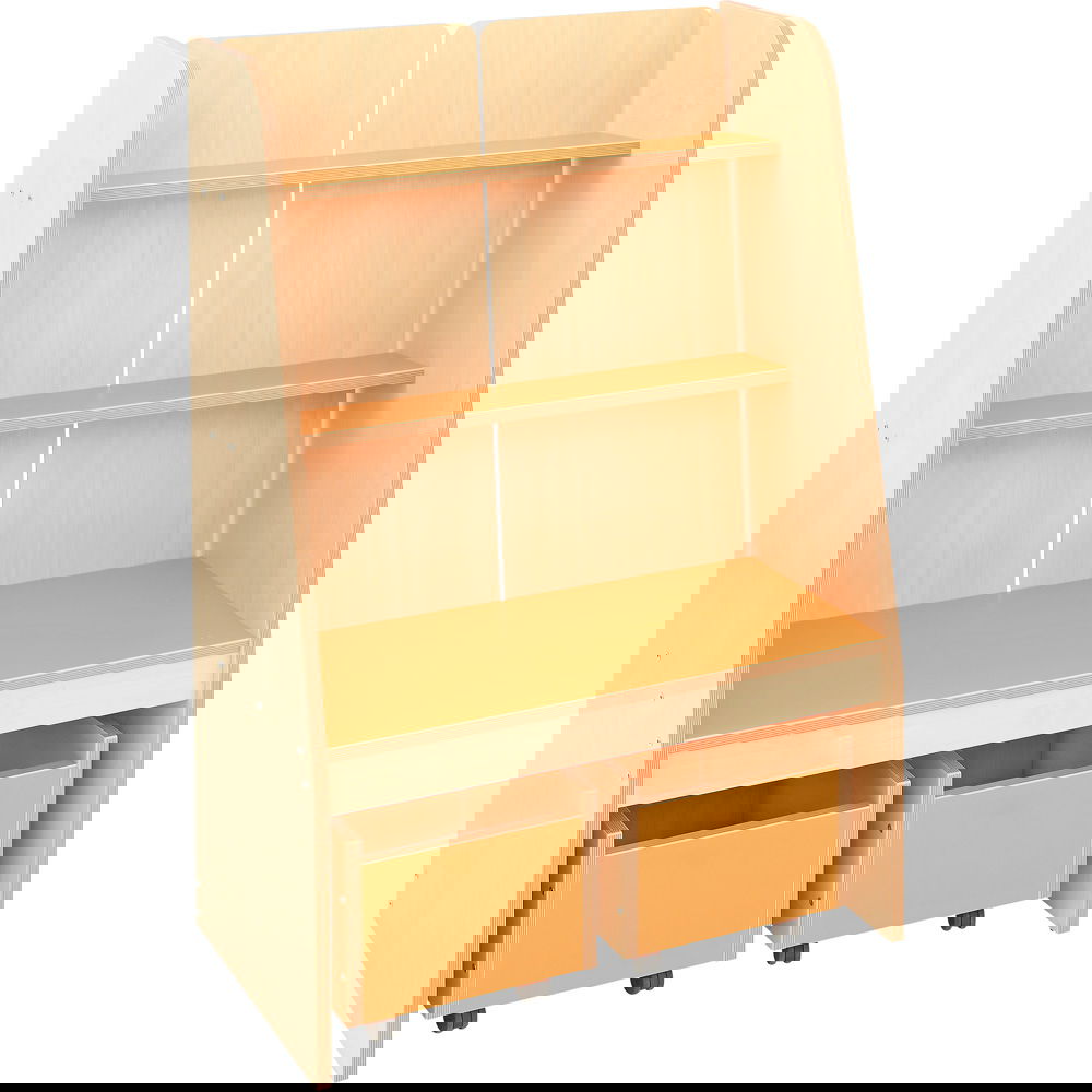 Das Herzstück des Designs ist seine Multifunktionalität. In den oberen drei Fächern finden Bücher aller Art mit einer Fachhöhe von 29 cm bequem Platz. Der untere Bereich ist speziell dafür konzipiert, zwei unserer kleinen Rollbehälter (separat erhältlich) aufzunehmen. Diese „Garagen“ für mobile Spielkisten sind eine geniale Lösung, um Baumaterial, Bastelsachen oder Spielzeug schnell zur Hand zu haben und nach dem Spielen ebenso schnell wieder verschwinden zu lassen. Die schmalen oberen Ablagen bieten zudem eine wunderbare Bühne für besondere Einzelstücke, Figuren oder saisonale Dekorationen.