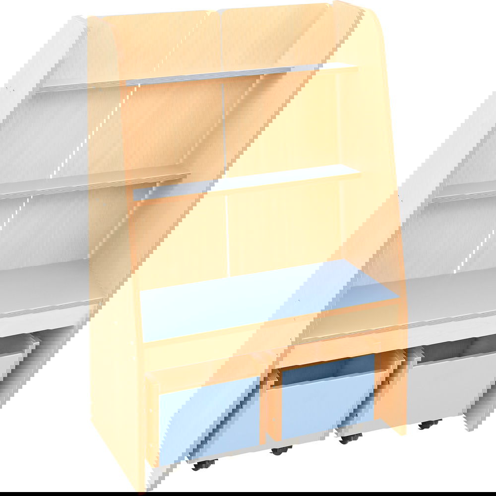 Die klare Struktur macht es Kindern leicht, den Überblick zu behalten. Bücher haben ihren festen Platz, und die Rollbehälter können von den Kindern selbstständig zum Spielort gefahren und anschließend wieder „geparkt“ werden. Das Aufräumen wird zum Kinderspiel.