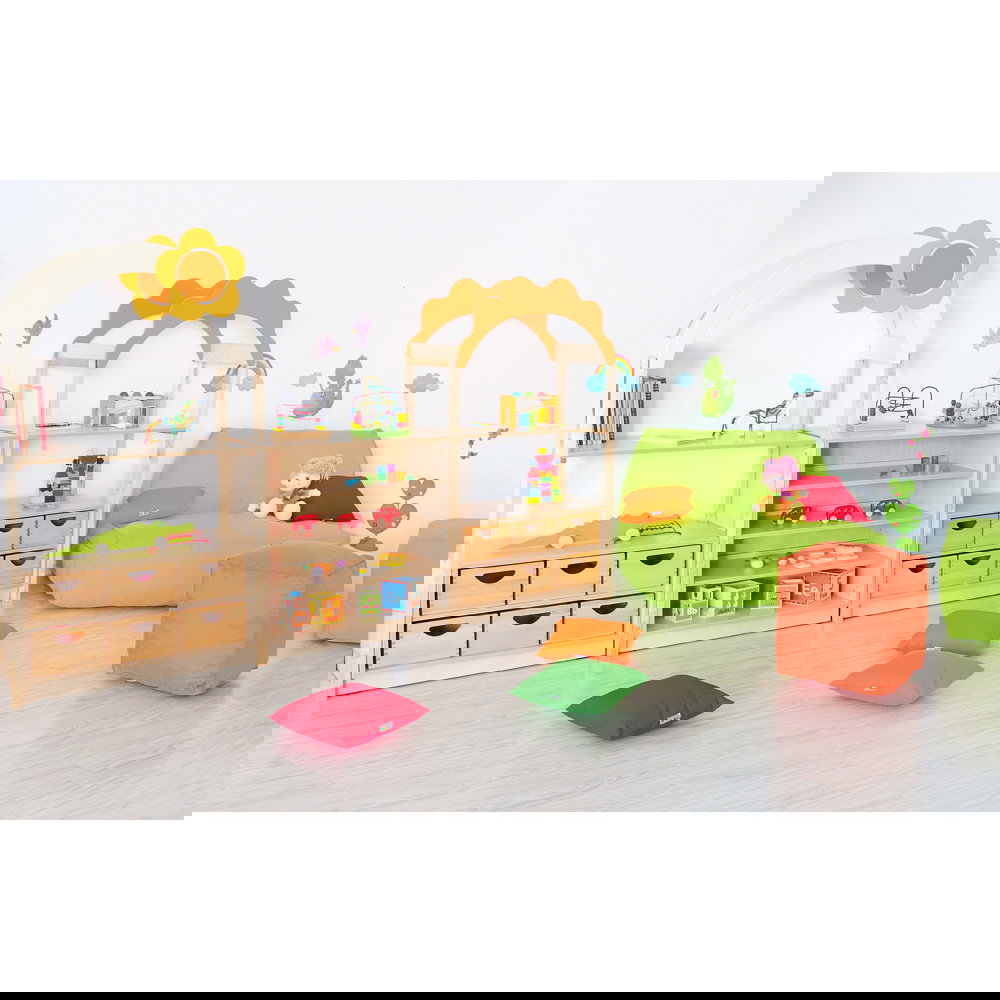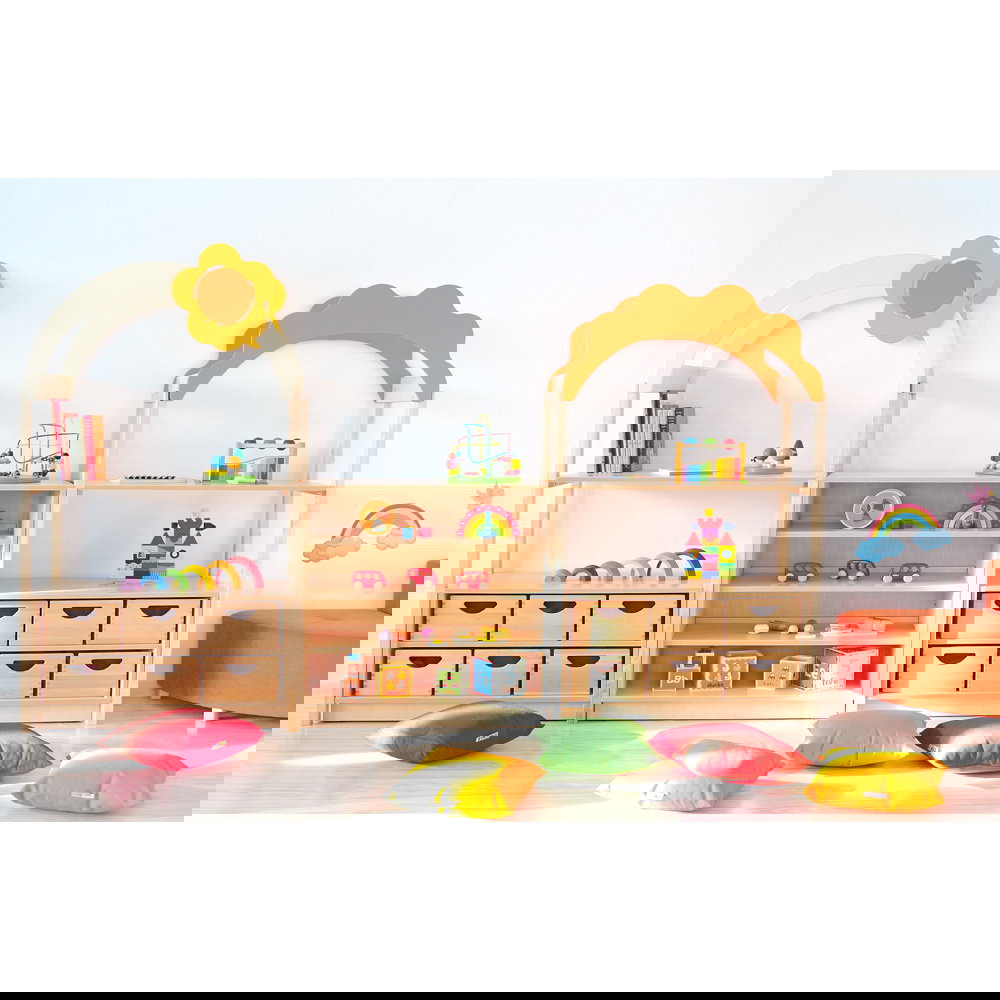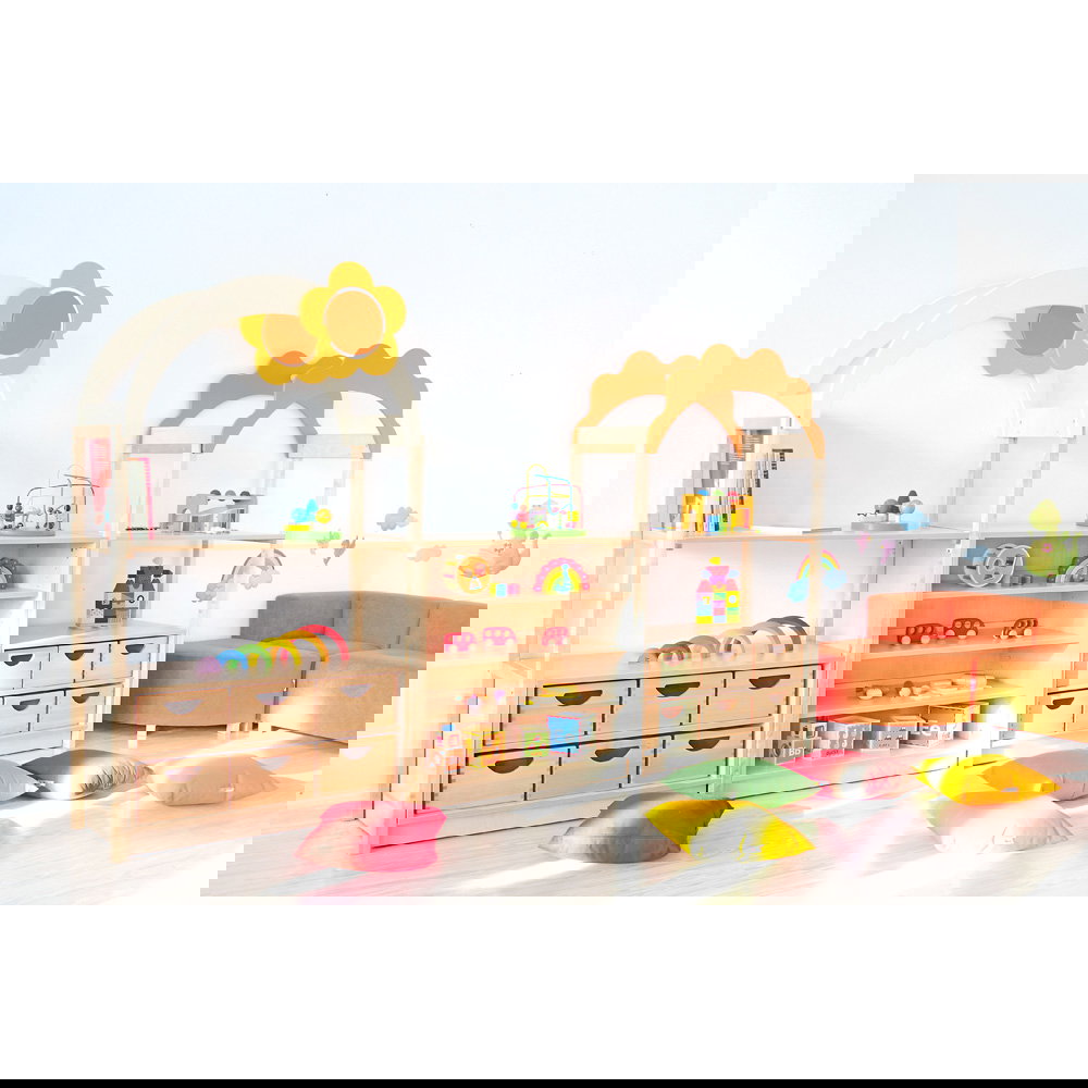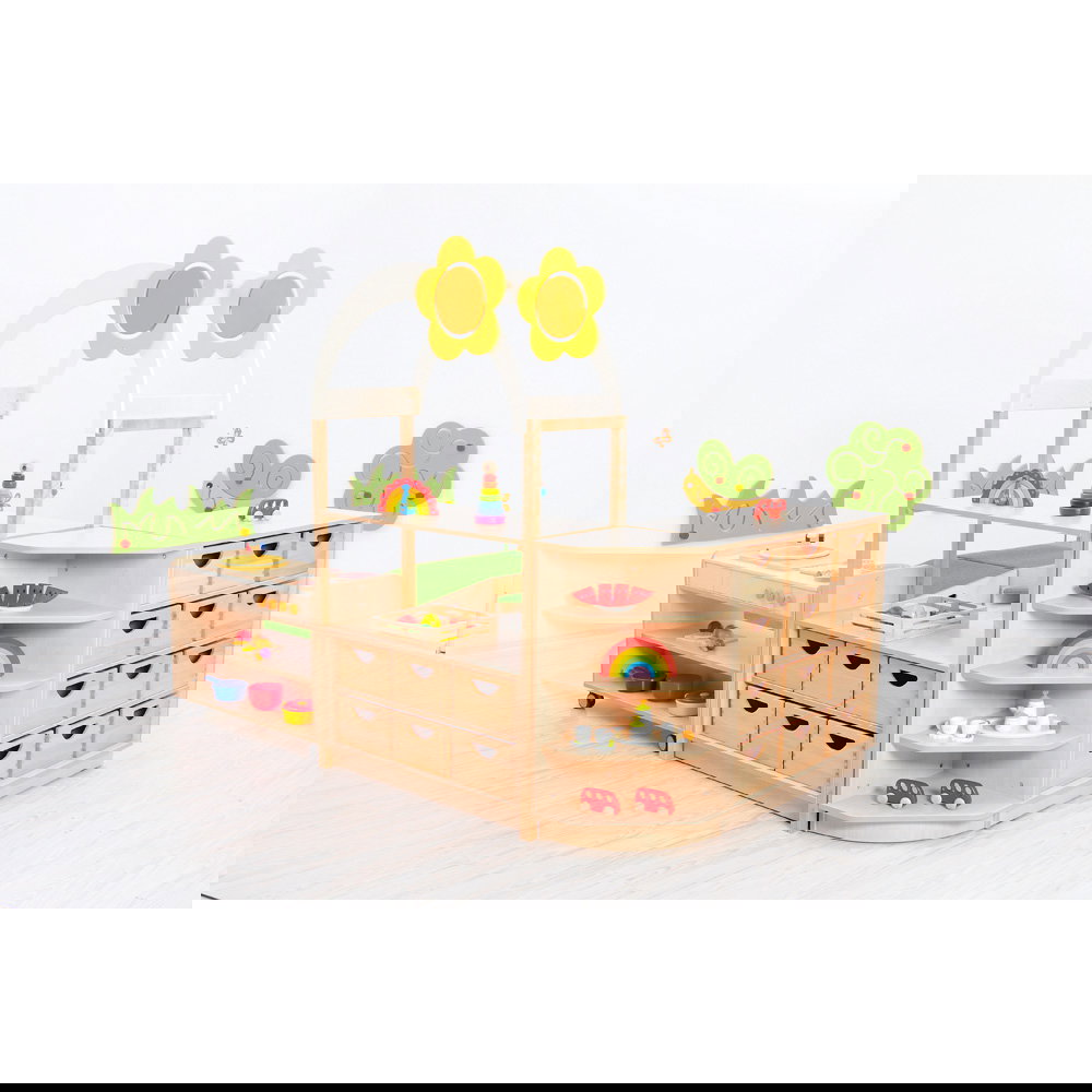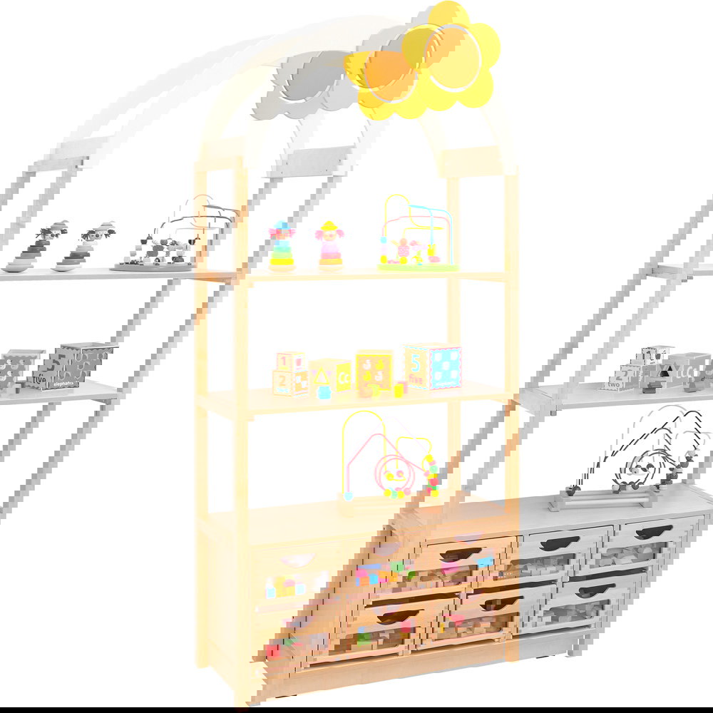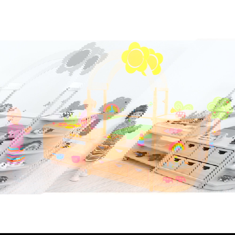 Das bogenförmige Dach mit Blumenmotiv verwandelt einfache Aufbewahrungsschränke sofort in spannende Spielkulissen. Die kindliche Fantasie wird gezielt angeregt, wodurch spielerisch neue Lern- und Erlebnisräume entstehen. Da das Element die Höhe des Raumes nutzt, bleibt die wertvolle Bodenfläche für Bewegungsspiele komplett erhalten. - Nahtlose Systemintegration