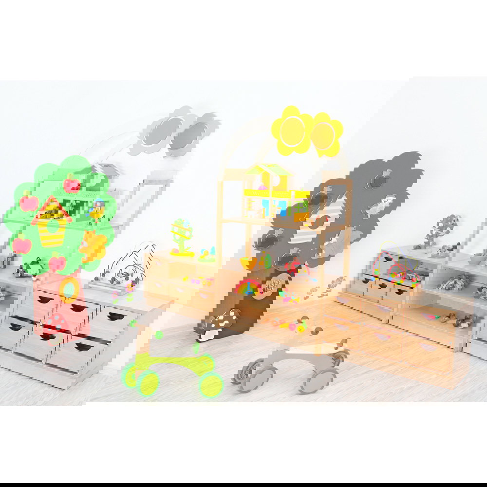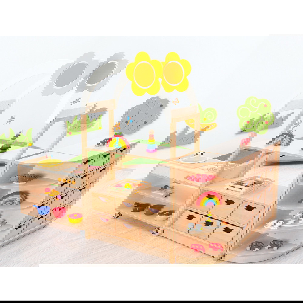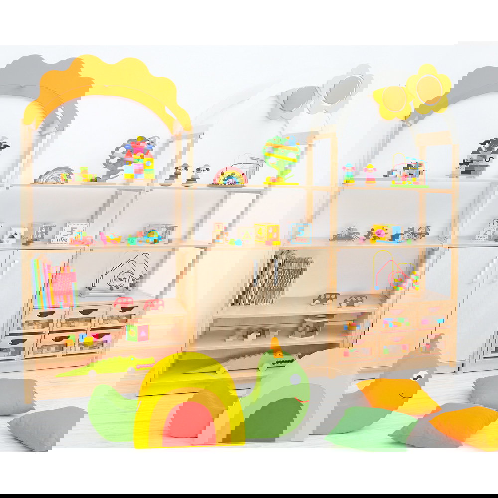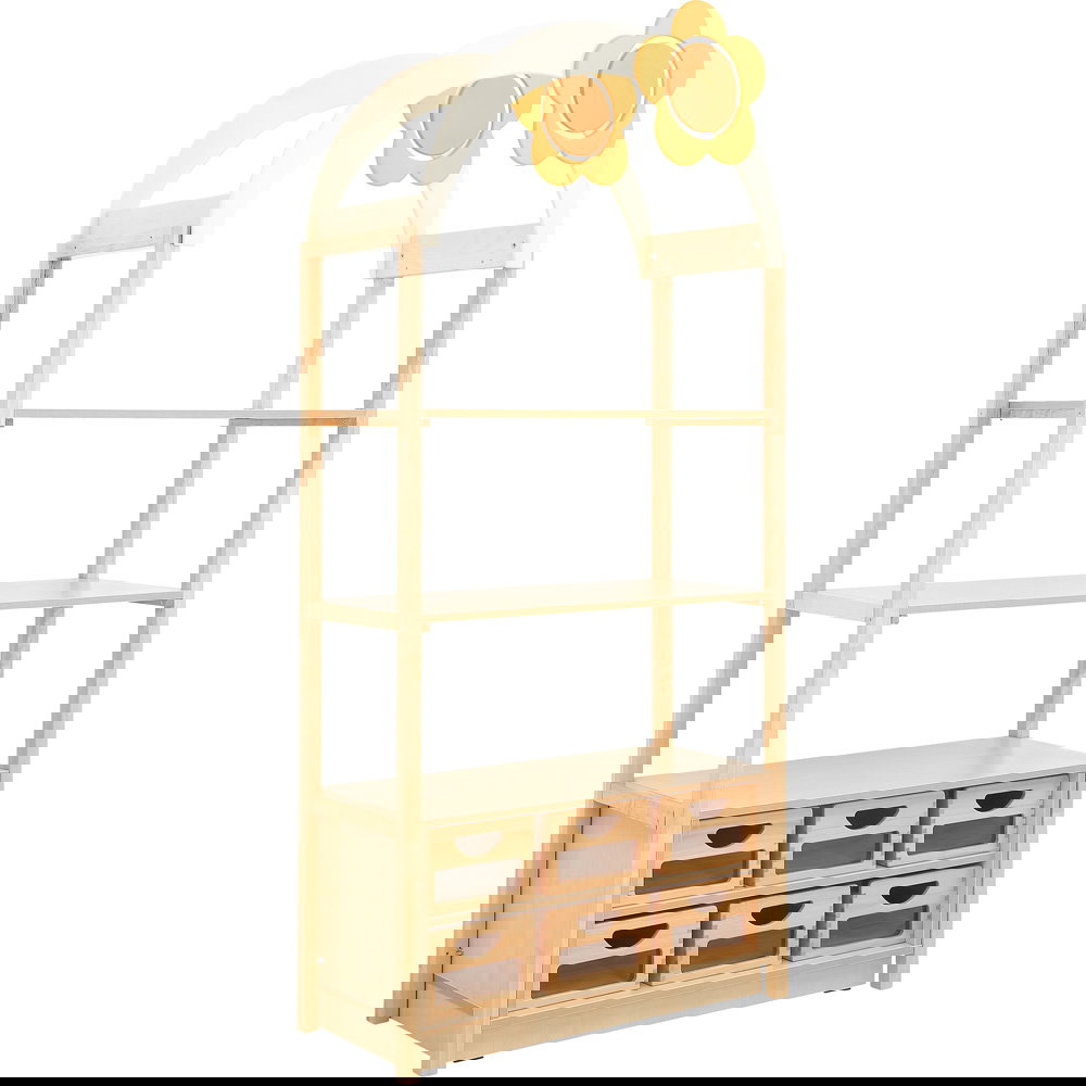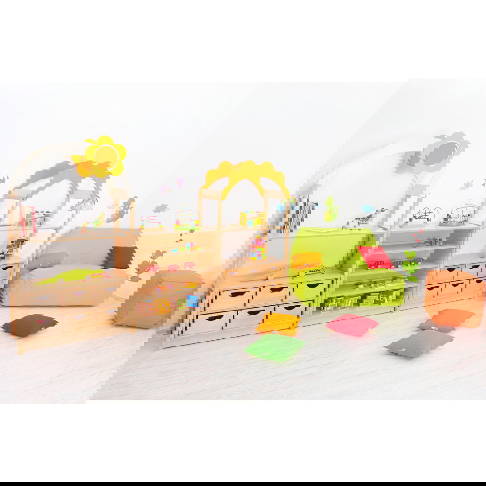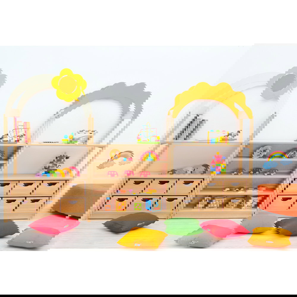 Das bogenförmige Dach mit Blumenmotiv verwandelt einfache Aufbewahrungsschränke sofort in spannende Spielkulissen. Die kindliche Fantasie wird gezielt angeregt, wodurch spielerisch neue Lern- und Erlebnisräume entstehen. Da das Element die Höhe des Raumes nutzt, bleibt die wertvolle Bodenfläche für Bewegungsspiele komplett erhalten. - Nahtlose Systemintegration