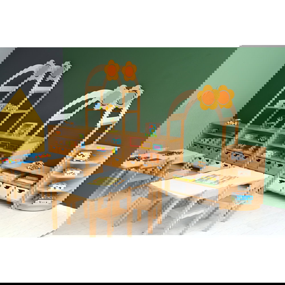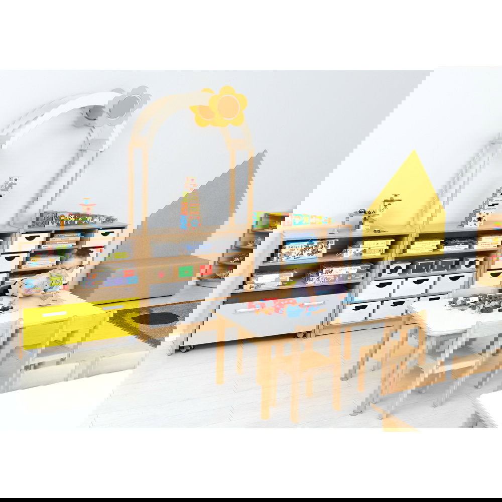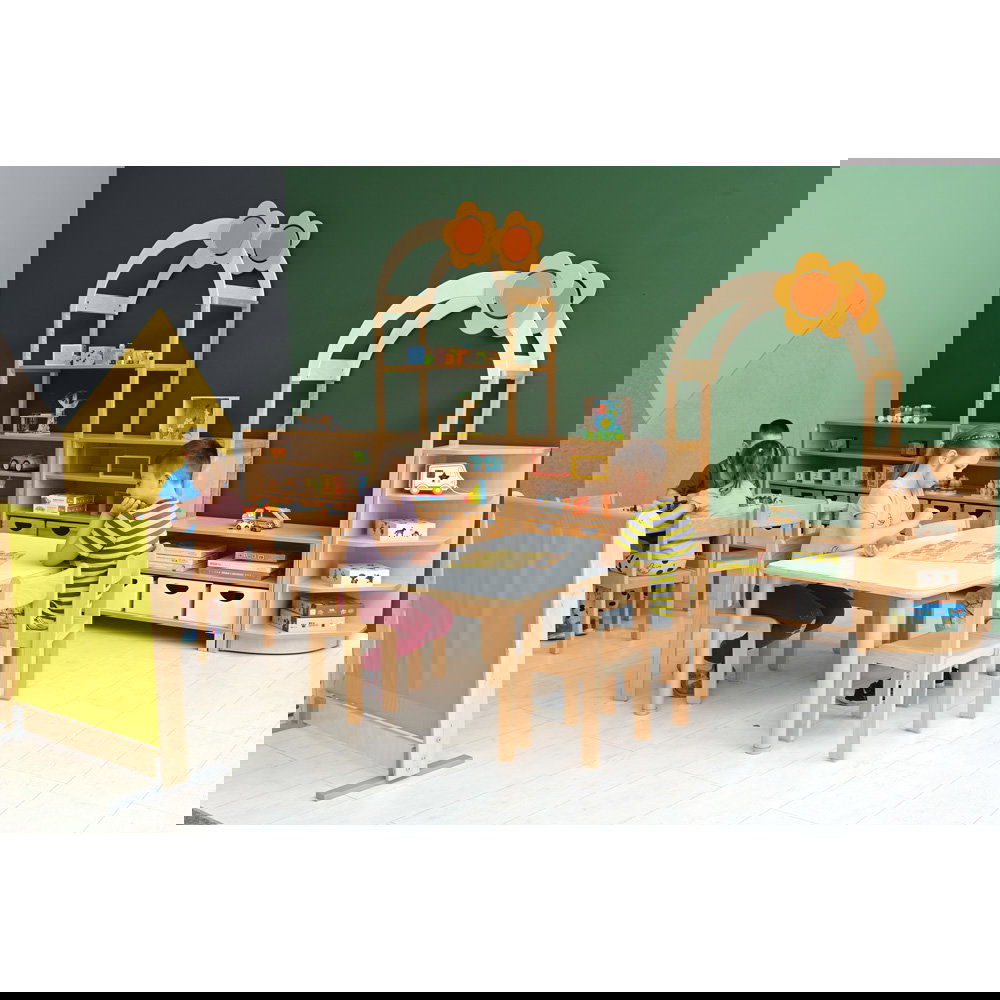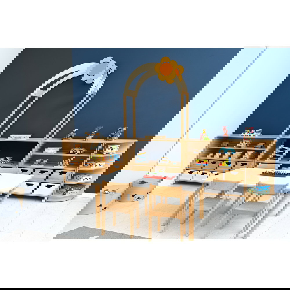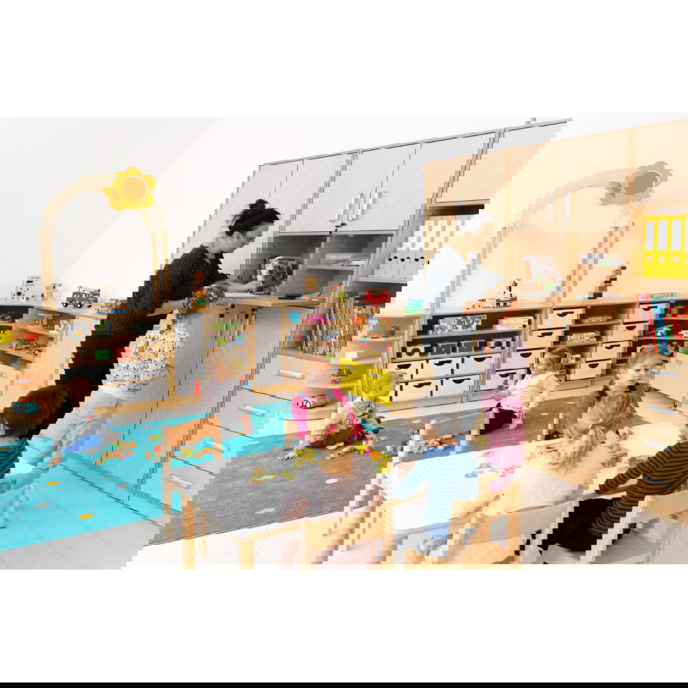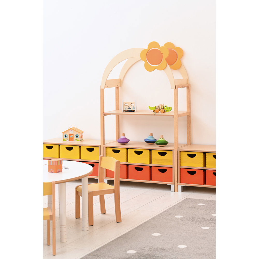 Kinder begreifen ihre Umwelt am besten durch aktives Spielen und Entdecken. In Kindergärten, Horten und Grundschulen ist es daher eine wichtige Aufgabe, Räume so zu gestalten, dass sie die kindliche Kreativität anregen und gleichzeitig den funktionalen Anforderungen des Alltags gerecht werden. Mit dem Aufsatzelement „Flexi Dach, Bogen mit Blume“ verwandeln Sie klassische Aufbewahrungsmöbel im Handumdrehen in inspirierende Spielbereiche. Dieser durchdachte Aufsatz ergänzt die Regale unserer bewährten Flexi-Kollektion perfekt und bringt eine fröhliche, einladende Atmosphäre in jeden Gruppenraum. Aus einem gewöhnlichen Schrank entsteht so ganz leicht ein interaktiver Mittelpunkt für das gemeinsame Spiel.