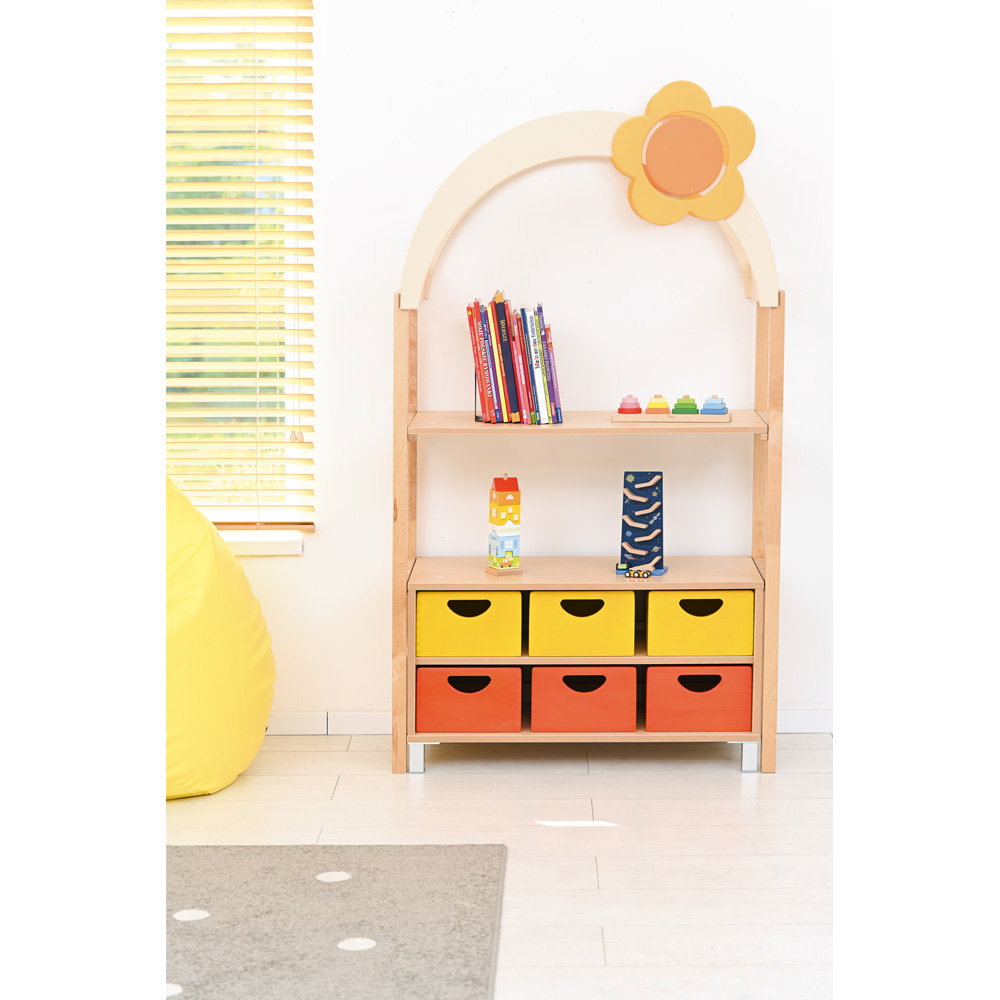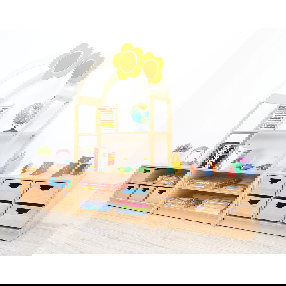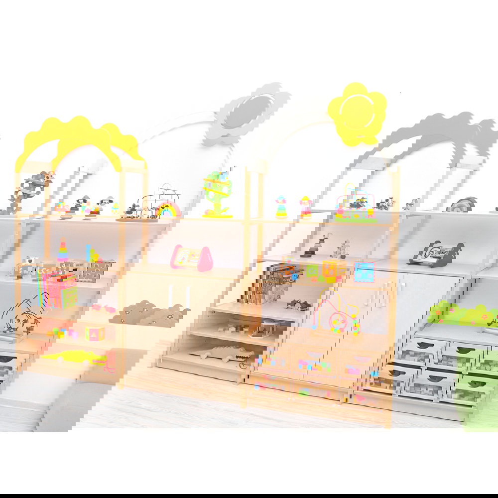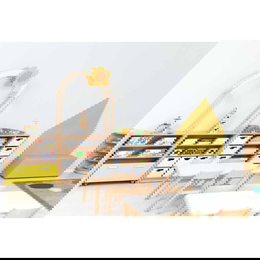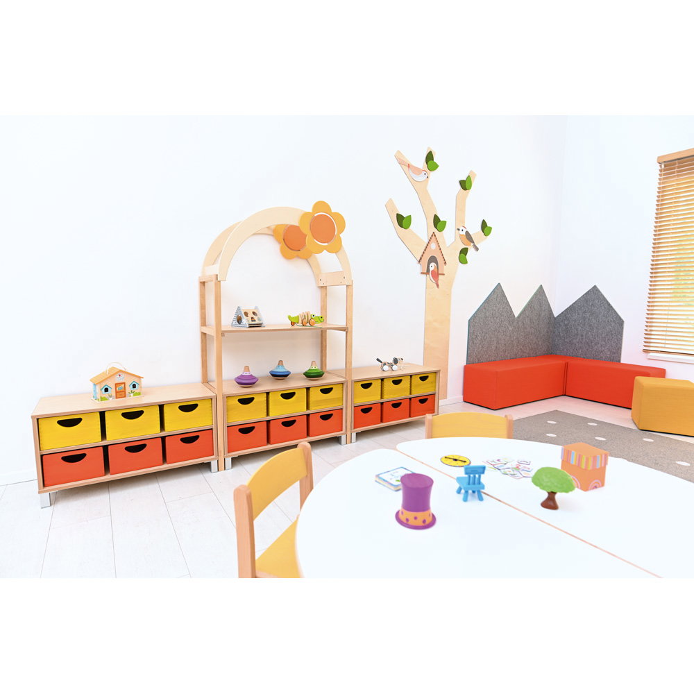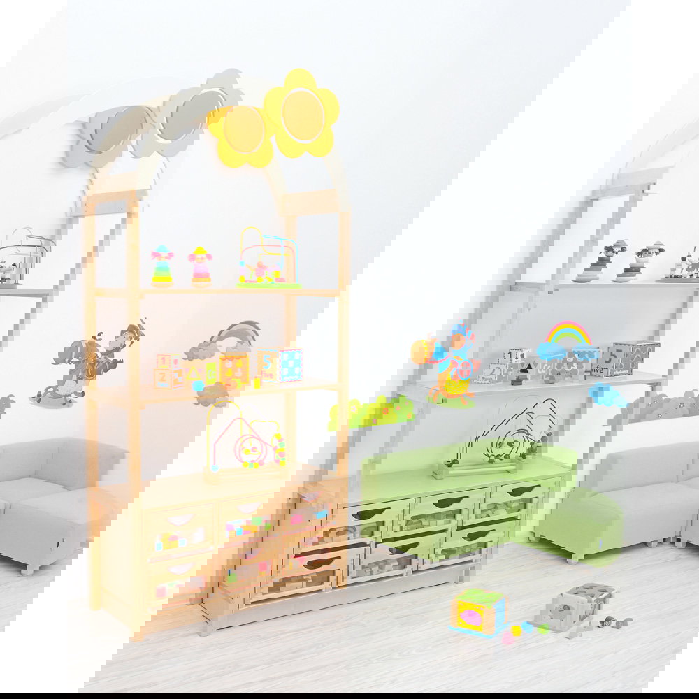 Kinder begreifen ihre Umwelt am besten durch aktives Spielen und Entdecken. In Kindergärten, Horten und Grundschulen ist es daher eine wichtige Aufgabe, Räume so zu gestalten, dass sie die kindliche Kreativität anregen und gleichzeitig den funktionalen Anforderungen des Alltags gerecht werden. Mit dem Aufsatzelement „Flexi Dach, Bogen mit Blume“ verwandeln Sie klassische Aufbewahrungsmöbel im Handumdrehen in inspirierende Spielbereiche. Dieser durchdachte Aufsatz ergänzt die Regale unserer bewährten Flexi-Kollektion perfekt und bringt eine fröhliche, einladende Atmosphäre in jeden Gruppenraum. Aus einem gewöhnlichen Schrank entsteht so ganz leicht ein interaktiver Mittelpunkt für das gemeinsame Spiel.