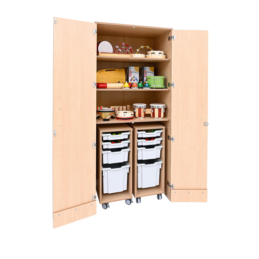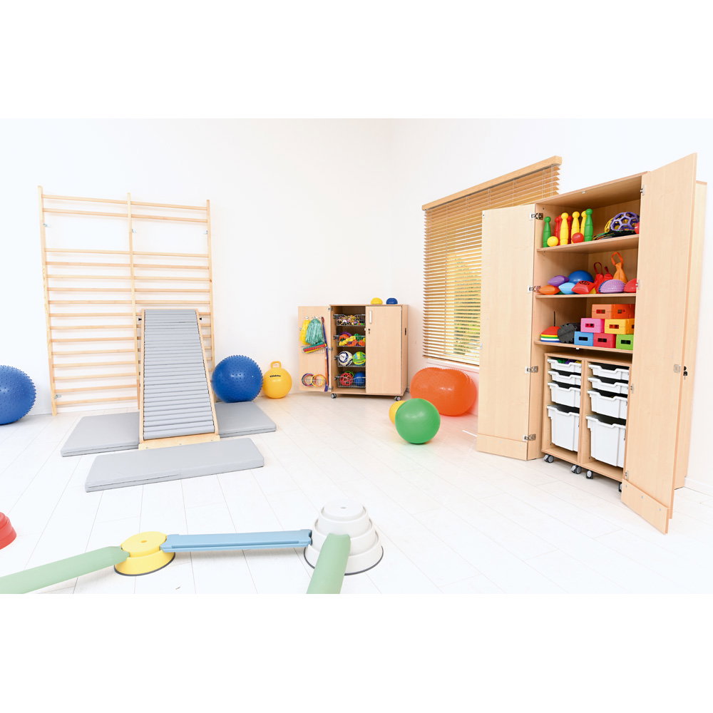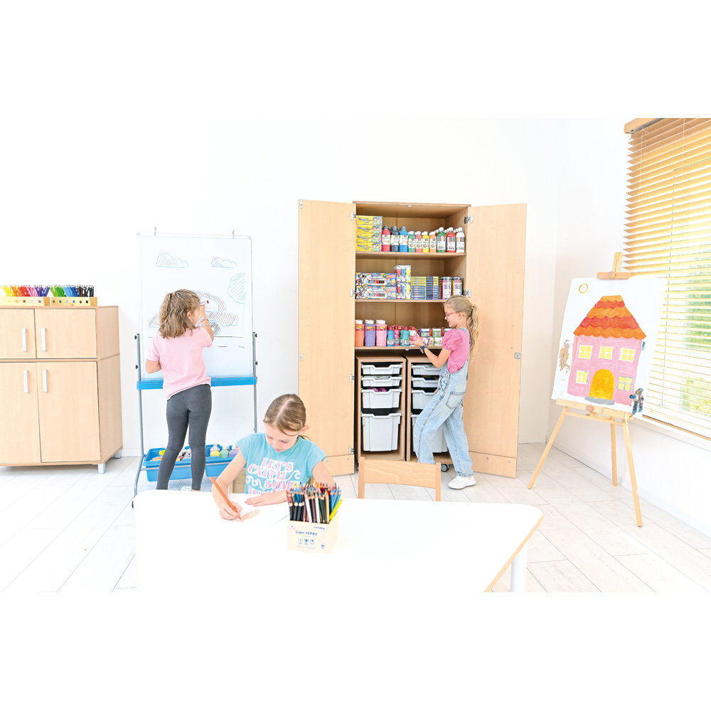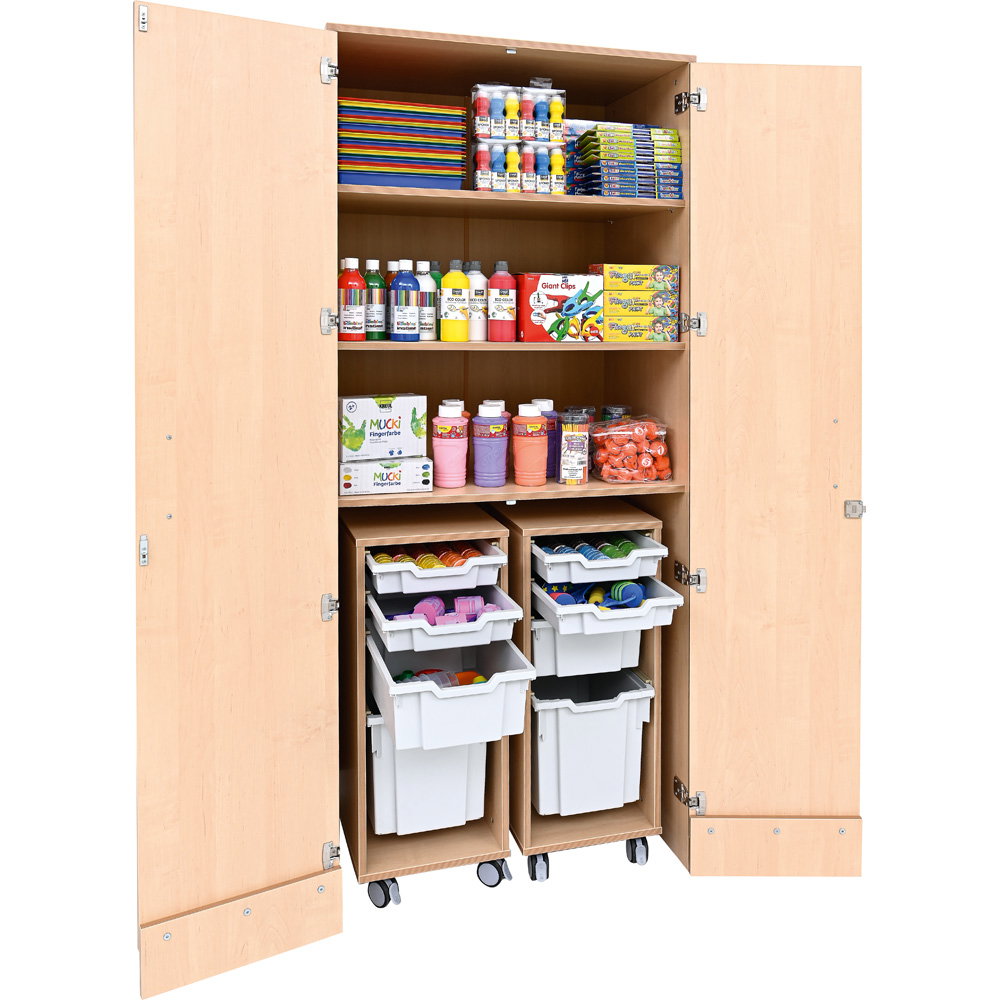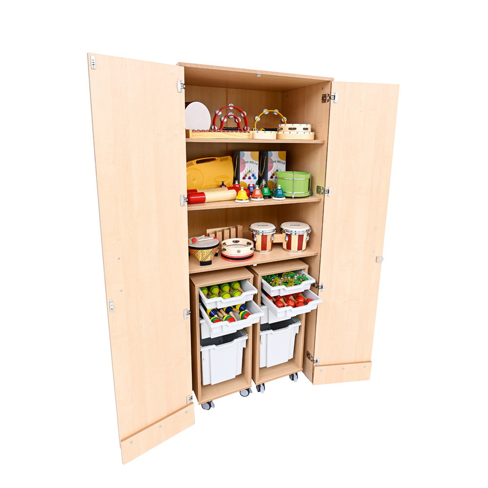 Im Inneren des robusten Hochschranks verbergen sich zwei herausnehmbare Rollregale, die bereits mit acht praktischen Kunststoffbehältern in verschiedenen Größen bestückt sind. Materialien können so thematisch sortiert, mobil zur Verfügung gestellt und nach Gebrauch einfach wieder in die „Garage“ gefahren werden. Im oberen Bereich bieten Fächer Platz für Ordner, während der gesamte Inhalt durch die abschließbaren Türen sicher vor unbefugtem Zugriff geschützt ist.