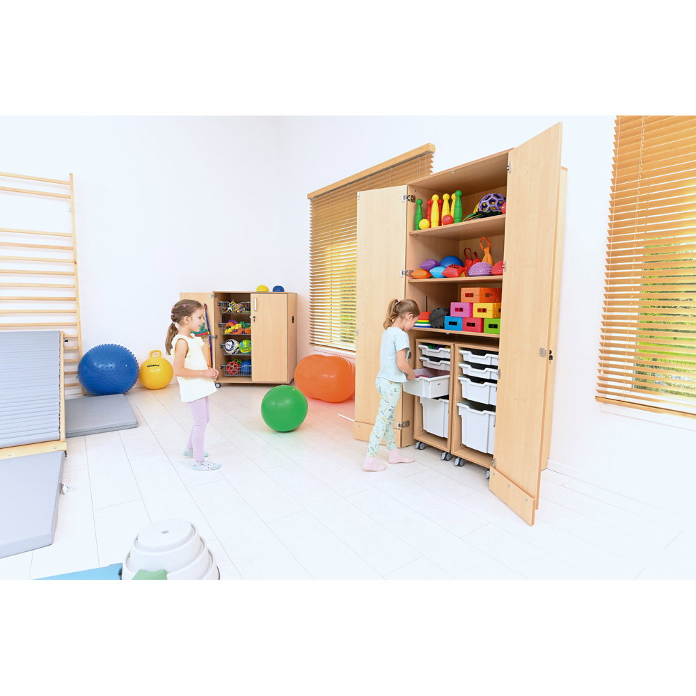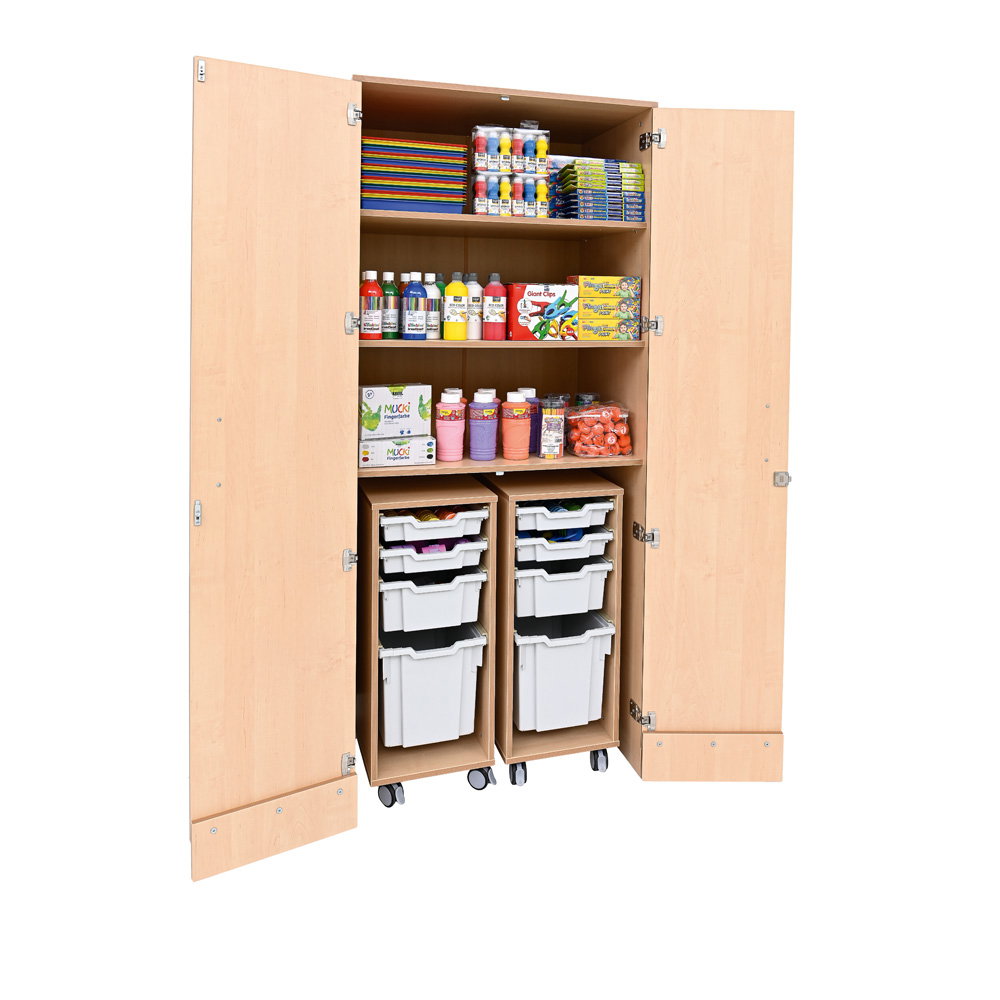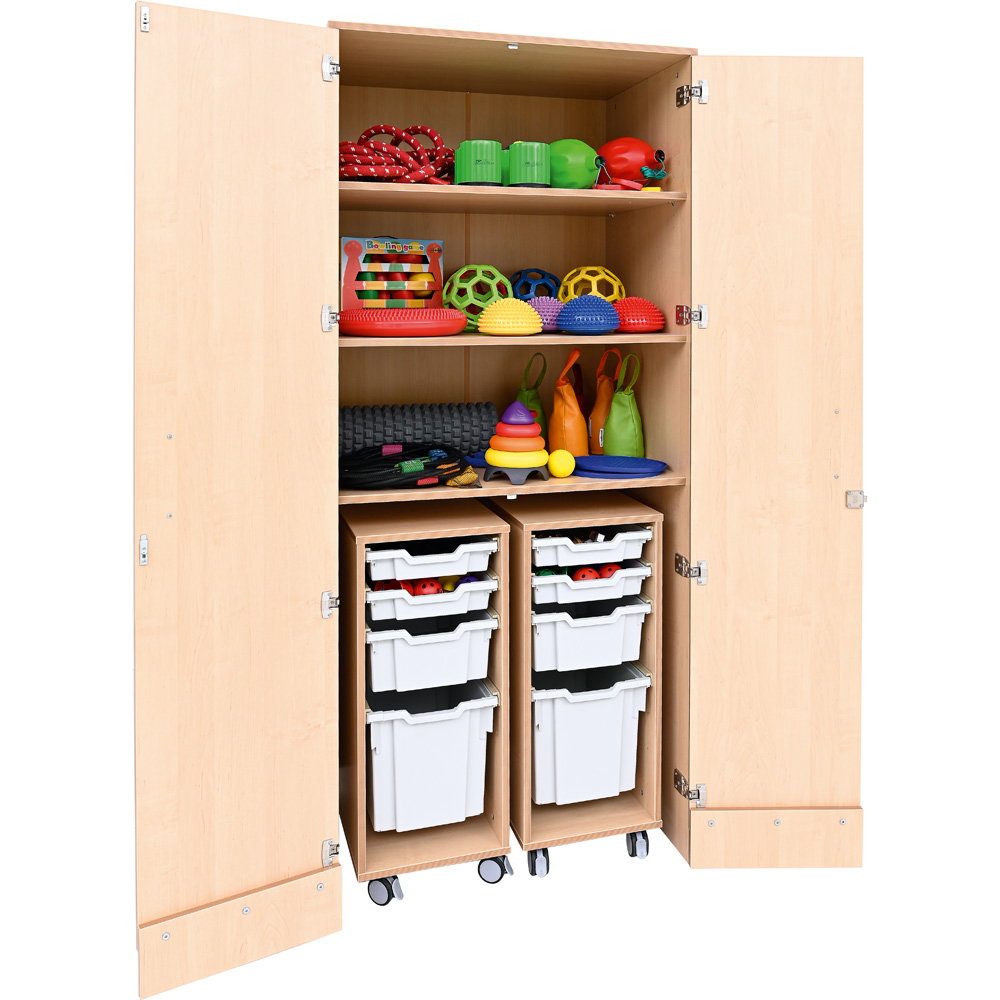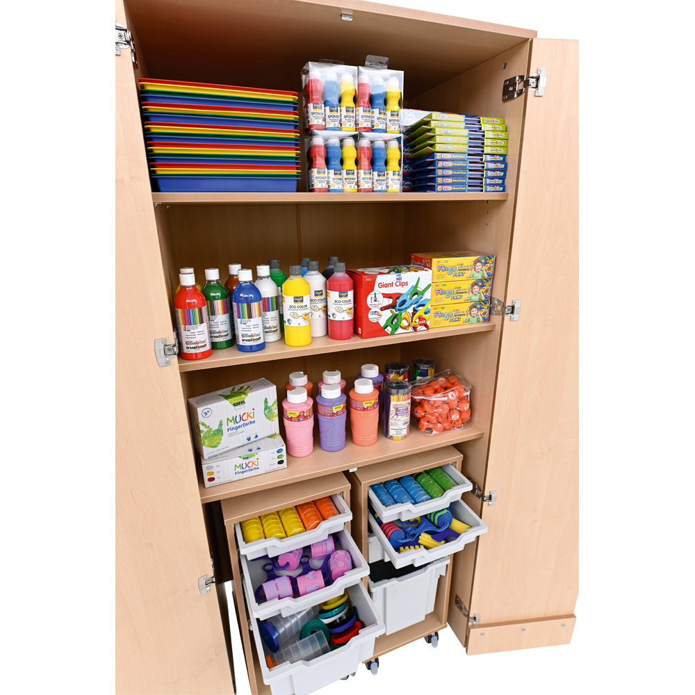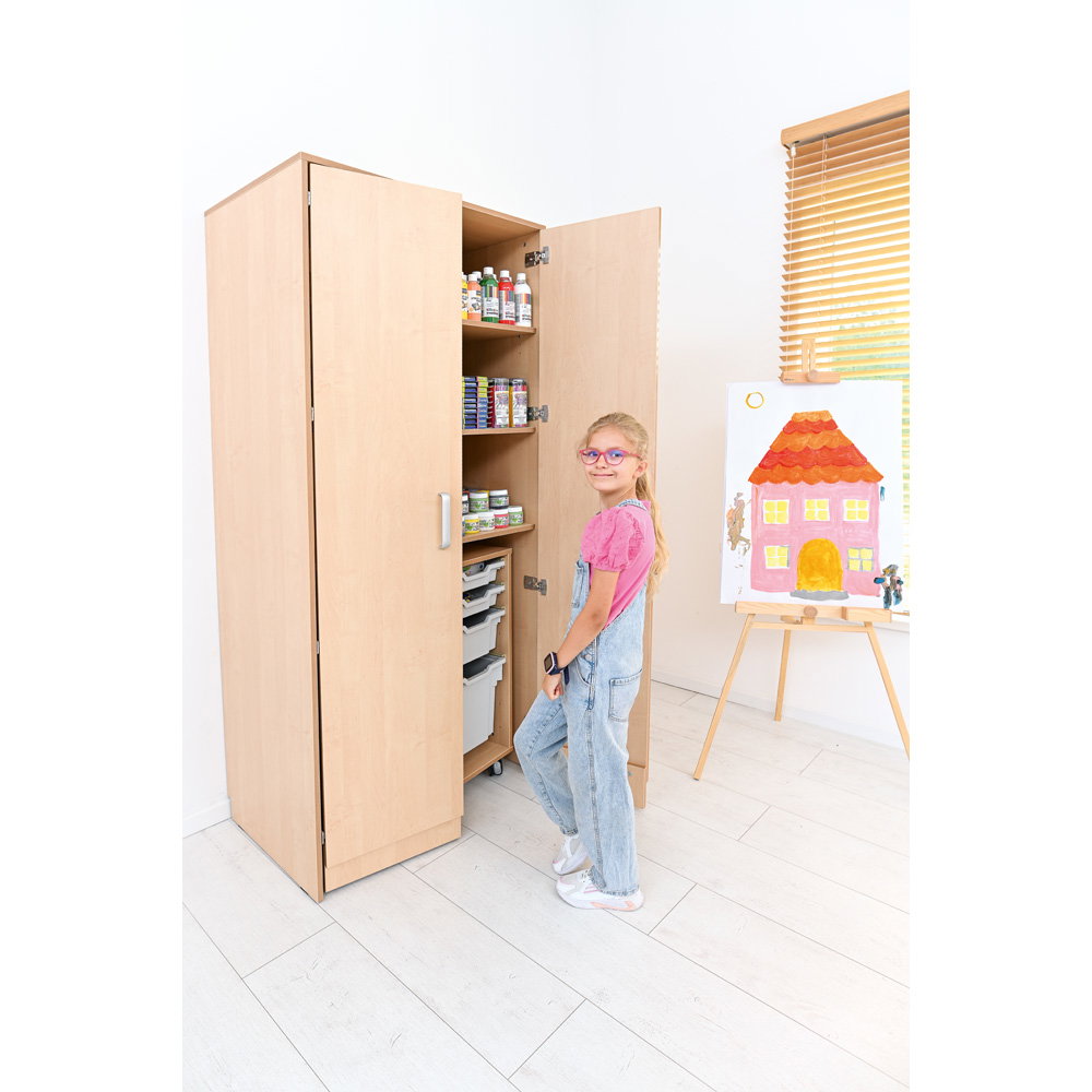 Im Inneren des robusten Hochschranks verbergen sich zwei herausnehmbare Rollregale, die bereits mit acht praktischen Kunststoffbehältern in verschiedenen Größen bestückt sind. Materialien können so thematisch sortiert, mobil zur Verfügung gestellt und nach Gebrauch einfach wieder in die „Garage“ gefahren werden. Im oberen Bereich bieten Fächer Platz für Ordner, während der gesamte Inhalt durch die abschließbaren Türen sicher vor unbefugtem Zugriff geschützt ist.