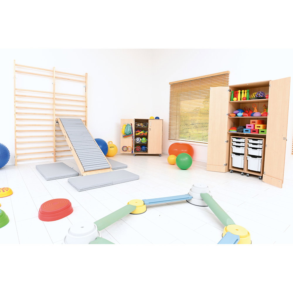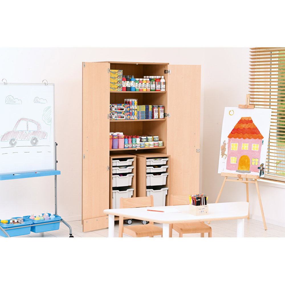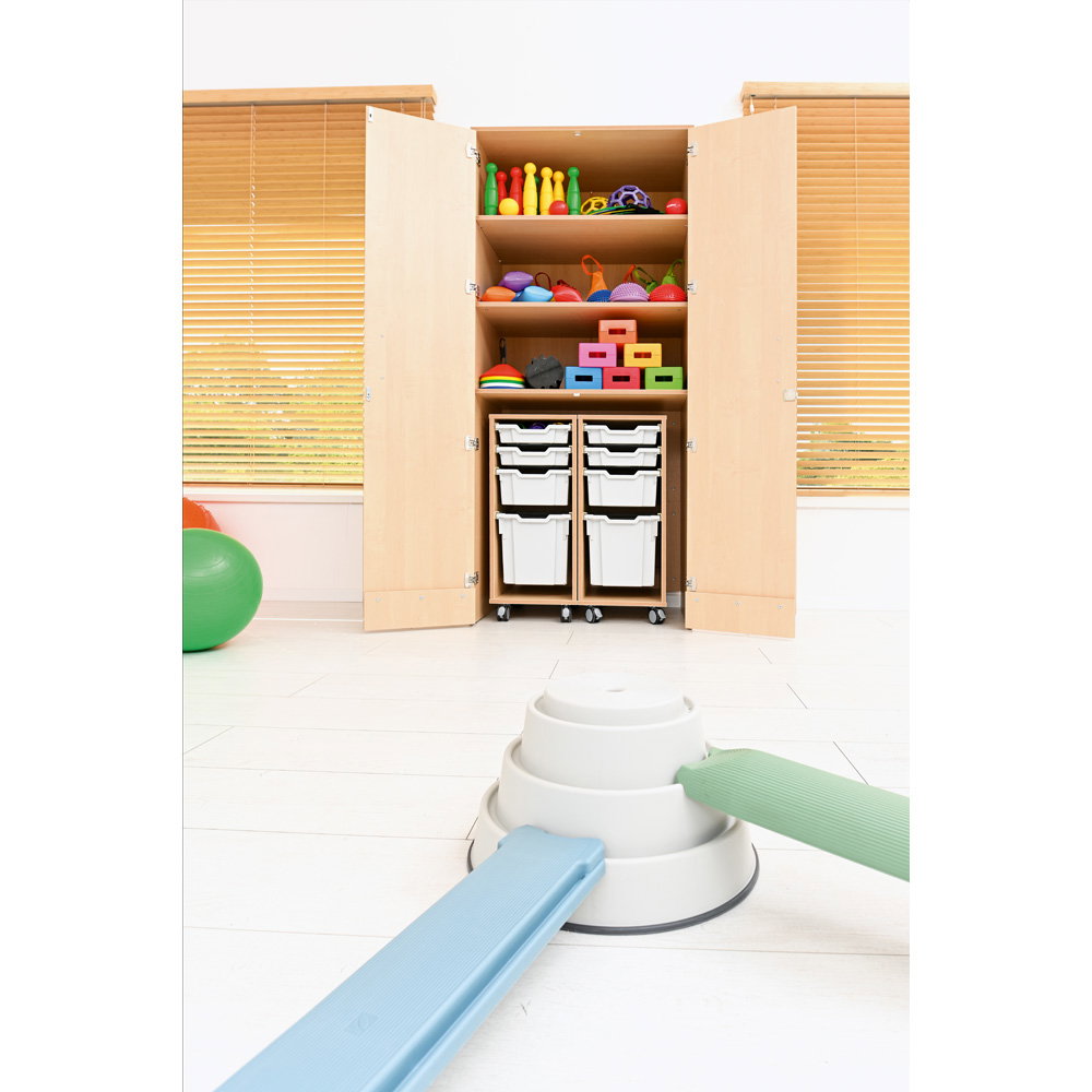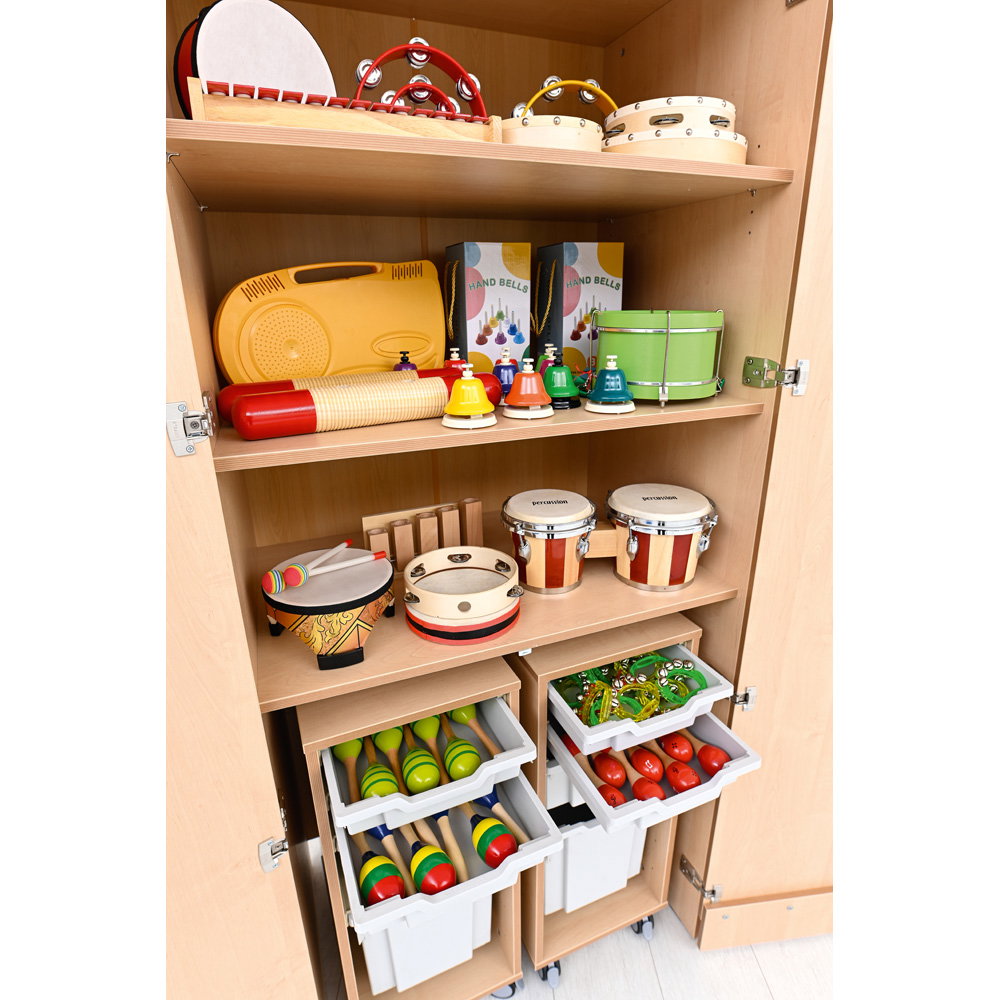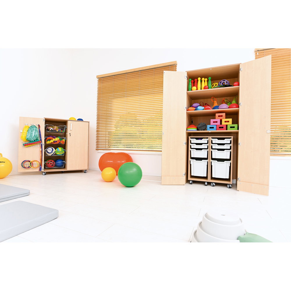 Im Inneren des robusten Hochschranks verbergen sich zwei herausnehmbare Rollregale, die bereits mit acht praktischen Kunststoffbehältern in verschiedenen Größen bestückt sind. Materialien können so thematisch sortiert, mobil zur Verfügung gestellt und nach Gebrauch einfach wieder in die „Garage“ gefahren werden. Im oberen Bereich bieten Fächer Platz für Ordner, während der gesamte Inhalt durch die abschließbaren Türen sicher vor unbefugtem Zugriff geschützt ist.