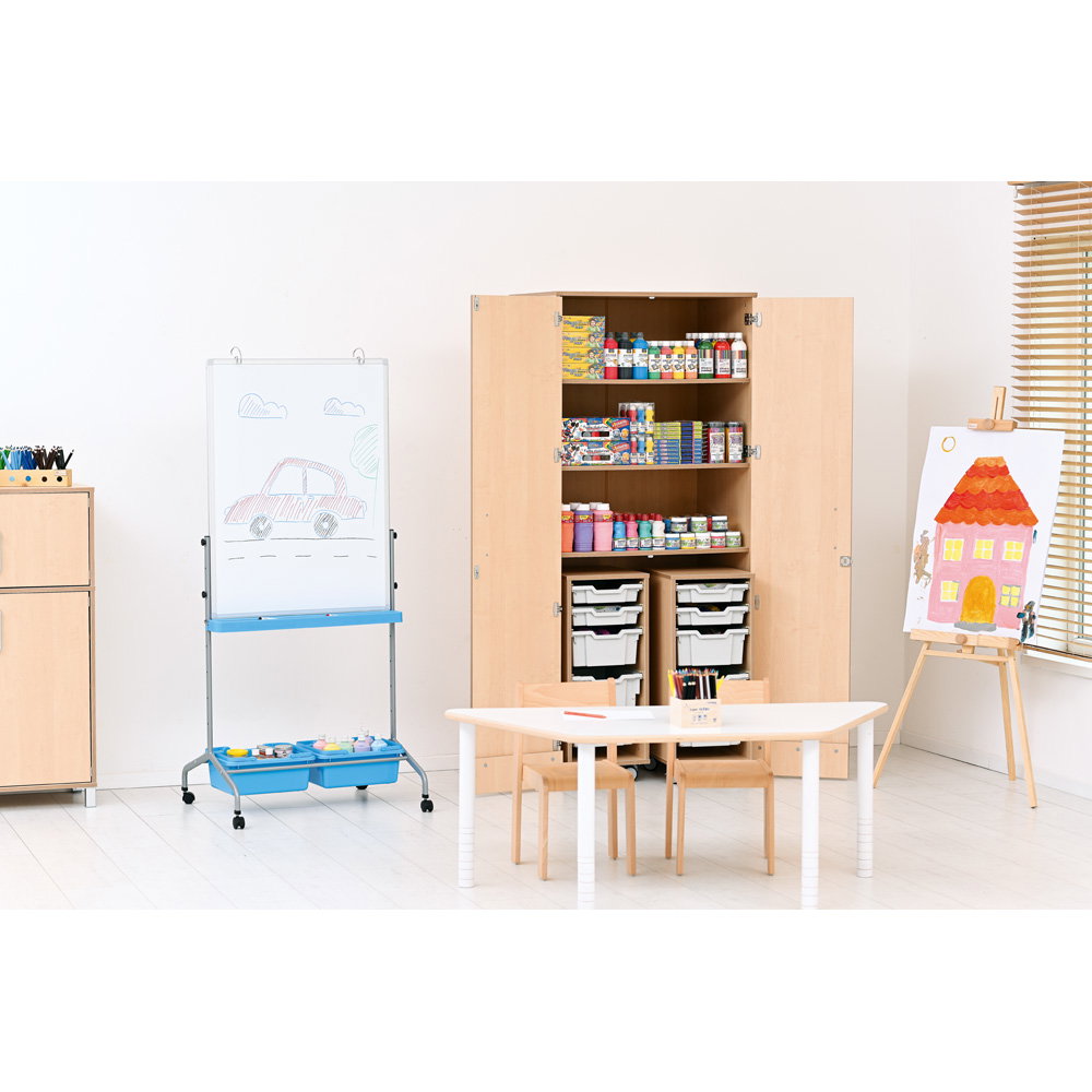 Die beiden integrierten Rollregale sind das Herzstück des Systems. Sie können mühelos aus dem Schrank herausgerollt und direkt dorthin geschoben werden, wo gebastelt, gearbeitet oder gelernt wird. Dies spart Zeit und Aufwand beim Holen und Wegräumen von Materialien und fördert die Selbstständigkeit der Nutzer. - Perfekte Sortierung ab Werk